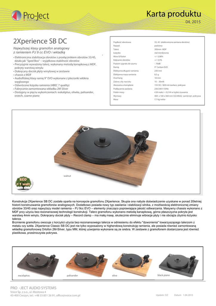 Karta produktu 04. 2015 2Xperience SB DC Najwyższej klasy gramofon analogowy z ramieniem PJ 9 cc EVO i wkladką • Elektroniczna stabilizacja obrotów z przełącznikiem obrotów 33/45, działa jak ''Sped Box'' – wyjątkowa stabilność obrotów • Precyzyjnie wyważony talerz, wykonany metodą kanapkową z MDF, pokryty warstwą winylu • Dokręcany docisk płyty winylowej w zestawie • chassis z MDF • Audiofilskiej klasy ramię 9” EVO wykonane z plecionki włókna węglowego • Odwrócone łożyska ramienia (ABEC 7 quality) • Fabrycznie zamontowana wkładka 2M Silver • Dostępny w pięciu wykończeniach: eukaliptus, oliwka, palisander, orzech, czarne piano , Prędkość obrotowa: 33, 45 (elektroniczna zamiana obrotów) Napęd: paskowy Talerz 300mm MDF Łożysko stal nierdzewna Wow & flutter +/- 0,08% Kołysanie obrotów +/- 0,5% Poziom sygnału do szumu - 70dB Ramię 9” Carbon EVO Efektywna długość ramienia 230 mm Efektywna masa ramienia 8,5 g Overhang 18 mm Zakres siły nacisku 10 - 30mN Akcesoria w komplecie 15V DC / 800 mA zasilacz, pokrywa Podłączenie zasilania 230/240 V 50Hz Pobór mocy 4 W maks/ < 0,5 W w trybie czuwania Wymiary 460 x 160 x 360 mm (SZxWxG) zamknięt. pokrywa Masa 7,7 kg netto walnut Konstrukcja 2Xperience SB DC została oparta na koncepcie gramofonu 2Xperience. Skupia ona nabyte doświadczenie uzyskane w ponad 20letniej historii konstruowania gramofonów analogowych. Dodatkowo posiada nowy typ zasilania i stabilizacji silnika, z możliwością elektronicznej zmiany obrotów 33/45 oraz najwyższy model ramienia – PJ 9cc EVO – elementy znacząco poprawiające jakość odtwarzania. Masywny chassis wykonano z MDF przy użyciu bez-rezonansowej technologii konstrukcji. Talerz gramofonu wykonano metodą kanapkową, górna płaszczyzna pokryta jest warstwą 4mm winylu. Dokręcany docisk płyty – Record clamp – ma małą masę, skutecznie eliminuje wibracje płyty i nie obciąża zbytnio łożysko talerza. Brzmienie gramofonu owocuje z korzyści użycia bez-rezonansowego talerza w odniesieniu do efektu ''dzwonienia'' towarzyszącego talerzom z metalu czy szkła. 2Xperience Classic SB DC jest nie tylko wyposażony w highendową konstrukcję ramienia, ale posiada również zamontowaną wkładkę gramofonową Ortofon 2M-Silver, typu MM, której uzwojenia wykonane są ze srebra. W zestawie z gramofonem dostarczana jest również plastikowa, przeźroczysta pokrywa. eucalyptus palisander olive black piano PRO -JECT AUDIO SYSTEMS Voice Sp. z o.o., ul. Mostowa 4 43-400 Cieszyn, tel.: +48 33 851 26 91, [email protected] Update: DZ Datum 1.04.2015