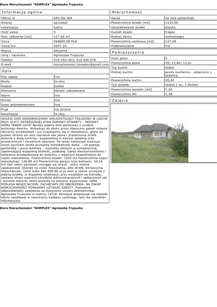 Biuro Nieruchomości "KOMPLEX" Agnieszka Trypucka Informacje ogólne Nieruchomość Oferta nr KPX-DS-304 Garaż na dwa samochody Rodzaj sprzedaż Powierzchnia działki [m2] 1533.00 Lokalizacja Łukta Ukształtowanie działki płaska Ilość pokoi 3 Kształt działki trapez Pow. całkowita [m2] 127.00 m² Rodzaj domu wolnostojący Cena 260000.00 PLN Powierzchnia użytkowa [m2] 127,00 Cena/m2 2047.24 Podpiwniczenie nie Status aktualna Imię i nazwisko Agnieszka Trypucka Telefon 515-293-453; 510 500 078 E-mail [email protected] Opis Pomieszczenia Ilość pokoi 3 Powierzchnia pokoi 39; 12,84; 12,61 Typ kuchni widna Rodzaj kuchni aneks kuchenny - połączony z jadalnią Plac zabaw nie Woda w ulicy Powierzchnia kuchni 20,65 Dojazd asfalt Typ łazienki razem z wc, z oknem Otoczenie działki zabudowane Powierzchnia łazienki [m2] 7,04 Alarm nie Powierzchnia WC 1,48 Winda nie Zdjęcia Drzwi antywłamaniowe nie Prąd na działce Kanalizacja w ulicy OKAZJA DOM JEDNORODZINNY WOLNOSTOJĄCY POŁOŻONY W ŁUKCIE PRZY ULICY OSTRÓDZKIEJ STAN SUROWY OTWARTY - PROJEKT DOMU "BABIE LATO" Bardzo piękny dom parterowy o urodzie polskiego dworku. Wchodząc do domu przez klasyczny ganek mijamy obszerny przedsionek i już znajdujemy się w mieszkaniu, gdzie po prawej stronie od razu zaprasza nas jasna i przestronna strefa dzienna z dużą kuchnią i wyposażoną w wykusz jadalnią oraz przestronnym i foremnym salonem. Po lewej natomiast emanuje swym zaciszem strefa prywatna mieszkańców domu – ich pokoje, garderoba i jasna łazienka – wszystko ułożone w sympatyczną, zapewniającą wzajemną bliskość, podkowę. Garaż dwustanowiskowy i kotłownia przybudowana do budynku z wejściem bezpośrednio do części mieszkalnej. Powierzchnia działki: 1533 m2 Powierzchnia częsci mieszkalnej: 126,80 m2 Powierzchnia garazu oraz kotłowni: 44,15 m 2 nad całym parterem rozciąga się strych , który można zaadoptować również na cześć mieszkalną, albo strefę rekreacyjną mieszkańców. Cena tylko 260 000,00 zł za dom w stanie surowym z piękną działką ,w dogodnej lokalizacji, przy wyjeździe na Ostródę, zarówno blisko ważnych ośrodków administracyjnych i społecznych jak i terenów leśnych, które pozwolą na aktywny wypoczynek. CENA PODLEGA NEGOCJACJOM. ZACHĘCAMY DO OBEJRZENIA. NA ZAKUP NIERUCHOMOŚCI POMAGAMY UZYSKAĆ KREDYT. Pośrednik odpowiedzialny zawodowo za wykonanie umowy pośrednictwa: Agnieszka Trypucka nr licencji 14718. Niniejsza propozycja nie stanowi oferty handlowej w rozumieniu kodeksu cywilnego, lecz ma charakter informacyjny Biuro Nieruchomości "KOMPLEX" Agnieszka Trypucka