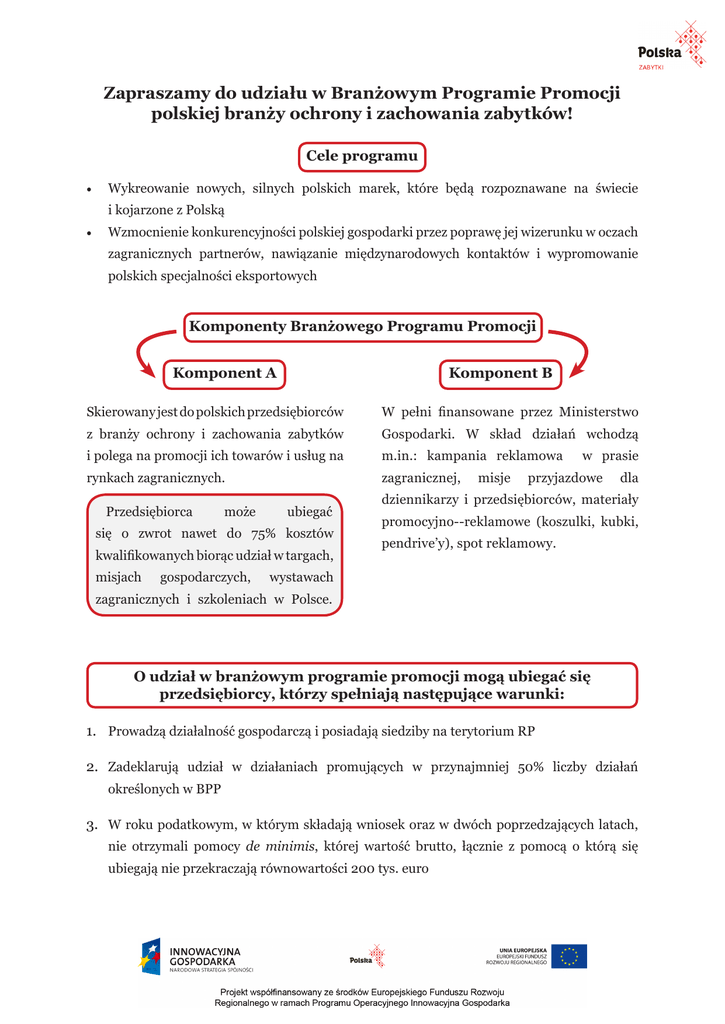 Zapraszamy do udziału w Branżowym Programie Promocji polskiej branży ochrony i zachowania zabytków! Cele programu • Wykreowanie nowych, silnych polskich marek, które będą rozpoznawane na świecie i kojarzone z Polską • Wzmocnienie konkurencyjności polskiej gospodarki przez poprawę jej wizerunku w oczach zagranicznych partnerów, nawiązanie międzynarodowych kontaktów i wypromowanie polskich specjalności eksportowych Komponenty Branżowego Programu Promocji Komponent A Komponent B Skierowany jest do polskich przedsiębiorców W pełni finansowane przez Ministerstwo z branży ochrony i zachowania zabytków Gospodarki. W skład działań wchodzą i polega na promocji ich towarów i usług na m.in.: kampania reklamowa rynkach zagranicznych. zagranicznej, Przedsiębiorca może ubiegać się o zwrot nawet do 75% kosztów kwalifikowanych biorąc udział w targach, misjach gospodarczych, misje w prasie przyjazdowe dla dziennikarzy i przedsiębiorców, materiały promocyjno--reklamowe (koszulki, kubki, pendrive’y), spot reklamowy. wystawach zagranicznych i szkoleniach w Polsce. O udział w branżowym programie promocji mogą ubiegać się przedsiębiorcy, którzy spełniają następujące warunki: 1. Prowadzą działalność gospodarczą i posiadają siedziby na terytorium RP 2. Zadeklarują udział w działaniach promujących w przynajmniej 50% liczby działań określonych w BPP 3. W roku podatkowym, w którym składają wniosek oraz w dwóch poprzedzających latach, nie otrzymali pomocy de minimis, której wartość brutto, łącznie z pomocą o którą się ubiegają nie przekraczają równowartości 200 tys. euro Harmonogram Komponent A Rok 2012 L.p. Działanie promujące Miejsce Termin Targi zagraniczne 1 Denkmal Lipsk, Niemcy listopad Targi krajowe 2 Konserwacje Toruń, Polska październik Prezentacja/wystawa 3 Libia październik* Seminarium 5 Świadczenie usług na rynkach objętych programem promocji listopad Misje gospodarcze 6 Libia październik* 7 Rosja październik* 8 Niemcy listopad Materiały promocyjne 10 długopisy z logo firmy, breloczki z logo firmy, smycze reklamowe z logo firmy, kubki z logo firmy *termin może ulec zmianie Harmonogram na cały program można znaleźć na stronie www.renovation-monuments.pl grudzień Zapraszamy na stronę internetową programu www.renovation-monuments.pl Znajdą Państwo na niej wszelkie niezbędne informacje na temat Branżowego Programu Promocji, pliki do pobrania, aktualności, wydarzenia i inne bieżące dane dotyczące projektu. Wszelkich informacji dotyczących udziału w programie udzielają: Aleksandra Oniszk, koordynator projektu Natalia Sikorska, asystentka projektu Telefon: (22) 818 00 23, 883 213 573 E-mail: [email protected] Informacji w sprawie warunków i trybu udzielania pomocy finansowej udziela Departament Wdrażania Programów Operacyjnych Ministerstwa Gospodarki Telefon: (22) 693-58-44 Projekt realizowany jest przez Ministerstwo Gospodarki do 31 marca 2015 roku a jego generalnym wykonawcą jest Agencja M Promotion. Agencja M Promotion zapewnia kompleksową organizację działań promujących i nie pobiera z tego tytułu żadnych opłat i prowizji od przedsiębiorców. Agencja M Promotion powstała w 1996 roku. Jej siłą jest doświadczenie związane z tak długą obecnością na rynku, profesjonalizm poparty pracą zgranego zespołu specjalistów oraz wysoka doza ambitnej kreatywności. Agencja realizuje projekty zarówno komercyjne (Finlandia, Pall Mall, Wyborowa) jak i rządowe i samorządowe, organizuje również obecność klientów na targach i imprezach branżowych. W ofercie agencji znajdują się kampanie medialne w Polsce i za granicą, kampanie internetowe, akcje ambientowo-outdoorowe i kompleksowe opracowania strategii rozwoju marki. Podczas trwania EURO 2012 pełniła rolę ambasadorów UEFA w strefach VIP dbając o poprawną organizację całego przedsięwzięcia. Agencję tworzy zgrany zespół specjalistów wielu branż marketingu, a jej siłą jest trafny dobór narzędzi marketingowych pozwalających na optymalne wykorzystanie różnorodnych kanałów dotarcia do klienta. Kontakt: tel. (22) 818 00 23 www.agencjapromocji.pl