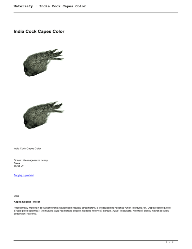 Materia?y : India Cock Capes Color India Cock Capes Color India Cock Capes Color Ocena: Nie ma jeszcze oceny Cena 19,59 z? Zapytaj o produkt Opis Kapka Koguta - Kolor Podstawowy materia? do wykonywania wszelkiego rodzaju streamerów, a w szczególno?ci ich je?ynek i skrzyde?ek. Odpowiednio g?ste i d?ugie pióra sprawiaj?, ?e muszka wygl?da bardzo bogato. Nadane kolory s? bardzo „?ywe” i soczyste. Nie trac? blasku nawet po wielu godzinach ?owienia. 1 / 2 Materia?y : India Cock Capes Color Black Blue Gray Orange Red Yellow Opinie Nikt jeszcze nie recenzowa? tego produktu. 2 / 2 Powered by TCPDF (www.tcpdf.org)