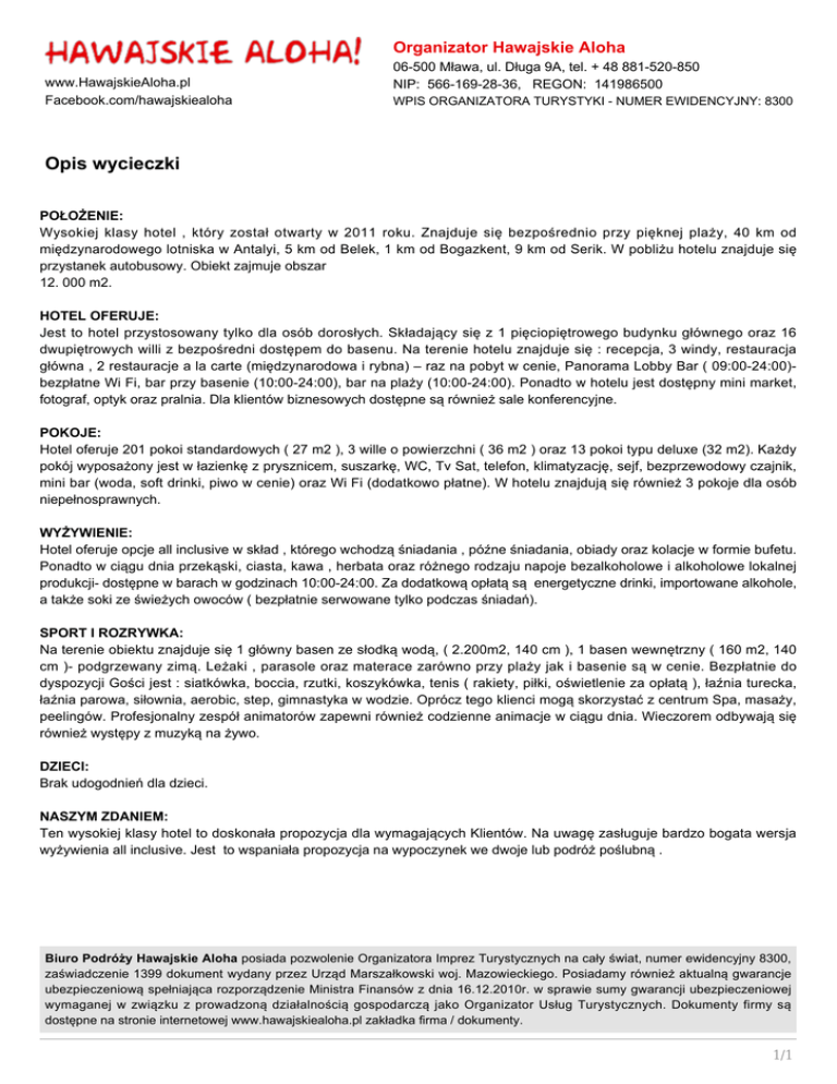 Organizator Hawajskie Aloha www.HawajskieAloha.pl Facebook.com/hawajskiealoha 06-500 Mława, ul. Długa 9A, tel. + 48 881-520-850 NIP: 566-169-28-36, REGON: 141986500 WPIS ORGANIZATORA TURYSTYKI - NUMER EWIDENCYJNY: 8300 Opis wycieczki POŁOŻENIE: Wysokiej klasy hotel , który został otwarty w 2011 roku. Znajduje się bezpośrednio przy pięknej plaży, 40 km od międzynarodowego lotniska w Antalyi, 5 km od Belek, 1 km od Bogazkent, 9 km od Serik. W pobliżu hotelu znajduje się przystanek autobusowy. Obiekt zajmuje obszar 12. 000 m2. HOTEL OFERUJE: Jest to hotel przystosowany tylko dla osób dorosłych. Składający się z 1 pięciopiętrowego budynku głównego oraz 16 dwupiętrowych willi z bezpośredni dostępem do basenu. Na terenie hotelu znajduje się : recepcja, 3 windy, restauracja główna , 2 restauracje a la carte (międzynarodowa i rybna) – raz na pobyt w cenie, Panorama Lobby Bar ( 09:00-24:00)bezpłatne Wi Fi, bar przy basenie (10:00-24:00), bar na plaży (10:00-24:00). Ponadto w hotelu jest dostępny mini market, fotograf, optyk oraz pralnia. Dla klientów biznesowych dostępne są również sale konferencyjne. POKOJE: Hotel oferuje 201 pokoi standardowych ( 27 m2 ), 3 wille o powierzchni ( 36 m2 ) oraz 13 pokoi typu deluxe (32 m2). Każdy pokój wyposażony jest w łazienkę z prysznicem, suszarkę, WC, Tv Sat, telefon, klimatyzację, sejf, bezprzewodowy czajnik, mini bar (woda, soft drinki, piwo w cenie) oraz Wi Fi (dodatkowo płatne). W hotelu znajdują się również 3 pokoje dla osób niepełnosprawnych. WYŻYWIENIE: Hotel oferuje opcje all inclusive w skład , którego wchodzą śniadania , późne śniadania, obiady oraz kolacje w formie bufetu. Ponadto w ciągu dnia przekąski, ciasta, kawa , herbata oraz różnego rodzaju napoje bezalkoholowe i alkoholowe lokalnej produkcji- dostępne w barach w godzinach 10:00-24:00. Za dodatkową opłatą są energetyczne drinki, importowane alkohole, a także soki ze świeżych owoców ( bezpłatnie serwowane tylko podczas śniadań). SPORT I ROZRYWKA: Na terenie obiektu znajduje się 1 główny basen ze słodką wodą, ( 2.200m2, 140 cm ), 1 basen wewnętrzny ( 160 m2, 140 cm )- podgrzewany zimą. Leżaki , parasole oraz materace zarówno przy plaży jak i basenie są w cenie. Bezpłatnie do dyspozycji Gości jest : siatkówka, boccia, rzutki, koszykówka, tenis ( rakiety, piłki, oświetlenie za opłatą ), łaźnia turecka, łaźnia parowa, siłownia, aerobic, step, gimnastyka w wodzie. Oprócz tego klienci mogą skorzystać z centrum Spa, masaży, peelingów. Profesjonalny zespół animatorów zapewni również codzienne animacje w ciągu dnia. Wieczorem odbywają się również występy z muzyką na żywo. DZIECI: Brak udogodnień dla dzieci. NASZYM ZDANIEM: Ten wysokiej klasy hotel to doskonała propozycja dla wymagających Klientów. Na uwagę zasługuje bardzo bogata wersja wyżywienia all inclusive. Jest to wspaniała propozycja na wypoczynek we dwoje lub podróż poślubną . Biuro Podróży Hawajskie Aloha posiada pozwolenie Organizatora Imprez Turystycznych na cały świat, numer ewidencyjny 8300, zaświadczenie 1399 dokument wydany przez Urząd Marszałkowski woj. Mazowieckiego. Posiadamy również aktualną gwarancje ubezpieczeniową spełniająca rozporządzenie Ministra Finansów z dnia 16.12.2010r. w sprawie sumy gwarancji ubezpieczeniowej wymaganej w związku z prowadzoną działalnością gospodarczą jako Organizator Usług Turystycznych. Dokumenty firmy są dostępne na stronie internetowej www.hawajskiealoha.pl zakładka firma / dokumenty. 1/1