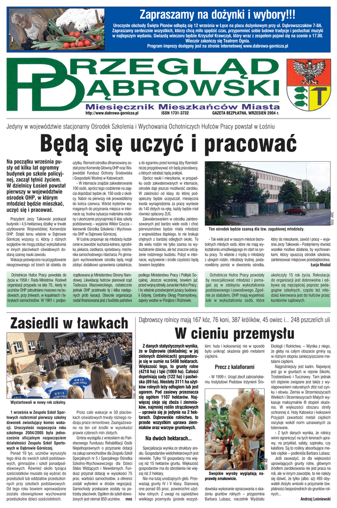 Zapraszamy na do˝ynki i wybory!!! Uroczyste obchody Âwi´ta Plonów odb´dà si´ 12 wrzeÊnia w ¸´ce na placu do˝ynkowym przy ul. Dàbrowszczaków 7-8A. Zapraszamy serdecznie wszystkich, którzy chcà mi∏o sp´dziç czas, przypomnieç sobie ludowe tradycje i pos∏uchaç muzyki w najlepszym wydaniu. Gwiazdà wieczoru b´dzie Krzysztof Krawczyk, który wraz z zespo∏em pojawi si´ na scenie o 17.00. Wieczór zakoƒczy si´ Teatrem Ognia. Program imprezy dost´pny jest na stronie internetowej www.dabrowa-gornicza.pl http://www.dabrowa-gornicza.pl ISSN 1731-3732 GAZETA BEZP¸ATNA, WRZESIE¡ 2004 r. Jedyny w województwie stacjonarny OÊrodek Szkolenia i Wychowania Ochotniczych Hufców Pracy powsta∏ w ¸oÊniu B´dà si´ uczyç i pracowaç Na poczàtku wrzeÊnia pusty od kilku lat ogromny budynek po szkole policyjnej, zaczà∏ t´tniç ˝yciem. W dzielnicy ¸osieƒ powsta∏ pierwszy w województwie oÊrodek OHP, w którym m∏odzie˝ b´dzie mieszkaç, uczyç si´ i pracowaç. a do egzaminu przed komisjà Izby RzemieÊlniczej przygotowywaç ich b´dà pracodawcy, u których odrabiaç b´dà praktyki. Oprócz nauki i mieszkania, w przypadku osób zakwaterowanych w internacie, oÊrodek daje jeszcze mo˝liwoÊç zarobku. W zale˝noÊci od klasy do której podopieczny b´dzie ucz´szcza∏, miesi´czna kwota wynagrodzenia za prac´ wyniesie do 140 z∏otych na r´k´, ka˝dy b´dzie mia∏ równie˝ op∏acony ZUS. Zakwaterowaniem w oÊrodku zainteresowanych jest bardzo wiele osób i choç pierwszeƒstwo b´dzie mia∏a m∏odzie˝ z województwa Êlàskiego, to nie brakuje ch´tnych z bardziej odleg∏ych okolic. To dla wielu rodzin nie tylko szansa na wykszta∏cenie dziecka, ale te˝ znaczne odcià˝enie rodzinnego bud˝etu. Pobyt w internacie, wy˝ywienie i Êrodki czystoÊci b´dà bowiem bezp∏atne. - Tak wiele jest w naszym mieÊcie bezrobotnych m∏odych osób, które nie majà wykszta∏cenia umo˝liwiajàcego im start na rynku pracy. To w∏aÊnie z myÊlà o m∏odzie˝y z ubogich rodzin, m∏odzie˝y trudnej, postanowiliÊmy pomóc w stworzeniu oÊrodka, który da mieszkanie, zawód i prac´ – wyjaÊnia Jerzy Talkowski – Podejmiemy równie˝ wszelkie mo˝liwe dzia∏ania, by wychowankami, którzy opuszczà oÊrodek szkolenia, zainteresowaç miejscowe przedsi´biorstwa. ¸ucja Moskal Ochotnicze Hufce Pracy powo∏a∏a do ˝ycia w 1958 r. Rada Ministrów. Rozkwit organizacji przypada na lata 70., kiedy to uczniów OHP zatrudniano masowo na budowach, przy ˝niwach, w kopalniach i fabrykach samochodów. W 1981 r. podpo- rzàdkowano je Ministerstwu Obrony Narodowej. Likwidacj´ hufców planowa∏ rzàd Tadeusza Mazowieckiego, ostatecznie jednak OHP przetrwa∏o t´ i kilka nast´pnych prób kasacji. Obecnie organizacja nadal finansowana jest z bud˝etu paƒstwa podlega Ministerstwu Pracy i Polityki Socjalnej. Jeszcze wczeÊniej, bowiem ju˝ przed wojnà istnia∏y Junackie Hufce Pracy. I to w∏aÊnie przedwojenni junacy budowali Gdyni´, Centralny Okr´g Przemys∏owy, zapory wodne w Poràbce i Ro˝nowie. Ochotnicze Hufce Pracy powsta∏y by resocjalizowaç m∏odzie˝ i pomagaç jej w zdobyciu wykszta∏cenia podstawowego i zawodowego. Zgodnie ze statutem, OHP majà wype∏niaç luki w wykszta∏ceniu osób, które ukoƒczy∏y 15 rok ˝ycia. Rekrutacja do organizacji jest dobrowolna i odbywa si´ najcz´Êciej poprzez pedagogów szkolnych, cz´sto te˝ m∏odzie˝ kierowana jest do hufców przez kuratorów sàdowych. Zasiedli w ∏awkach W cieniu przemys∏u Przez ca∏e wakacje w 30 placówkach oÊwiatowych trwa∏y ró˝nego rodzaju prace remontowe. Zaanga˝owano na ten cel Êrodki w wysokoÊci prawie czterech mln z∏otych. Gmina wystàpi∏a z wnioskiem do Paƒstwowego Funduszu Rehabilitacji Osób Niepe∏noprawnych o przyznanie dotacji na zakup samochodów dla Zespo∏u Szkó∏ Specjalnych nr 5 i Specjalnego OÊrodka Szkolno-Wychowawczego dla Dzieci S∏abo Widzàcych i Niewidomych. Fundusz przyzna∏ dotacj´ w wysokoÊci 75 proc. wartoÊci samochodów, a oferenci zostali wy∏onieni w drodze negocjacji. Samochody przekazane zosta∏y na potrzeby placówek. Ogó∏em do szkó∏ dowo˝onych jest niemal 850 uczniów. mos Z danych statystycznych wynika, ˝e w Dàbrowie (dok∏adniej: w jej zielonych dzielnicach) gospodaruje si´ w sumie na 5498 hektarach. Wi´kszoÊç tego, to grunty rolne (4218 ha) i ∏àki (1069 ha). Ca∏oÊci dope∏niajà sady (122 ha) i pastwiska (89 ha). Niestety 3111 ha u˝ytków rolnych le˝y od∏ogiem lub jest ugorem. Pod zasiewy przeznacza si´ ogó∏em 1107 hektarów. Najwi´cej sieje si´ zbo˝a i ziemniaków, najmniej roÊlin stràczkowych – uprawia si´ je jedynie na 2 hektarach. Dàbrowskie rolnictwo, to przede wszystkim uprawa ziemniaków oraz warzyw gruntowych. kim: huta i koksownia) nie w sposób by∏o uniknàç ska˝enia gleb metalami ci´˝kimi. Precz z kalafiorami - W 1999 r. Urzàd zleci∏ zabrzaƒskiemu Instytutowi Podstaw In˝ynierii Âro- Na dwóch hektarach... Specjalizacja wynika ze struktury area∏u. Gospodarstw wielohektarowych jest niewiele. Tylko 10 gospodarzy ma wi´cej ni˝ 15 hektarów gruntu. Wi´kszoÊç gospodarstw ma do obrobienia nie wi´cej ni˝ 2 hektary. Nie ma tutaj urodzajnych gleb. Przewa˝ajà grunty IV i V klasy. Stanowià one ponad 85 proc. powierzchni u˝ytków rolnych. Z uwagi na sàsiedztwo wielkiego przemys∏u (przede wszyst- foto: AB 1 wrzeÊnia w Zespole Szkó∏ Sportowych rozbrzmia∏ pierwszy szkolny dzwonek zwiastujàcy koniec wakacji. UroczystoÊç rozpocz´cia roku szkolnego 2004/2005 by∏a jednoczeÊnie oficjalnym rozpocz´ciem dzia∏alnoÊci Zespo∏u Szkó∏ Sportowych w Dàbrowie Górniczej. Ponad 19 tys. uczniów wyruszy∏o tego dnia do swoich szkó∏ podstawowych, gimnazjów i szkó∏ ponadpodstawowych. Równie˝ oko∏o tysiàca szeÊciolatków musia∏o si´ wybraç do przedszkoli lub oddzia∏ów przedszkolnych przy szko∏ach podstawowych. Od tego roku bowiem 