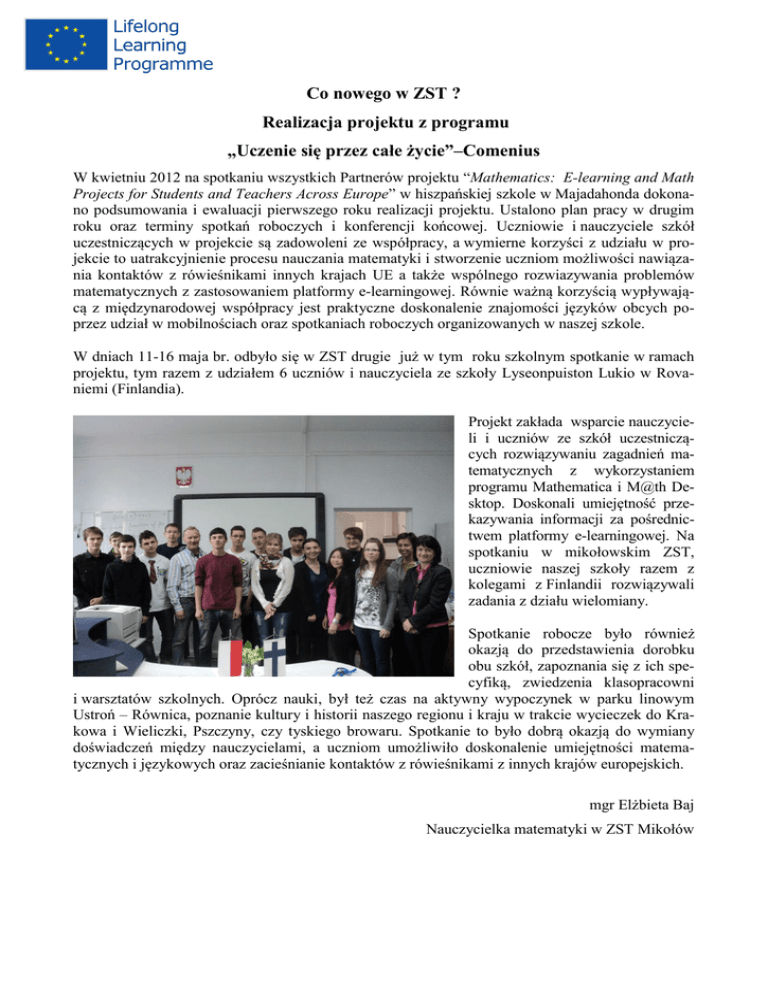 Co nowego w ZST ? Realizacja projektu z programu „Uczenie się przez całe życie”–Comenius W kwietniu 2012 na spotkaniu wszystkich Partnerów projektu “Mathematics: E-learning and Math Projects for Students and Teachers Across Europe” w hiszpańskiej szkole w Majadahonda dokonano podsumowania i ewaluacji pierwszego roku realizacji projektu. Ustalono plan pracy w drugim roku oraz terminy spotkań roboczych i konferencji końcowej. Uczniowie i nauczyciele szkół uczestniczących w projekcie są zadowoleni ze współpracy, a wymierne korzyści z udziału w projekcie to uatrakcyjnienie procesu nauczania matematyki i stworzenie uczniom możliwości nawiązania kontaktów z rówieśnikami innych krajach UE a także wspólnego rozwiazywania problemów matematycznych z zastosowaniem platformy e-learningowej. Równie ważną korzyścią wypływającą z międzynarodowej współpracy jest praktyczne doskonalenie znajomości języków obcych poprzez udział w mobilnościach oraz spotkaniach roboczych organizowanych w naszej szkole. W dniach 11-16 maja br. odbyło się w ZST drugie już w tym roku szkolnym spotkanie w ramach projektu, tym razem z udziałem 6 uczniów i nauczyciela ze szkoły Lyseonpuiston Lukio w Rovaniemi (Finlandia). Projekt zakłada wsparcie nauczycieli i uczniów ze szkół uczestniczących rozwiązywaniu zagadnień matematycznych z wykorzystaniem programu Mathematica i M@th Desktop. Doskonali umiejętność przekazywania informacji za pośrednictwem platformy e-learningowej. Na spotkaniu w mikołowskim ZST, uczniowie naszej szkoły razem z kolegami z Finlandii rozwiązywali zadania z działu wielomiany. Spotkanie robocze było również okazją do przedstawienia dorobku obu szkół, zapoznania się z ich specyfiką, zwiedzenia klasopracowni i warsztatów szkolnych. Oprócz nauki, był też czas na aktywny wypoczynek w parku linowym Ustroń – Równica, poznanie kultury i historii naszego regionu i kraju w trakcie wycieczek do Krakowa i Wieliczki, Pszczyny, czy tyskiego browaru. Spotkanie to było dobrą okazją do wymiany doświadczeń między nauczycielami, a uczniom umożliwiło doskonalenie umiejętności matematycznych i językowych oraz zacieśnianie kontaktów z rówieśnikami z innych krajów europejskich. mgr Elżbieta Baj Nauczycielka matematyki w ZST Mikołów