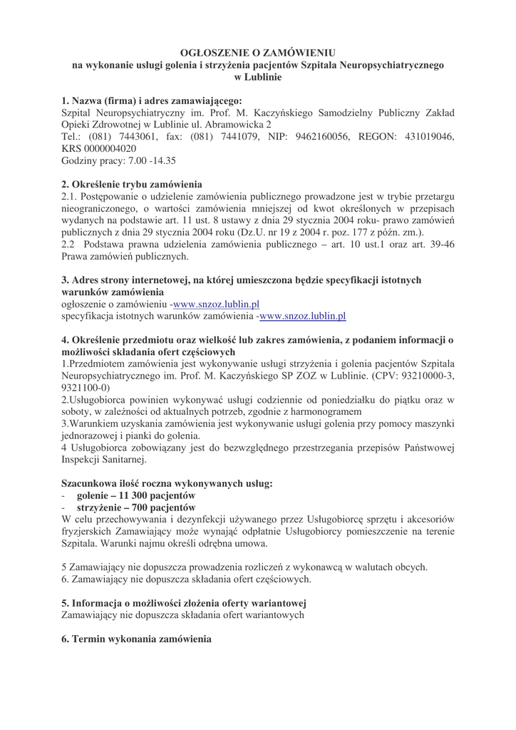 !" # w Lublinie %& '( ) * + ) ",! !$ ! - Opieki Zdrowotnej w Lublinie ul. Abramowicka 2 Tel.: (081) 7443061, fax: (081) 7441079, NIP: 9462160056, REGON: 431019046, KRS 0000004020 Godziny pracy: 7.00 -14.35 .& / 0 )# ! " # $# # % # trybie przetargu nieograniczonego, # & $# % % # & # wydanych na podstawie art. 11 ust. 8 ustawy z dnia 29 stycznia 2004 roku# $# publicznych z dnia 29 stycznia 2004 roku (Dz.U. nr 19 z 2004 r. poz !'' $( ) 2.2 Podstawa prawna udzielenia zamówienia publicznego – art. 10 ust.1 oraz art. 39-46 # $# 3. Adres strony internetowej, na której umieszczona 01+ ! ( !" warunków zamówienia $#ieniu -www.snzoz.lublin.pl specyfikacja istotnych warunków zamówienia -www.snzoz.lublin.pl 2& ) 1. / /! +) + ( $# ! 1/! % # /3 0 !$ # )# daniem informacji o 4 * + #, % $# -. /012 !3333-3, 9321100-0) 2.4 # # #5 soboty, w z * & 7 3.8 $# % # # jednorazowej i pianki do golenia. 4 4 #6 % # " Inspekcji Sanitarnej. 6 $# Szacunkowa /3roczna !$ - golenie – 11 300 pacjentów – 700 pacjentów 8 # # % *# e % # %6 * # %65 4 8 % & " # 9 : # %6 # %6 5& ( ) !" # %6 # ) /! 6. Termin wykonania zamówienia 4 # "& # ( # " # 6# # " # !$ # # #% " i akcesoriów h. 4 podpisania umowy. 6& + # !$ $# * % $# " 6 + dwóch lat od dnia # 1 0 + ! # 6 5 "# # # 7 $ % 6# & # %6 # # ; ! 4 # # $# 7% ) %6 # # # & % & & 7 %* # %6 # 6 # < ) %6 " 6# &# %6 % osobami zdolnymi do wykonania zamówienia ) % %6 "# % % #% # %6 %# $# < d) nie p %6# " # $# + # $# # " # & # ! !-4 ustawy # $# 6= - nie > # % # # &# # $ # :! : ?8 # %6 # # # # $#7 $ # & * &# $# # %6 # $# # " # 7 $ * # % 6 " 7 ## 7 7* #* " # 8. Informacje na temat wadium brak 9. Kryteria oceny ofert i ich znaczenie cena -100% 10. "! ) + ( !+ * 5# 2 / .778 + + &%%& 77 w Kancelarii Szpitala - 20-442 Lublin, ul. Abramowicka 2. +# * 6 # 2 / .778 o godz.11.30 w siedzibie # %6 %, @ # -# % % ) %%& 9 ) 8 # , ( , %6 # 6 * 6 6 30 dni 6 # 12. Informacja o zamiarze zawarcia umowy ramowej Nie dotyczy 13. Informacja o zamiarze ustanowienia dynamicznego systemu zakupów wraz z + ) "4 # "01+, ) ! ++ ( ) !" + ! ,! + ) ! ) # Nie dotyczy 14. Informacja o przewidywanym wyborze najkorzystniejszej oferty z zastosowaniem !" ! " + ) "4 # "01+ + aukcja elektroniczna Nie dotyczy