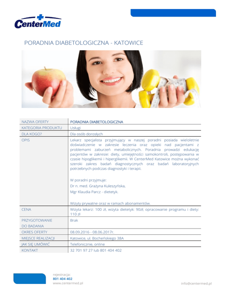 PORADNIA DIABETOLOGICZNA - KATOWICE NAZWA OFERTY PORADNIA DIABETOLOGICZNA KATEGORIA PRODUKTU Usługi DLA KOGO? Dla osób dorosłych OPIS Lekarz specjalista przyjmujący w naszej poradni posiada wieloletnie doświadczenie w zakresie leczenia oraz opieki nad pacjentami z problemami zaburzeń metabolicznych. Poradnia prowadzi edukację pacjentów w zakresie: diety, umiejętności samokontroli, postępowania w czasie hipoglikemii i hiperglikemii. W CenterMed Katowice można wykonać szeroki zakres badań diagnostycznych oraz badań laboratoryjnych potrzebnych podczas diagnostyki i terapii. W poradni przyjmuje: Dr n. med. Grażyna Kuleszyńska, Mgr Klaudia Parcz - dietetyk. Wizyty prywatne oraz w ramach abonamentów. CENA Wizyta lekarz: 100 zł, wizyta dietetyk: 90zł; opracowanie programu i diety: 110 zł PRZYGOTOWANIE Brak DO BADANIA OKRES OFERTY 08.09.2016 - 08.06.2017r. MIEJSCE REALIZACJI Katowice, ul. Bocheńskiego 38A JAK SIĘ UMÓWIĆ Telefonicznie, online KONTAKT 32 701 97 27 lub 801 404 402 rejestracja: 801 404 402 www.centermed.pl [email protected]