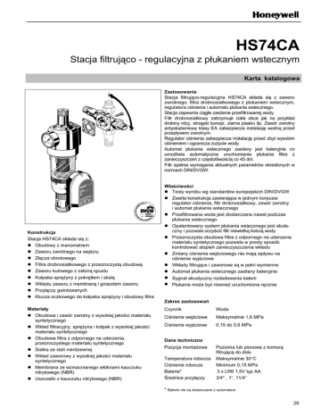 HS74CA Stacja filtrująco - regulacyjna z płukaniem wstecznym Karta katalogowa Zastosowanie Stacja filtrująco-regulacyjna HS74CA składa się z zaworu zwrotnego, filtra drobnosiatkowego z płukaniem wstecznym, regulatora ciśnienia i automatu płukania wstecznego. Stacja zapewnia ciągłe zasilanie przefiltrowanej wody. Filtr drobnosiatkowy zatrzymuje ciała obce jak na przykład drobiny rdzy, strzępki konopi, ziarna piasku itp. Zawór zwrotny antyskażeniowy klasy EA zabezpiecza instalację wodną przed przepływem zwrotnym. Regulator ciśnienia zabezpiecza instalację przed zbyt wysokim ciśnieniem i ogranicza zużycie wody. Automat płukania wstecznego zasilany jest bateryjnie co umożliwia automatyczne uruchomienie płukania filtra z zanieczyszczeń z częstotliwością co 45 dni. Filtr spełnia wymagania aktualnych parametrów określonych w normach DIN/DVGW. Konstrukcja Stacja HS74CA składa się z: z Obudowy z manometrem z Zaworu zwrotnego na wejściu z Złącza obrotowego z Filtra drobnosiatkowego z przezroczystą obudową z Zaworu kulowego z osłoną spustu z Kołpaka sprężyny z pokrętłem i skalą z Wkładu zaworu z membraną i gniazdem zaworu z Przyłączy gwintowanych z Klucza oczkowego do kołpaka sprężyny i obudowy filtra Materiały z Obudowa i zawór zwrotny z wysokiej jakości materiału syntetycznego z Wkład filtracyjny, sprężyna i kołpak z wysokiej jakości materiału syntetycznego z Obudowa filtra z odpornego na uderzenia, przezroczystego materiału syntetycznego z Siatka ze stali nierdzewnej z Wkład zaworowy z wysokiej jakości materiału syntetycznego z Membrana ze wzmacnianego włóknami kauczuku nitrylowego (NBR) z Uszczelki z kauczuku nitrylowego (NBR) Właściwości z Testy wyrobu wg standardów europejskich DIN/DVGW z Zwarta konstrukcja zawierająca w jednym korpusie regulator ciśnienia, filtr drobnosiatkowy, zawór zwrotny i automat płukania wstecznego z Przefiltrowana woda jest dostarczana nawet podczas płukania wstecznego z Opatentowany system płukania wstecznego jest skuteczny i pozwala oczyścić filtr niewielką ilością wody z Przezroczysta obudowa filtra z odpornego na uderzenia materiału syntetycznego pozwala w prosty sposób kontrolować stopień zanieczyszczenia wkładu z Zmiany ciśnienia wejściowego nie mają wpływu na ciśnienie wyjściowe z Wkłady filtrujące i zaworowe są w pełni wymienne z Automat płukania wstecznego zasilany bateryjnie z Sygnał akustyczny rozładowania baterii z Płukanie może być również uruchomione ręcznie Zakres zastosowań Czynnik Woda Ciśnienie wejściowe Maksymalnie 1,6 MPa Ciśnienie wyjściowe 0,15 do 0,6 MPa Dane techniczne Pozycja montażowa Temperatura robocza Ciśnienie robocze Baterie* Średnice przyłączy Pozioma lub pionowa z komorą filtrującą do dołu Maksymalnie 30°C Minimum 0,15 MPa 3 x LR6 1,5V typ AA 3/4" , 1”, 11/4” * Baterie nie są dostarczane z automatem 29 Zasada działania Stacja filtrująco-regulacyjna HS74CA składa się z zaworu zwrotnego, filtra drobnosiatkowego z płukaniem wstecznym, regulatora ciśnienia i automatu płukania wstecznego. Woda przepływa najpierw przez zawór zwrotny. Powoduje to naciskanie sworznia zaworu przeciwnie do działania sprężyny i otwieranie zaworu. Strumień wody przepłukujący filtr ma kierunek przeciwny do kierunku przepływu podczas normalnej pracy filtra. Pozwala to na skuteczne zrzucenie do ścieku zanieczyszczeń mechanicznych osadzonych na siatce filtracyjnej. Zintegrowany regulator ciśnienia działa na zasadzie równowagi sił - siła oddziaływująca na membranę równoważona jest przez siłę sprężyny nastawnej. Wartość ciśnienia wejściowego nie ma wpływu na otwieranie lub zamykanie zaworu i z tego powodu zmiany ciśnienia wejściowego nie mają wpływu na ciśnienie wyjściowe. Przy zamkniętych wszystkich odbiorach zawór regulacyjny zamyka się tak, że wartość ciśnienia w zamkniętej części instalacji jest równa wartości zadanej na pokrętle. Zamontowany automat płukania wstecznego z częstotliwością co 45 dni uruchamia płukanie wsteczne i oczyszcza z zanieczyszczeń siatkę filtracyjną. Proces czyszczenia siatki nie powoduje odcięcia przepływu przefiltrowanej wody do instalacji wewnętrznej. Oznaczenie: HS74CA - … AA = siatka 95/110 µm HS74CA - … AC = siatka 50 µm HS74CA - … AD = siatka 200 µm Wielkości przył Nominalna wielk. Ciężar Wymiary (mm) . R DN ok. (kg) H h T t r D I L Wartość kvs 3 /4" 20 3,8 395 285 150 66 27 105 90 189 5,5 1" 25 4,4 395 285 150 66 27 105 120 212 6,0 11/4" 32 4,7 395 285 150 66 31 105 105 234 6,5 Akcesoria VST06A Przyłącze Z końcówką gwintowaną VST06B Przyłącze Z końcówką do lutowania VST06A VST06B 30 PLH1F050 MW0903 Przykład instalacji Zasady instalacji z Instalacja pozioma lub pionowa z obudową filtra skierowaną ku dołowi Położenie takie zapewnia największą efektywność filtrowania z Zamontowanie zaworów odcinających po obydwu stronach wodomierza z Zapewnienie dostępu do urządzenia Tak by manometr był dobrze widoczny Przez przezroczystą obudowę filtra można łatwo określić stopień zanieczyszczenia siatki filtracyjnej Ułatwia konserwację i kontrolę z Montaż bezpośrednio za wodomierzem Typowe zastosowania Stacja filtrująco-regulacyjna HS74CA może być montowana we wszystkich miejscach, w których zalecane jest zastosowanie zaworów zwrotnych, filtrów, regulatorów ciśnienia lub kombinacji tych urządzeń. Sprawdza się zwłaszcza we wszystkich typach instalacji domowych, pozwalając zachować zgodność z obowiązującymi normami oraz w wybranych zastosowaniach przemysłowych. Stacja HS74CA jest instalowana: z Aby osiągnąć zgodność z normami, w miejscach o ograniczonym dostępie na przykład przy modernizacji starych instalacji z W istniejącej instalacji (rury metalowe, plastikowe lub miedziane) z W celu zapewnienia niskiego poziomu hałasu, gdy ciśnienie statyczne. w punktach poboru przekracza 0,5 MP