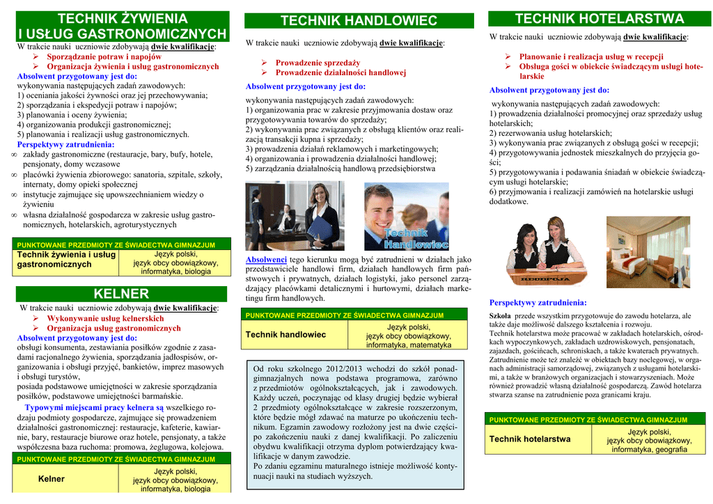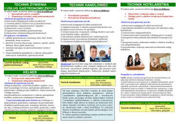 TECHNIK śYWIENIA I USŁUG GASTRONOMICZNYCH W trakcie nauki uczniowie zdobywają dwie kwalifikacje: Sporządzanie potraw i napojów Organizacja Ŝywienia i usług gastronomicznych Absolwent przygotowany jest do: wykonywania następujących zadań zawodowych: 1) oceniania jakości Ŝywności oraz jej przechowywania; 2) sporządzania i ekspedycji potraw i napojów; 3) planowania i oceny Ŝywienia; 4) organizowania produkcji gastronomicznej; 5) planowania i realizacji usług gastronomicznych. Perspektywy zatrudnienia: • zakłady gastronomiczne (restauracje, bary, bufy, hotele, pensjonaty, domy wczasowe • placówki Ŝywienia zbiorowego: sanatoria, szpitale, szkoły, internaty, domy opieki społecznej • instytucje zajmujące się upowszechnianiem wiedzy o Ŝywieniu • własna działalność gospodarcza w zakresie usług gastronomicznych, hotelarskich, agroturystycznych TECHNIK HANDLOWIEC W trakcie nauki uczniowie zdobywają dwie kwalifikacje: Prowadzenie sprzedaŜy Prowadzenie działalności handlowej TECHNIK HOTELARSTWA W trakcie nauki uczniowie zdobywają dwie kwalifikacje: Planowanie i realizacja usług w recepcji Obsługa gości w obiekcie świadczącym usługi hotelarskie Absolwent przygotowany jest do: Absolwent przygotowany jest do: wykonywania następujących zadań zawodowych: 1) organizowania prac w zakresie przyjmowania dostaw oraz przygotowywania towarów do sprzedaŜy; 2) wykonywania prac związanych z obsługą klientów oraz realizacją transakcji kupna i sprzedaŜy; 3) prowadzenia działań reklamowych i marketingowych; 4) organizowania i prowadzenia działalności handlowej; 5) zarządzania działalnością handlową przedsiębiorstwa wykonywania następujących zadań zawodowych: 1) prowadzenia działalności promocyjnej oraz sprzedaŜy usług hotelarskich; 2) rezerwowania usług hotelarskich; 3) wykonywania prac związanych z obsługą gości w recepcji; 4) przygotowywania jednostek mieszkalnych do przyjęcia gości; 5) przygotowywania i podawania śniadań w obiekcie świadczącym usługi hotelarskie; 6) przyjmowania i realizacji zamówień na hotelarskie usługi dodatkowe. PUNKTOWANE PRZEDMIOTY ZE ŚWIADECTWA GIMNAZJUM Technik Ŝywienia i usług gastronomicznych Język polski, język obcy obowiązkowy, informatyka, biologia KELNER W trakcie nauki uczniowie zdobywają dwie kwalifikacje: Wykonywanie usług kelnerskich Organizacja usług gastronomicznych Absolwent przygotowany jest do: obsługi konsumenta, zestawiania posiłków zgodnie z zasadami racjonalnego Ŝywienia, sporządzania jadłospisów, organizowania i obsługi przyjęć, bankietów, imprez masowych i obsługi turystów, posiada podstawowe umiejętności w zakresie sporządzania posiłków, podstawowe umiejętności barmańskie. Typowymi miejscami pracy kelnera są wszelkiego rodzaju podmioty gospodarcze, zajmujące się prowadzeniem działalności gastronomicznej: restauracje, kafeterie, kawiarnie, bary, restauracje biurowe oraz hotele, pensjonaty, a takŜe współczesna baza ruchoma: promowa, Ŝeglugowa, kolejowa. PUNKTOWANE PRZEDMIOTY ZE ŚWIADECTWA GIMNAZJUM Kelner Język polski, język obcy obowiązkowy, informatyka, biologia Absolwenci tego kierunku mogą być zatrudnieni w działach jako przedstawiciele handlowi firm, działach handlowych firm państwowych i prywatnych, działach logistyki, jako personel zarządzający placówkami detalicznymi i hurtowymi, działach marketingu firm handlowych. PUNKTOWANE PRZEDMIOTY ZE ŚWIADECTWA GIMNAZJUM Technik handlowiec Język polski, język obcy obowiązkowy, informatyka, matematyka Od roku szkolnego 2012/2013 wchodzi do szkół ponadgimnazjalnych nowa podstawa programowa, zarówno z przedmiotów ogólnokształcących, jak i zawodowych. KaŜdy uczeń, poczynając od klasy drugiej będzie wybierał 2 przedmioty ogólnokształcące w zakresie rozszerzonym, które będzie mógł zdawać na maturze po ukończeniu technikum. Egzamin zawodowy rozłoŜony jest na dwie częścipo zakończeniu nauki z danej kwalifikacji. Po zaliczeniu obydwu kwalifikacji otrzyma dyplom potwierdzający kwalifikacje w danym zawodzie. Po zdaniu egzaminu maturalnego istnieje moŜliwość kontynuacji nauki na studiach wyŜszych. Perspektywy zatrudnienia: Szkoła przede wszystkim przygotowuje do zawodu hotelarza, ale takŜe daje moŜliwość dalszego kształcenia i rozwoju. Technik hotelarstwa moŜe pracować w zakładach hotelarskich, ośrodkach wypoczynkowych, zakładach uzdrowiskowych, pensjonatach, zajazdach, gościńcach, schroniskach, a takŜe kwaterach prywatnych. Zatrudnienie moŜe teŜ znaleźć w obiektach bazy noclegowej, w organach administracji samorządowej, związanych z usługami hotelarskimi, a takŜe w branŜowych organizacjach i stowarzyszeniach. MoŜe równieŜ prowadzić własną działalność gospodarczą. Zawód hotelarza stwarza szanse na zatrudnienie poza granicami kraju. PUNKTOWANE PRZEDMIOTY ZE ŚWIADECTWA GIMNAZJUM Technik hotelarstwa Język polski, język obcy obowiązkowy, informatyka, geografia Uczymy się w zmodernizowanej i dostosowanej do wymagań HACCP pracowni gastronomicznej. Posiadamy odpowiedni sprzęt, narzędzia pracy, bankietową bieliznę stołową oraz elegancką zastawę stołową. Z Zaapprraasszzaam myy ddoo T Teecchhnniikkuum mN Nrr 33 W ZESPOLE SZKÓŁ ZAWODOWYCH w GiŜycku ul. I Dyw. T.Kościuszki 16 tel./fax: 0 87 428 -32- 41 e – mail: [email protected] www.zsz.edu.pl Prowadzimy nabór elektroniczny https://nabor.progman.pl/gizycko/ Pracownia gastronomiczna i pracownia obsługi konsumenta Proponujemy następujące kierunki kształcenia: Technik hotelarstwa Technik Ŝywienia i usług gastronomicznych I i III miejsce w Konkursie "Rewia stołów" w Mrągowie Kelner Technik handlowiec I miejsce w Konkursie Gastronomiczno-Językowym w Mrągowie PODANIE o przyjęcie do szkoły oraz KWESTIONARIUSZ OSOBOWY składają kandydaci lub ich opiekunowie bezpośrednio w sekretariacie szkoły w terminie od 2 kwietnia do 22 czerwca 2012 r. Szczegółowe wa