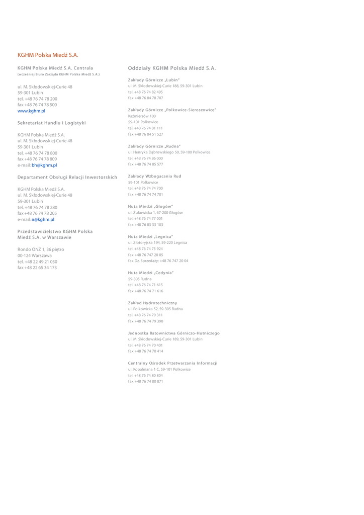 KGHM Polska Miedź S.A. K GHM P ols k a Miedź S.A . Cent r ala Oddziały KG H M Pols ka Miedź S. A. ( wcze ś nie j Biuro Za rzą du KGHM Pols k a M ie dź S .A.) ul. M. Skłodowskiej-Curie 48 59-301 Lubin tel. +48 76 74 78 200 fax +48 76 74 78 500 www.kghm.pl Sek r et ar iat Handlu i L ogis t y k i KGHM Polska Miedź S.A. ul. M. Skłodowskiej-Curie 48 59-301 Lubin tel. +48 76 74 78 800 fax +48 76 74 78 809 e-mail: [email protected] Depar t ament O bs ł ugi R elacj i I nwes t or s k ich KGHM Polska Miedź S.A. ul. M. Skłodowskiej-Curie 48 59-301 Lubin tel. +48 76 74 78 280 fax +48 76 74 78 205 e-mail: [email protected] P r zeds t awiciels t wo K GHM P ols k a Miedź S.A . w War s zawie Rondo ONZ 1, 36 piętro 00-124 Warszawa tel. +48 22 49 21 050 fax +48 22 65 34 173 Z a k ła d y G ó rn i cze „L u b i n ” ul. M. Skłodowskiej-Curie 188, 59-301 Lubin tel. +48 76 74 82 495 fax +48 76 84 78 707 Z a k ła d y G ó rn i cze „Po lk o w i ce- Si ero s zo w i ce” Kaźmierzów 100 59-101 Polkowice tel. +48 76 74 81 111 fax +48 76 84 51 527 Z a k ła d y G ó rn i cze „Ru d n a ” ul. Henryka Dąbrowskiego 50, 59-100 Polkowice tel. +48 76 74 86 000 fax +48 76 74 85 577 Z a k ła d y Wzb o g a ca n i a Ru d 59-101 Polkowice tel. +48 76 74 74 700 fax +48 76 74 74 701 H u ta M i ed zi „G ło g ó w ” ul. Żukowicka 1, 67-200 Głogów tel. +48 76 74 77 001 fax +48 76 83 33 103 H u ta M i ed zi „L eg n i ca ” ul. Złotoryjska 194, 59-220 Legnica tel. +48 76 74 75 924 fax +48 76 747 20 05 fax Dz. Sprzedaży: +48 76 747 20 04 H u ta M i ed zi „Ced y n i a ” 59-305 Rudna tel. +48 76 74 71 615 fax +48 76 74 71 616 Z a k ła d H y d ro tech n i czn y ul. Polkowicka 52, 59-305 Rudna tel. +48 76 74 79 311 fax +48 76 74 79 390 Jed n o s tk a Ra to w n i ctw a G ó rn i czo - H u tn i czeg o ul. M. Skłodowskiej-Curie 189, 59-301 Lubin tel. +48 76 74 70 401 fax +48 76 74 70 414 Cen tra ln y Oś ro d ek Przetw a rza n i a In f o rma cji ul. Kopalniana 1 C, 59-101 Polkowice tel. +48 76 74 80 804 fax +48 76 74 80 871