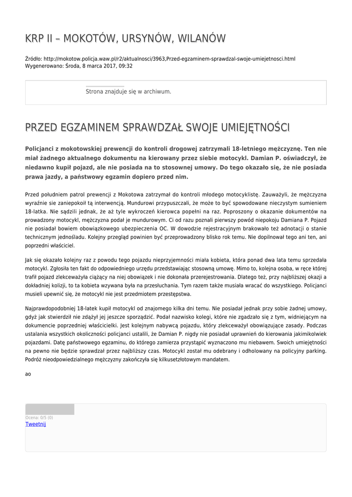 KRP II – MOKOTÓW, URSYNÓW, WILANÓW Źródło: http://mokotow.policja.waw.pl/r2/aktualnosci/3963,Przed-egzaminem-sprawdzal-swoje-umiejetnosci.html Wygenerowano: Środa, 8 marca 2017, 09:32 Strona znajduje się w archiwum. PRZED EGZAMINEM SPRAWDZAŁ SWOJE UMIEJĘTNOŚCI Policjanci z mokotowskiej prewencji do kontroli drogowej zatrzymali 18-letniego mężczyznę. Ten nie miał żadnego aktualnego dokumentu na kierowany przez siebie motocykl. Damian P. oświadczył, że niedawno kupił pojazd, ale nie posiada na to stosownej umowy. Do tego okazało się, że nie posiada prawa jazdy, a państwowy egzamin dopiero przed nim. Przed południem patrol prewencji z Mokotowa zatrzymał do kontroli młodego motocyklistę. Zauważyli, że mężczyzna wyraźnie sie zaniepokoił tą interwencją. Mundurowi przypuszczali, że może to być spowodowane nieczystym sumieniem 18-latka. Nie sądzili jednak, że aż tyle wykroczeń kierowca popełni na raz. Poproszony o okazanie dokumentów na prowadzony motocykl, mężczyzna podał je mundurowym. Ci od razu poznali pierwszy powód niepokoju Damiana P. Pojazd nie posiadał bowiem obowiązkowego ubezpieczenia OC. W dowodzie rejestracyjnym brakowało też adnotacji o stanie technicznym jednośladu. Kolejny przegląd powinien być przeprowadzony blisko rok temu. Nie dopilnował tego ani ten, ani poprzedni właściciel. Jak się okazało kolejny raz z powodu tego pojazdu nieprzyjemności miała kobieta, która ponad dwa lata temu sprzedała motocykl. Zgłosiła ten fakt do odpowiedniego urzędu przedstawiając stosowną umowę. Mimo to, kolejna osoba, w ręce której trafił pojazd zlekceważyła ciążący na niej obowiązek i nie dokonała przerejestrowania. Dlatego też, przy najbliższej okazji a dokładniej kolizji, to ta kobieta wzywana była na przesłuchania. Tym razem także musiała wracać do wszystkiego. Policjanci musieli upewnić się, że motocykl nie jest przedmiotem przestępstwa. Najprawdopodobniej 18-latek kupił motocykl od znajomego kilka dni temu. Nie posiadał jednak przy sobie żadnej umowy, gdyż jak stwierdził nie zdążył jej jeszcze sporządzić. Podał nazwisko kolegi, które nie zgadzało się z tym, widniejącym na dokumencie poprzedniej właścicielki. Jest kolejnym nabywcą pojazdu, który zlekceważył obowiązujące zasady. Podczas ustalania wszystkich okoliczności policjanci ustalili, że Damian P. nigdy nie posiadał uprawnień do kierowania jakimikolwiek pojazdami. Datę państwowego egzaminu, do którego zamierza przystąpić wyznaczono mu niebawem. Swoich umiejętności na pewno nie będzie sprawdzał przez najbliższy czas. Motocykl został mu odebrany i odholowany na policyjny parking. Podróż nieodpowiedzialnego mężczyzny zakończyła się kilkusetzłotowym mandatem. ao Ocena: 0/5 (0) Tweetnij