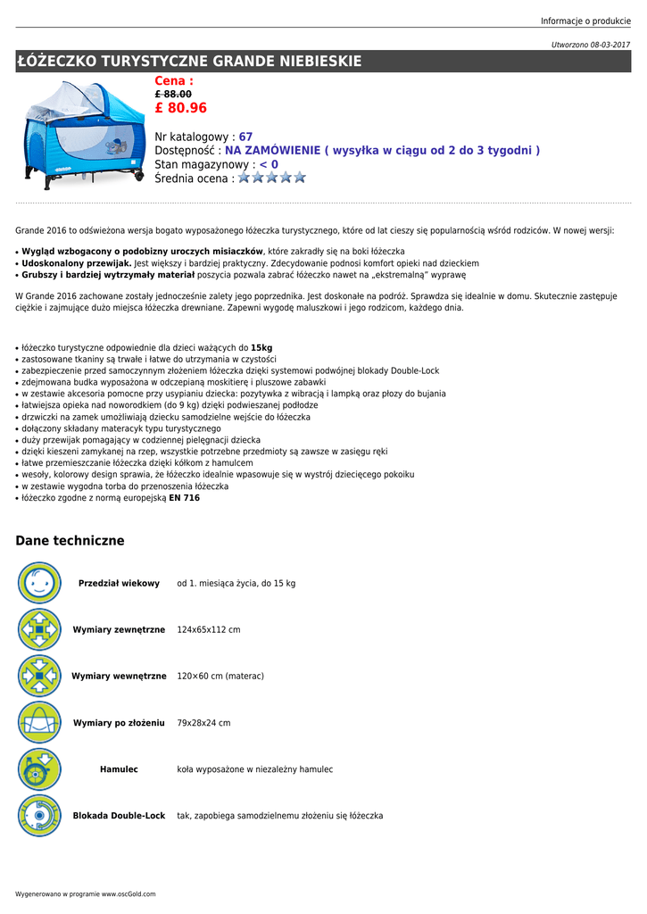 Informacje o produkcie Utworzono 08-03-2017 ŁÓŻECZKO TURYSTYCZNE GRANDE NIEBIESKIE Cena : £ 88.00 £ 80.96 Nr katalogowy : 67 Dostępność : NA ZAMÓWIENIE ( wysyłka w ciągu od 2 do 3 tygodni ) Stan magazynowy : < 0 Średnia ocena : Grande 2016 to odświeżona wersja bogato wyposażonego łóżeczka turystycznego, które od lat cieszy się popularnością wśród rodziców. W nowej wersji: ● ● ● Wygląd wzbogacony o podobizny uroczych misiaczków, które zakradły się na boki łóżeczka Udoskonalony przewijak. Jest większy i bardziej praktyczny. Zdecydowanie podnosi komfort opieki nad dzieckiem Grubszy i bardziej wytrzymały materiał poszycia pozwala zabrać łóżeczko nawet na „ekstremalną” wyprawę W Grande 2016 zachowane zostały jednocześnie zalety jego poprzednika. Jest doskonałe na podróż. Sprawdza się idealnie w domu. Skutecznie zastępuje ciężkie i zajmujące dużo miejsca łóżeczka drewniane. Zapewni wygodę maluszkowi i jego rodzicom, każdego dnia. ● ● ● ● ● ● ● ● ● ● ● ● ● ● łóżeczko turystyczne odpowiednie dla dzieci ważących do 15kg zastosowane tkaniny są trwałe i łatwe do utrzymania w czystości zabezpieczenie przed samoczynnym złożeniem łóżeczka dzięki systemowi podwójnej blokady Double-Lock zdejmowana budka wyposażona w odczepianą moskitierę i pluszowe zabawki w zestawie akcesoria pomocne przy usypianiu dziecka: pozytywka z wibracją i lampką oraz płozy do bujania łatwiejsza opieka nad noworodkiem (do 9 kg) dzięki podwieszanej podłodze drzwiczki na zamek umożliwiają dziecku samodzielne wejście do łóżeczka dołączony składany materacyk typu turystycznego duży przewijak pomagający w codziennej pielęgnacji dziecka dzięki kieszeni zamykanej na rzep, wszystkie potrzebne przedmioty są zawsze w zasięgu ręki łatwe przemieszczanie łóżeczka dzięki kółkom z hamulcem wesoły, kolorowy design sprawia, że łóżeczko idealnie wpasowuje się w wystrój dziecięcego pokoiku w zestawie wygodna torba do przenoszenia łóżeczka łóżeczko zgodne z normą europejską EN 716 Dane techniczne Przedział wiekowy od 1. miesiąca życia, do 15 kg Wymiary zewnętrzne 124x65x112 cm Wymiary wewnętrzne 120×60 cm (materac) Wymiary po złożeniu 79x28x24 cm Hamulec Blokada Double-Lock Wygenerowano w programie www.oscGold.com koła wyposażone w niezależny hamulec tak, zapobiega samodzielnemu złożeniu się łóżeczka Przewijak Wyposażenie dodatkowe Kolorystyka Waga Wymiary opakowania Norma w zestawie w zestawie wygodna torba do przenoszenia łóżeczka, moskitiera, pozytywka z lampką i wibracją, pluszowe zabawki, płozy do bujania, podwieszana podłoga Blue, Brown, Green, Purple, Red 13,0 kg 28x24x79 cm EN 716 Wymiary podawane są według schematu: szerokość x głębokość lub szerokość x głębokość x wysokość.