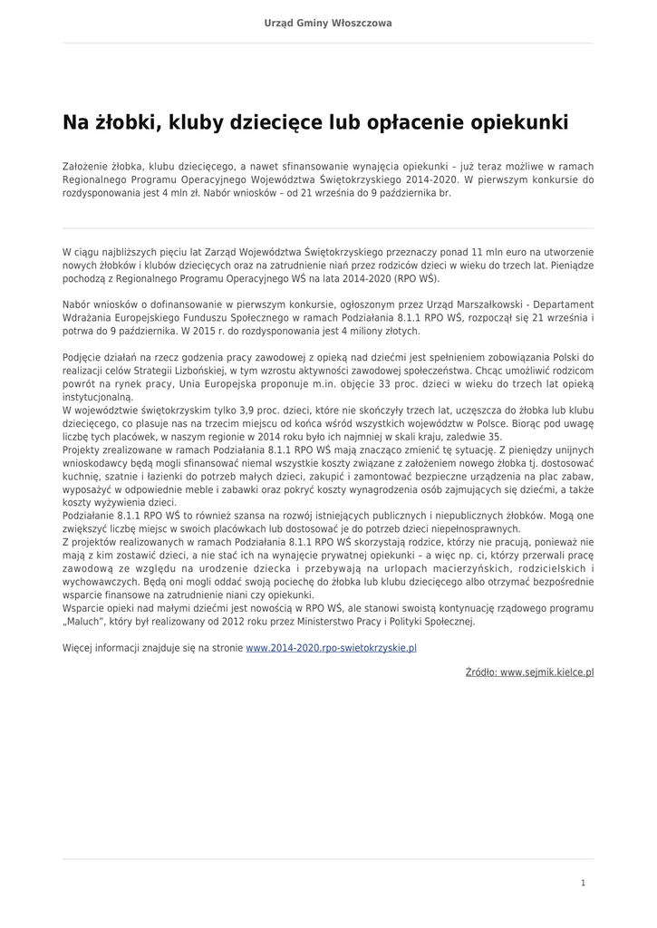 Urząd Gminy Włoszczowa Na żłobki, kluby dziecięce lub opłacenie opiekunki Założenie żłobka, klubu dziecięcego, a nawet sfinansowanie wynajęcia opiekunki – już teraz możliwe w ramach Regionalnego Programu Operacyjnego Województwa Świętokrzyskiego 2014-2020. W pierwszym konkursie do rozdysponowania jest 4 mln zł. Nabór wniosków – od 21 września do 9 października br. W ciągu najbliższych pięciu lat Zarząd Województwa Świętokrzyskiego przeznaczy ponad 11 mln euro na utworzenie nowych żłobków i klubów dziecięcych oraz na zatrudnienie niań przez rodziców dzieci w wieku do trzech lat. Pieniądze pochodzą z Regionalnego Programu Operacyjnego WŚ na lata 2014-2020 (RPO WŚ). Nabór wniosków o dofinansowanie w pierwszym konkursie, ogłoszonym przez Urząd Marszałkowski - Departament Wdrażania Europejskiego Funduszu Społecznego w ramach Podziałania 8.1.1 RPO WŚ, rozpoczął się 21 września i potrwa do 9 października. W 2015 r. do rozdysponowania jest 4 miliony złotych. Podjęcie działań na rzecz godzenia pracy zawodowej z opieką nad dziećmi jest spełnieniem zobowiązania Polski do realizacji celów Strategii Lizbońskiej, w tym wzrostu aktywności zawodowej społeczeństwa. Chcąc umożliwić rodzicom powrót na rynek pracy, Unia Europejska proponuje m.in. objęcie 33 proc. dzieci w wieku do trzech lat opieką instytucjonalną. W województwie świętokrzyskim tylko 3,9 proc. dzieci, które nie skończyły trzech lat, uczęszcza do żłobka lub klubu dziecięcego, co plasuje nas na trzecim miejscu od końca wśród wszystkich województw w Polsce. Biorąc pod uwagę liczbę tych placówek, w naszym regionie w 2014 roku było ich najmniej w skali kraju, zaledwie 35. Projekty zrealizowane w ramach Podziałania 8.1.1 RPO WŚ mają znacząco zmienić tę sytuację. Z pieniędzy unijnych wnioskodawcy będą mogli sfinansować niemal wszystkie koszty związane z założeniem nowego żłobka tj. dostosować kuchnię, szatnie i łazienki do potrzeb małych dzieci, zakupić i zamontować bezpieczne urządzenia na plac zabaw, wyposażyć w odpowiednie meble i zabawki oraz pokryć koszty wynagrodzenia osób zajmujących się dziećmi, a także koszty wyżywienia dzieci. Podziałanie 8.1.1 RPO WŚ to również szansa na rozwój istniejących publicznych i niepublicznych żłobków. Mogą one zwiększyć liczbę miejsc w swoich placówkach lub dostosować je do potrzeb dzieci niepełnosprawnych. Z projektów realizowanych w ramach Podziałania 8.1.1 RPO WŚ skorzystają rodzice, którzy nie pracują, ponieważ nie mają z kim zostawić dzieci, a nie stać ich na wynajęcie prywatnej opiekunki – a więc np. ci, którzy przerwali pracę zawodową ze względu na urodzenie dziecka i przebywają na urlopach macierzyńskich, rodzicielskich i wychowawczych. Będą oni mogli oddać swoją pociechę do żłobka lub klubu dziecięcego albo otrzymać bezpośrednie wsparcie finansowe na zatrudnienie niani czy opiekunki. Wsparcie opieki nad małymi dziećmi jest nowością w RPO WŚ, ale stanowi swoistą kontynuację rządowego programu „Maluch”, który był realizowany od 2012 roku przez Ministerstwo Pracy i Polityki Społecznej. Więcej informacji znajduje się na stronie www.2014-2020.rpo-swietokrzyskie.pl Źródło: www.sejmik.kielce.pl 1