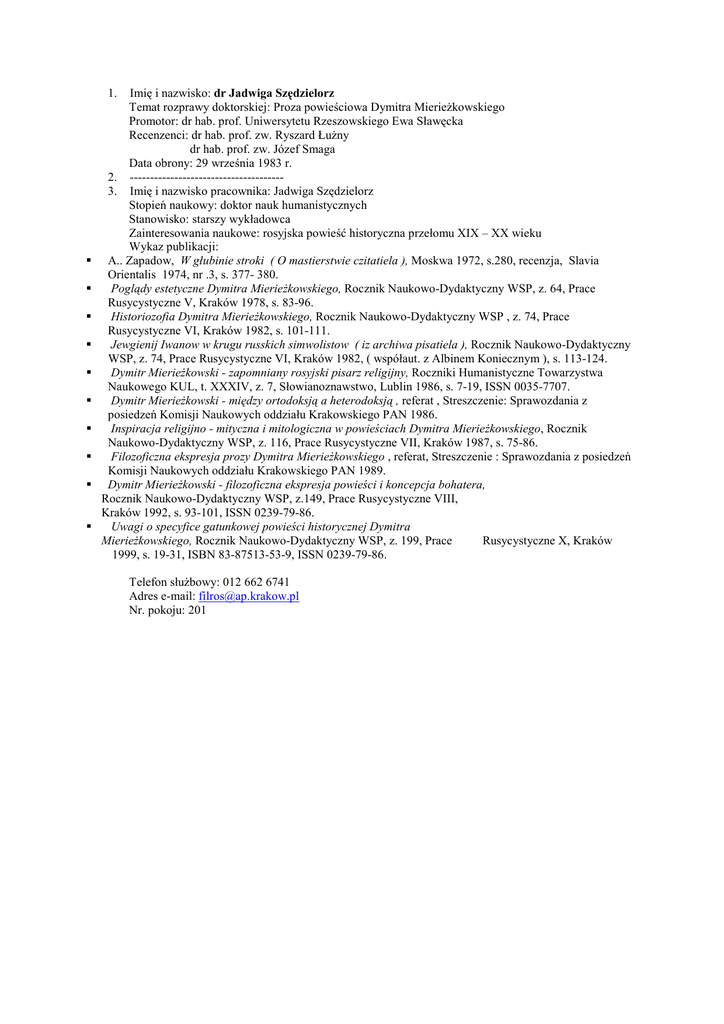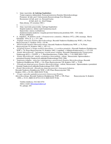 1. Imię i nazwisko: dr Jadwiga Szędzielorz Temat rozprawy doktorskiej: Proza powieściowa Dymitra Mierieżkowskiego Promotor: dr hab. prof. Uniwersytetu Rzeszowskiego Ewa Sławęcka Recenzenci: dr hab. prof. zw. Ryszard Łużny dr hab. prof. zw. Józef Smaga Data obrony: 29 września 1983 r. 2. -------------------------------------3. Imię i nazwisko pracownika: Jadwiga Szędzielorz Stopień naukowy: doktor nauk humanistycznych Stanowisko: starszy wykładowca Zainteresowania naukowe: rosyjska powieść historyczna przełomu XIX – XX wieku Wykaz publikacji: A.. Zapadow, W głubinie stroki ( O mastierstwie czitatiela ), Moskwa 1972, s.280, recenzja, Slavia Orientalis 1974, nr .3, s. 377- 380. Poglądy estetyczne Dymitra Mierieżkowskiego, Rocznik Naukowo-Dydaktyczny WSP, z. 64, Prace Rusycystyczne V, Kraków 1978, s. 83-96. Historiozofia Dymitra Mierieżkowskiego, Rocznik Naukowo-Dydaktyczny WSP , z. 74, Prace Rusycystyczne VI, Kraków 1982, s. 101-111. Jewgienij Iwanow w krugu russkich simwolistow ( iz archiwa pisatiela ), Rocznik Naukowo-Dydaktyczny WSP, z. 74, Prace Rusycystyczne VI, Kraków 1982, ( współaut. z Albinem Koniecznym ), s. 113-124. Dymitr Mierieżkowski - zapomniany rosyjski pisarz religijny, Roczniki Humanistyczne Towarzystwa Naukowego KUL, t. XXXIV, z. 7, Słowianoznawstwo, Lublin 1986, s. 7-19, ISSN 0035-7707. Dymitr Mierieżkowski - między ortodoksją a heterodoksją , referat , Streszczenie: Sprawozdania z posiedzeń Komisji Naukowych oddziału Krakowskiego PAN 1986. Inspiracja religijno - mityczna i mitologiczna w powieściach Dymitra Mierieżkowskiego, Rocznik Naukowo-Dydaktyczny WSP, z. 116, Prace Rusycystyczne VII, Kraków 1987, s. 75-86. Filozoficzna ekspresja prozy Dymitra Mierieżkowskiego , referat, Streszczenie : Sprawozdania z posiedzeń Komisji Naukowych oddziału Krakowskiego PAN 1989. Dymitr Mierieżkowski - filozoficzna ekspresja powieści i koncepcja bohatera, Rocznik Naukowo-Dydaktyczny WSP, z.149, Prace Rusycystyczne VIII, Kraków 1992, s. 93-101, ISSN 0239-79-86. Uwagi o specyfice gatunkowej powieści historycznej Dymitra Mierieżkowskiego, Rocznik Naukowo-Dydaktyczny WSP, z. 199, Prace Rusycystyczne X, Kraków 1999, s. 19-31, ISBN 83-87513-53-9, ISSN 0239-79-86. Telefon służbowy: 012 662 6741 Adres e-mail: [email protected] Nr. pokoju: 201