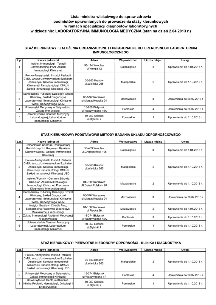 Lista ministra właściwego do spraw zdrowia podmiotów uprawnionych do prowadzenia staży kierunkowych w ramach specjalizacji diagnostów laboratoryjnych w dziedzinie: LABORATORYJNA IMMUNOLOGIA MEDYCZNA (stan na dzień 2.04.2013 r.) STAŻ KIERUNKOWY : ZAŁOŻENIA ORGANIZACYJNE I FUNKCJONALNE REFERENCYJNEGO LABORATORIUM IMMUNOLOGICZNEGO L.p. 1 2 3 4 5 Nazwa jednostki Instytut Immunologii i Terapii Doświadczalnej PAN, Zakład Immunologii Klinicznej Polsko-Amerykański Instytut Pediatrii CMUJ wraz z Uniwersyteckim Szpitalem Dziecięcym, Katedra Immunologii Klinicznej i Tansplantologii CMUJ i Zakład Immunologii Klinicznej USD Samodzielny Publiczny Dziecięcy Szpital Kliniczny, Zakład Diagnostyki Laboratoryjnej i Immunologii Klinicznej Wieku Rozwojowego WUM Uniwersytet Medyczny w Białymstoku, Zakład Immunologii Uniwersyteckie Centrum Medycyny Laboratoryjnej, Laboratorium Immunologii Klinicznej Adres Województwo Liczba miejsc Uwagi 53-114 Wrocław ul.Weigla 12 Dolnośląskie 3 Uprawnienia do 1.04.2015 r. 30-663 Kraków ul.Wielicka 265 Małopolskie 2 Uprawnienia do 1.10.2013 r. 00-576 Warszawa ul.Marszałkowska 24 Mazowieckie 3 Uprawnienia do 28.02.2016 r 15-269 Białystok ul.Waszyngtona 15A Podlaskie 4 Uprawnienia do 28.02.2016 r 80-952 Gdańsk ul.Dębinki 7 Pomorskie 1 Uprawnienia do 1.10.2013 r. STAŻ KIERUNKOWY: PODSTAWOWE METODY BADANIA UKŁADU ODPORNOŚCIOWEGO L.p. 1 2 3 4 4 5 6 Nazwa jednostki Dolnośląskie Centrum Transplantacji Komórkowych z Krajowym Bankiem Dawców Szpiku, Oddział Immunologii Klinicznej Polsko-Amerykański Instytut Pediatrii CMUJ wraz z Uniwersyteckim Szpitalem Dziecięcym, Katedra Immunologii Klinicznej i transplantologii CMUJ i Zakład Immunologii Klinicznej USD Instytut 'Pomnik - Centrum Zdrowia Dziecka", Zakład Mikrobiologii i Immunologii Klinicznej, Pracownia Diagnostyki Immunologicznej Samodzielny Publiczny Dziecięcy Szpital Kliniczny, Zakład Diagnostyki Laboratoryjnej i Immunologii Klinicznej Wieku Rozwojowego WUM Instytut Gruźlicy i Chorób Płuc, Samodzielna Pracownia Diagnostyki Molekularnej i Immunologii Zakład Immunologii Akademii Medycznej w Białymstoku Uniwersyteckie Centrum Medycyny Laboratoryjnej, Laboratorium Immunologii Klinicznej Adres Województwo Liczba miejsc Uwagi 53-439 Wrocław ul.Grabiszyńska 105 Dolnośląskie 3 Uprawnienia do 1.04.2015 r. 30-663 Kraków ul.Wielicka 265 Małopolskie 2 Uprawnienia do 1.10.2013 r. 04-730 Warszawa Al.Dzieci Polskich 20 Mazowieckie 2 Uprawnienia do 1.10.2013 r. 00-576 Warszawa ul.Marszałkowska 24 Mazowieckie 3 Uprawnienia do 28.02.2016 r 01-138 Warszawa ul.Płocka 26 Mazowieckie 2 Uprawnienia do 1.04.2015 r. 15-274 Białystok ul.Waszyngtona 15A Podlaskie 3 Uprawnienia do 1.10.2013 r. 80-952 Gdańsk ul.Dębinki 7 Pomorskie 1 Uprawnienia do 1.10.2013 r. STAŻ KIERUNKOWY: PIERWOTNE NIEDOBORY ODPORNOŚCI - KLINIKA I DIAGNOSTYKA L.p. Nazwa jednostki Adres Województwo Liczba miejsc Uwagi 1 Polsko-Amerykański Instytut Pediatrii CMUJ wraz z Uniwersyteckim Szpitalem Dziecięcym, Katedra Immunologii Klinicznej i transplantologii CMUJ i Zakład Immunologii Klinicznej USD 30-663 Kraków ul.Wielicka 265 Małopolskie 2 Uprawnienia do 1.10.2013 r. 15-274 Białystok ul.Waszyngtona 17 Podlaskie 4 Uprawnienia do 28.02.2016 r 80-952 Gdańsk ul.Dębinki 7 Pomorskie 1 Uprawnienia do 1.10.2013 r. 2 3 Uniwersytet Medyczny w Białymstoku, Zakład Immunologii Klinicznej Uniwersyteckie Centrum Kliniczne, Klinika Pediatrii, Hematologii, Onkologii i Endokrynologii STAŻ KIERUNKOWY: CHOROBY AUTOIMMUNIZACYJNE - SYMPTOMATOLOGIA I IMMUNODIAGNOSTYKA L.p. Adres Województwo Liczba miejsc Uwagi 53-439 Wrocław ul.Grabiszyńska 105 Dolnośląskie 3 Uprawnienia do 1.04.2015 r. 2 Polsko-Amerykański Instytut Pediatrii CMUJ wraz z Uniwersyteckim Szpitalem Dziecięcym, Katedra Immunologii Klinicznej i Transplantologii CMUJ i Zakład Immunologii Klinicznej USD 30-663 Kraków ul.Wielicka 265 Małopolskie 2 Uprawnienia do 1.10.2013 r. 3 Klinika Reumatologii i Chorób Wewnętrznych Akademii Medycznej w Białymstoku 15-276 Białystok ul.M.Skłodowskiej-Curie 24a Podlaskie 3 Uprawnienia do 1.10.2013 r. 4 Regionalne Centrum Krwiodawstwa i Krwiolecznictwa SPZOZ w Białymstoku 15-950 Białystok ul.Skłodowskiej-Curie 23 Podlaskie 3 Uprawnienia do 1.10.2013 r. 5 Uniwersyteckie Centrum Kliniczne, Klinika Endokrynologii i Chorób Wewnętrznych 80-952 Gdańsk ul.Dębinki 7 Pomorskie 1 Uprawnienia do 1.10.2013 r. 1 Nazwa jednostki Dolnośląskie Centrum Transplantacji Komórkowych z Krajowym Bankiem Dawców Szpiku, Oddział Immunologii Klinicznej STAŻ KIERUNKOWY: CHOROBY ALERGICZNE - SYMPTOMATOLOGIA I IMMUNODIAGNOSTYKA L.p. 1 2 Nazwa jednostki Klinika Alergologii i Chorób Wewnętrznych Akademii Medycznej w Białymstoku Uniwersyteckie Centrum Kliniczne, Klinika Alergologii Adres Województwo Liczba miejsc Uwagi 15-276 Białystok ul.M.Skłodowskiej-Curie 24A Podlaskie 4 Uprawnienia do 1.10.2013 r. 80-952 Gdańsk ul.Dębinki 7 Pomorskie 1 Uprawnienia do 1.10.2013 r. STAŻ KIERUNKOWY: TRANSPLANTOLOGIA L.p. Adres Województwo Liczba miejsc Uwagi 53-439 Wrocław ul.Grabiszyńska 105 Dolnośląskie 2 Uprawnienia do 1.04.2015 r. 2 Polsko-Amerykański Instytut Pediatrii CMUJ wraz z Uniwersyteckim Szpitalem Dziecięcym, Katedra Immunologii Klinicznej i Transplantologii CMUJ i Zakład Immunologii Klinicznej USD 30-663 Kraków ul.Wielicka 265 Małopolskie 2 Uprawnienia do 1.10.2013 r. 3 Instytut "Pomnik -Centrum Zdrowia Dziecka", Pracownia Zgodności Tkankowej 04-730 Warszawa Al.Dzieci Polskich 20 Mazowieckie 2 Uprawnienia do 1.10.2017 r. 4 Regionalne Centrum Krwiodawstwa i Krwiolecznictwa SPZOZ w Białymstoku 15-950 Białystok ul.Skłodowskiej-Curie 23 Podlaskie 3 Uprawnienia do 1.10.2013 r. 15-540 Białystok ul.Żurawia 14 Podlaskie 3 Uprawnienia do 1.10.2013 r. 80-952 Gdańsk ul.Dębinki 7 Pomorskie 1 Uprawnienia do 1.10.2013 r. 1 5 6 Nazwa jednostki Dolnośląskie Centrum Transplantacji Komórkowych z Krajowym Bankiem Dawców Szpiku, Laboratorium typo