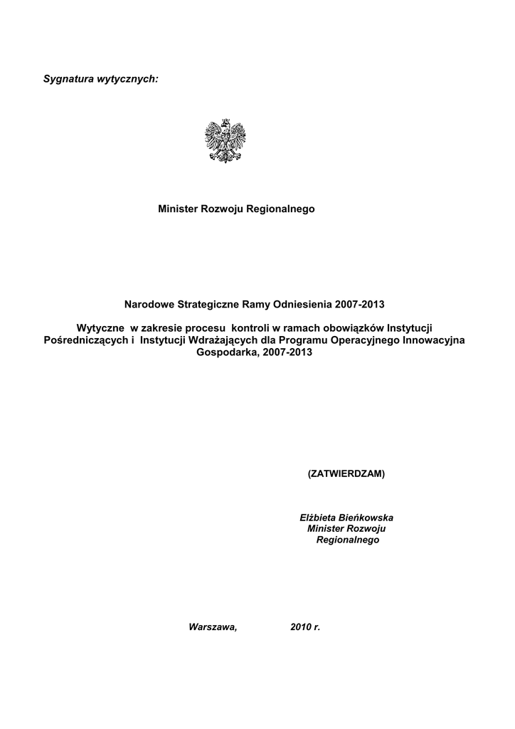 Sygnatura wytycznych: Minister Rozwoju Regionalnego Narodowe Strategiczne Ramy Odniesienia 2007-2013 Wytyczne w zakresie procesu kontroli w ramach obowiązków Instytucji Pośredniczących i Instytucji WdraŜających dla Programu Operacyjnego Innowacyjna Gospodarka, 2007-2013 (ZATWIERDZAM) ElŜbieta Bieńkowska Minister Rozwoju Regionalnego Warszawa, 2010 r. Spis treści 1 Rozdział 1 - Podstawy prawne ..................................................................................................3 2 Rozdział 2 - Zakres regulacji, uŜyte skróty i terminy ...............................................................4 3 Rozdział 3 - Podział zadań w zakresie czynności kontrolnych ................................................6 4 Rozdział 4 - Procedura przygotowania rocznego planu kontroli przez IP i IW oraz metodologia doboru próby do kontroli projektów ....................................................................7 4.1 Podrozdział 1 - Procedura przygotowania planu kontroli ........................................................7 4.2 Podrozdział 2 - Metodologia doboru próby projektów do kontroli ..........................................8 5 Rozdział 5 - Weryfikacja wydatków i dokumentów poświadczających poniesienie wydatków.....................................................................................................................................9 6 Rozdział 6 – Główne cele kontroli systemowych i kontroli na miejscu.................................11 7 Rozdział 7 - Etapy przygotowania i prowadzenia kontroli...................................................12 7.1 Podrozdział 1 - Pismo informujące o planowanej kontroli .....................................................12 7.2 Podrozdział 2 - Powołanie zespołu kontrolującego................................................................12 7.3 Podrozdział 3 - Przygotowanie upowaŜnienia do kontroli .....................................................13 7.4 Podrozdział 4 - Przygotowanie listy sprawdzającej................................................................13 7.5 Podrozdział 5 - Przebieg kontroli .............................................................................................13 7.6 Podrozdział 6 - Dokumentacja z przeprowadzonej kontroli ..................................................14 7.7 Podrozdział 7 - Archiwizacja dokumentacji z kontroli ............................................................15 8 Rozdział 8 - Przeprowadzanie kontroli doraźnych..................................................................15 9 Rozdział 9 - Postępowanie w razie zgłoszenia zastrzeŜeń do informacji pokontrolnej, odmowa podpisania informacji pokontrolnej .........................................................................15 10 Rozdział 10 - Sprawdzenie wykonania zaleceń pokontrolnych - przeprowadzenie rekontroli ...................................................................................................................................16 11 Rozdział 11 - Kontrole na zakończenie realizacji projektu .................................................16 12 Rozdział 12 – Kontrole krzyŜowe .........................................................................................18 12.1 Podrozdział 1 – Kontrole krzyŜowe programu ..............................................................18 12.2 Podrozdział 2 – Kontrole krzyŜowe horyzontalne z projektami PROW 07-13 .............18 13 Rozdział 13 - Zasady postępowania w razie podejrzenia zaistnienia nieprawidłowości ......................................................................................................................19 14 Rozdział 14 - Wzory załączników dokumentujących proces kontroli. ...............................20 15 Rozdział 15 - Zalecenia do sporządzenia Instrukcji w zakresie kontroli dla Instytucji Pośredniczących i Instytucji WdraŜających............................................................................20 15.1 Podrozdział 1 - Zagadnienia ogólne ..............................................................................20 15.2 Podrozdział 2 - Podział funkcji.......................................................................................21 15.3 Podrozdział 3 - Dokumentacja związana z procesem kontroli....................................21 15.4 Podrozdział 4 - Proces kontroli i czynności pokontrolne ...........................................22 2 1 1) Rozdział 1 - Podstawy prawne Rozporządzenie Rady (WE) nr 1083/2006 z dnia 11 lipca 2006 r. ustanawiające przepisy ogólne dotyczące Europejskiego Funduszu Rozwoju Regionalnego, Europejskiego Funduszu Społecznego oraz Funduszu Spójności i uchylające rozporządzenie (WE) nr 1260/1999, (Dz. Urz. UE L 210 z 31.07.2006 r., z późn. zm.), zwane dalej „Rozporządzeniem Rady (WE) nr 1083/2006”. a) Art.58 określa ogólne zasady dla systemów zarządzania i kontroli b) Art.59 określa instytucje odpowiedzialne za realizację obowiązków w zakresie kontroli, c) Art.60 określa funkcje Instytucji Zarządzającej w zakresie zarządzania programem operacyjnym i jego realizacji, a w szczególności w obszarach dotyczących zapewnienia systemu wyboru operacji do dofinansowania zgodnie z zasadami wspólnotowymi i krajowymi, weryfikacji faktu dostarczenia towarów i usług, weryfikacji wydatków zadeklarowanych przez beneficjentów oraz weryfikacji na miejscu poszczególnych operacji, d) Art.70 zobowiązujący Państwa Członkowskie do ustanowienia systemów zarządzania i kontroli na podstawie art. 58-62 rozporządzenia 1083/2006. 2) Rozporządzenie Komisji (WE) nr 1828/2006 z dnia 8 grudnia 2006 r. ustanawiające szczegółowe zasady wykonania Rozporządzenia Rady (WE) nr 1083/2006 z dnia 11 lipca 2006 r. ustanawiającego przepisy ogólne dotyczące Europejskiego Funduszu Rozwoju Regionalnego, Europejskiego Funduszu Społecznego oraz Funduszu Spójności i uchylającego rozporząd