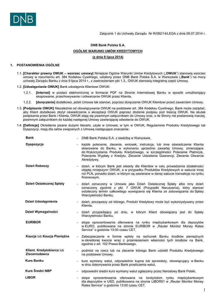 Załącznik 1 do Uchwały Zarządu Nr R/082/14/LEGA z dnia 09.07.2014 r. DNB Bank Polska S.A. OGÓLNE WARUNKI UMÓW KREDYTOWYCH (z dnia 9 lipca 2014) 1. POSTANOWIENIA OGÓLNE 1.1. [Charakter prawny OWUK – wzorzec umowy] Niniejsze Ogólne Warunki Umów Kredytowych („OWUK”) stanowią wzorzec umowy w rozumieniu art. 384 Kodeksu Cywilnego, ustalony przez DNB Bank Polska S.A. w Warszawie („Bank”) na mocy uchwały Zarządu Banku z dnia 9 lipca 2014 r., z zastrzeżeniem pkt 1.3., OWUK stanowią integralną część Umowy. 1.2. [Udostępnianie OWUK] Bank udostępnia Klientowi OWUK: 1.2.1. [Internet] w postaci elektronicznej w formacie PDF na Stronie Internetowej Banku w sposób umożliwiający skopiowanie, przechowywanie i odtwarzanie OWUK przez Klienta, 1.2.2. [doręczenie] dodatkowo, jeżeli Umowa tak stanowi, poprzez doręczenie OWUK Klientowi przed zawarciem Umowy. 1.3. [Podpisanie OWUK] Niezależnie od obowiązywania OWUK na podstawie art. 384 Kodeksu Cywilnego, Bank może zażądać, aby Klient dodatkowo złożył oświadczenie o akceptacji OWUK poprzez złożenie podpisu pod treścią OWUK. Na skutek podpisania przez Bank i Klienta, OWUK stają się pisemnym załącznikiem do Umowy oraz, o ile Strony nie postanowią inaczej, pisemnym załącznikiem do każdej następnej Umowy zawierającej odwołanie do OWUK. 1.4. [Definicje] Określenia pisane dużymi literami, użyte w Umowie, w tym w OWUK, Regulaminie Produktu Kredytowego lub Dyspozycji, mają dla celów związanych z Umową następujące znaczenie: Bank DNB Bank Polska S.A. z siedzibą w Warszawie, Dyspozycja każde polecenie, zlecenie, wniosek, instrukcja, lub inne oświadczenie Klienta skierowane do Banku, w wykonaniu uprzednio zawartej Umowy, zmierzające do Wykorzystania Produktu Kredytowego, w szczególności Polecenie Płatnicze, Polecenie Wypłaty z Kredytu, Zlecenie Udzielenia Gwarancji, Zlecenie Otwarcia Akredytywy, Dzień Roboczy dzień, w którym Bank jest otwarty dla Klientów w celu prowadzenia działalności objętej niniejszymi OWUK, a w przypadku Produktów Kredytowych w walucie innej niż PLN, ponadto dzień, w którym są zawierane w danej walucie transakcje na rynku finansowym, Dzień Ostatecznej Spłaty dzień oznaczony w Umowie jako Dzień Ostatecznej Spłaty albo inny dzień oznaczony zgodnie z pkt. 7 OWUK (Przypadki Naruszenia), który stanowi ostateczny termin całkowitego wywiązania się Klienta ze zobowiązania do Spłaty Wierzytelności Banku, Dzień Udostępnienia dzień, począwszy od którego, Produkt Kredytowy może być wykorzystywany przez Klienta, Dzień Wymagalności dzień przypadający po dniu, w którym Klient obowiązany jest do Spłaty Wierzytelności Banku, EURIBOR stopa oprocentowania oferowana na rynku międzybankowym dla depozytów w EURO, publikowana na stronie EURIBOR w „Reuter Monitor Money Rates Service” o godzinie 13:00 czasu CET, Kaucja lub Kaucja Pieniężna Zabezpieczenie w formie wpłaty na rachunek Banku środków pieniężnych w określonej kwocie wraz z przeniesieniem własności tych środków na Bank, zgodnie z art. 102 Prawa Bankowego, Klient, Kredytobiorca lub Zleceniodawca podmiot na rzecz lub na zlecenie którego Bank udzielił Produktu Kredytowego na podstawie Umowy, Kurs Banku kurs wymiany walut, odpowiednio kupna lub sprzedaży, obowiązujący w Banku w dniu dokonywania przez Bank przeliczenia walut, Kurs Średni NBP odpowiedni średni kurs wymiany walut ogłaszany przez Narodowy Bank Polski, LIBOR stopa oprocentowania oferowana na londyńskim rynku międzybankowym dla depozytów w USD, publikowana na stronie LIBOR01 w „Reuter Monitor Money Rates Service” o godzinie 13:00 czasu CET, 1 Limit Kredytowy lub Limit kompleksowa usługa finansowa świadczona przez Bank w wykonaniu Umowy o Limit Kredytowy, polegająca na umożliwieniu korzystania przez Klienta jednocześnie z wielu Produktów Kredytowych, do kwoty łącznego Zaangażowania Banku nie przekraczającej określonej w Umowie Kwoty Limitu, Lista Sankcji lista osób lub podmiotów publikowana w związku z Przepisami Sankcyjnymi przez lub w imieniu Organów Sankcyjnych, Ogólne Warunki Umów Kredytowych lub OWUK niniejsze „Ogólne Warunki Umów Kredytowych”, stanowiące integralną część Umowy, zawierające ogólne postanowienia Umowy mające zastosowanie do każdego Produktu Kredytowego udostępnianego przez Bank, niezależnie od jego rodzaju, Okres Kredytowania, Okres Finansowania lub Okres Obowiązywania Limitu okres rozpoczynający się od Dnia Udostępnienia do określonego w Umowie Dnia Ostatecznej Spłaty, Okres Odsetkowy okres określony w Umowie, w OWUK lub w Regulaminie Produktu Kredytowego, w którym naliczane są odsetki od kwoty Kredytu wykorzystanego i pozostającego do Spłaty, Okres Wykorzystania określony w Umowie okres, w którym Klient ma prawo do Wykorzystania Produktu Kredytowego, rozpoczynający się od Dnia Udostępnienia lub od innego dnia określonego w Umowie, Organ Sankcyjny Organizacja Narodów Zjednoczonych, Unia Europejska, Europejski Obszar Gospodarczy, państwa członkowskie Unii Europejskiej i Europejskiego Obszaru Gospodarczego, Stany Zjednoczone Ameryki Północnej, a także inne podmioty o podobnym charakterze oraz organy działające w ich imieniu w związku z Przepisami Sankcyjnymi, Podatek podatek, opłata skarbowa, cło, składka na ubezpieczenia społeczne lub inna danina publiczna, Podmiot Objęty Sankcjami podmiot: a) wpisany na Listę Sankcyjną (imiennie lub poprzez zaliczenie do określonej grupy); lub b) zamieszkujący, posiadający siedzibę lub główne miejsce działalności w kraju objętym Przepisami Sankcyjnymi albo utworzony pod rządami prawa kraju objętego Przepisami Sankcyjnymi; lub c) bezpośrednio lub pośrednio zależny od podmiotów, określonych pod lit. a) lub b) powyżej; lub d) z którym Bankowi Przepisy Sankcyjne zabraniają zawierania lub przeprowadzania transakcji, w szczególności umów o Produkty Kredytowe, Prawo Bankowe u