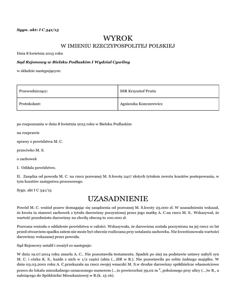 Sygn. akt: I C 341/15 WYROK W IMIENIU RZECZYPOSPOLITEJ POLSKIEJ Dnia 8 kwietnia 2015 roku Sąd Rejonowy w Bielsku Podlaskim I Wydział Cywilny w składzie następującym: Przewodniczący: SSR Krzysztof Prutis Protokolant: Agnieszka Konczerewicz po rozpoznaniu w dniu 8 kwietnia 2015 roku w Bielsku Podlaskim na rozprawie sprawy z powództwa M. C. przeciwko M. S. o zachowek I. Oddala powództwo. II. Zasądza od powoda M. C. na rzecz pozwanej M. S.kwotę 2417 złotych tytułem zwrotu kosztów postepowania, w tym kosztów zastępstwa procesowego. Sygn. akt I C 341/15 UZASADNIENIE Powód M. C. wniósł pozew domagając się zasądzenia od pozwanej M. S.kwoty 25.000 zł. W uzasadnieniu wskazał, że kwota ta stanowi zachowek z tytułu darowizny poczynionej przez jego matkę A. C.na rzecz M. S.. Wskazywał, że wartość przedmiotu darowizny na chwilę obecną to 100.000 zł. Pozwana wniosła o oddalenie powództwa w całości. Wskazywała, że darowizna została poczyniona na jej rzecz 10 lat przed otwarciem spadku zatem nie może być obecnie rozliczana przy ustalaniu zachowku. Nie kwestionowała wartości darowizny wskazanej przez powoda. Sąd Rejonowy ustalił i zważył co następuje: W dniu 19.07.2014 roku zmarła A. C.. Nie pozostawiła testamentu. Spadek po niej na podstawie ustawy nabyli syn M. C. i córka K. S., każde z nich w 1/2 części (akta (...)SR w B.). Nie pozostawiła po sobie żadnego majątku. W dniu 03.03.2001 roku A. C.przekazała na rzecz swojej wnuczki M. S.w drodze darowizny spółdzielcze własnościowe prawo do lokalu mieszkalnego oznaczonego numerem (...)o powierzchni 39,02 m 2, położonego przy ulicy (...)w B., a należącego do Spółdzielni Mieszkaniowej w B.(k. 15-16). Zgodnie z art. 991§1 kc zstępnym, małżonkowi oraz rodzicom spadkodawcy, którzy byliby powołani do spadku z ustawy, należą się, jeżeli uprawniony jest trwale niezdolny do pracy albo jeżeli zstępny uprawniony jest małoletni - dwie trzecie wartości udziału spadkowego, który by mu przypadał przy dziedziczeniu ustawowym, w innych zaś wypadkach - połowa wartości tego udziału (zachowek). W paragrafie drugim tego przepisu stwierdza się, że jeżeli uprawniony nie otrzymał należnego mu zachowku bądź w postaci uczynionej przez spadkodawcę darowizny, bądź w postaci powołania do spadku, bądź w postaci zapisu, przysługuje mu przeciwko spadkobiercy roszczenie o zapłatę sumy pieniężnej potrzebnej do pokrycia zachowku albo do jego uzupełnienia. Natomiast art. 1000§1 kc stanowi, że jeżeli uprawniony nie może otrzymać należnego mu zachowku od spadkobiercy lub osoby, na której rzecz został uczyniony zapis windykacyjny, może on żądać od osoby, która otrzymała od spadkodawcy darowiznę doliczoną do spadku, sumy pieniężnej potrzebnej do uzupełnienia zachowku. Jednakże obdarowany jest obowiązany do zapłaty powyższej sumy tylko w granicach wzbogacenia będącego skutkiem darowizny. Z powyższych przepisów wynika, że M. C.jest uprawniony do zachowku po swojej matce A. C.. Spadkodawczyni nie pozostawiła po sobie żadnego majątku, co nie było kwestionowane przez strony. Powód może dochodzić zachowku od osoby, która otrzymała darowiznę doliczoną do spadku. Zgodnie z art. 994§1 kc przy obliczaniu zachowku nie dolicza się do spadku drobnych darowizn, zwyczajowo w danych stosunkach przyjętych, ani dokonanych przed więcej niż dziesięciu laty, licząc wstecz od otwarcia spadku, darowizn na rzecz osób niebędących spadkobiercami albo uprawnionymi do zachowku. Nie może budzić wątpliwości, że darowizna na rzecz M. S.została dokonana przed więcej niż dziesięciu laty przed otwarciem spadku. Przy tym M. S.nie jest spadkobierczynią A. C., albowiem tymi są tylko jej dzieci M. C.i K. S., a które żyły w dacie otwarcia spadku. Wynika to wprost z postanowienia o stwierdzeniu nabycia spadku z dnia 21.01.2015 roku w sprawie (...)SR w B.. M. S.nie była też osobą uprawnioną do zachowku po A. S.. M. S.mogłaby być spadkobierczynią po A. S.wtedy, gdyby jej matka K. S.np. odrzuciła spadek lub została uznana za niegodną dziedziczenia. Artykuł 994 kc wskazuje jednak wyraźnie na spadkobierców nie zaś na możliwych potencjalnych spadkobierców. Taka interpretacja przepisu byłaby niedopuszczalna. Tak też SA w Katowicach (I ACa 605/13 - lex nr 1391907). Reasumując M. S. otrzymała darowiznę od A. C. w okresie dłuższym niż 10 lat pomiędzy datą dokonania darowizny (03.03.2001 r.), a momentem otwarcia spadku (19.07.2014 roku). Nie była jej spadkobierczynią ani nie była uprawniona do zachowku po niej. Dokonana na jej rzecz darowizna nie mogłaby być zatem doliczona do spadku przy obliczaniu zachowku. W związku z powyższym Sąd Rejonowy orzekł jak w sentencji wyroku na podstawie art. 991§1 kc, art. 994§1 kc, art. 1000§1 kc. O kosztach procesu w tym kosztach zastępstwa procesowego sąd orzekł zgodnie z zasadą odpowiedzialności za wynik procesu, na podstawie art. 98§1 kpc w zw. z art. 108§1 kpc oraz §6 pkt 5 rozporządzenia Ministra Sprawiedliwości z dnia 28 września 2002 r. w sprawie opłat za czynności adwokackie oraz ponoszenia przez Skarb Państwa kosztów nieopłaconej pomocy prawnej udzielonej z urzędu (Dz.U.2013.461 j.t.).