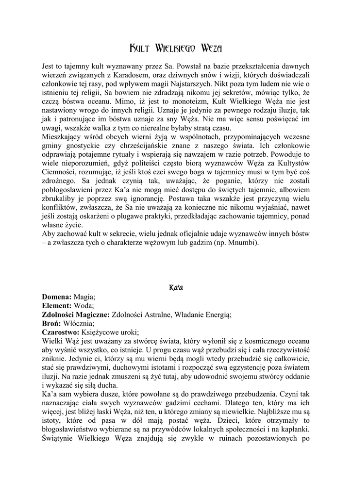 Kult Wielkiego Weza Jest to tajemny kult wyznawany przez Sa. Powstał na bazie przekształcenia dawnych wierzeń związanych z Karadosem, oraz dziwnych snów i wizji, których doświadczali członkowie tej rasy, pod wpływem magii Najstarszych. Nikt poza tym ludem nie wie o istnieniu tej religii, Sa bowiem nie zdradzają nikomu jej sekretów, mówiąc tylko, że czczą bóstwa oceanu. Mimo, iż jest to monoteizm, Kult Wielkiego Węża nie jest nastawiony wrogo do innych religii. Uznaje je jedynie za pewnego rodzaju iluzje, tak jak i patronujące im bóstwa uznaje za sny Węża. Nie ma więc sensu poświęcać im uwagi, wszakże walka z tym co nierealne byłaby stratą czasu. Mieszkający wśród obcych wierni żyją w wspólnotach, przypominających wczesne gminy gnostyckie czy chrześcijańskie znane z naszego świata. Ich członkowie odprawiają potajemne rytuały i wspierają się nawzajem w razie potrzeb. Powoduje to wiele nieporozumień, gdyż politeiści często biorą wyznawców Węża za Kultystów Ciemności, rozumując, iż jeśli ktoś czci swego boga w tajemnicy musi w tym być coś zdrożnego. Sa jednak czynią tak, uważając, że poganie, którzy nie zostali pobłogosławieni przez Ka’a nie mogą mieć dostępu do świętych tajemnic, albowiem zbrukaliby je poprzez swą ignorancję. Postawa taka wszakże jest przyczyną wielu konfliktów, zwłaszcza, że Sa nie uważają za konieczne nic nikomu wyjaśniać, nawet jeśli zostają oskarżeni o plugawe praktyki, przedkładając zachowanie tajemnicy, ponad własne życie. Aby zachować kult w sekrecie, wielu jednak oficjalnie udaje wyznawców innych bóstw – a zwłaszcza tych o charakterze wężowym lub gadzim (np. Mnumbi). Domena: Magia; Element: Woda; Zdolności Magiczne: Zdolności Astralne, Władanie Energią; Broń: Włócznia; Czarostwo: Księżycowe uroki; Wielki Wąż jest uważany za stwórcę świata, który wyłonił się z kosmicznego oceanu aby wyśnić wszystko, co istnieje. U progu czasu wąż przebudzi się i cała rzeczywistość zniknie. Jedynie ci, którzy są mu wierni będą mogli wtedy przebudzić się całkowicie, stać się prawdziwymi, duchowymi istotami i rozpocząć swą egzystencję poza światem iluzji. Na razie jednak zmuszeni są żyć tutaj, aby udowodnić swojemu stwórcy oddanie i wykazać się siłą ducha. Ka’a sam wybiera dusze, które powołane są do prawdziwego przebudzenia. Czyni tak naznaczając ciała swych wyznawców gadzimi cechami. Dlatego ten, który ma ich więcej, jest bliżej łaski Węża, niż ten, u którego zmiany są niewielkie. Najbliższe mu są istoty, które od pasa w dół mają postać węża. Dzieci, które otrzymały to błogosławieństwo wybierane są na przywódców lokalnych społeczności i na kapłanki. Świątynie Wielkiego Węża znajdują się zwykle w ruinach pozostawionych po Najstarszych. Wiele z nich mieści w sobie bajeczne skarby, do których należą także tajemnicze artefakty pozostawione przez Wężową Rasę. Kler Ka’a to prawie wyłącznie kobiety. Odziewają się one w tkaniny barwione na zielono i błękitno i noszą na sobie szeleszczące ozdoby z łusek morskich stworzeń. Właściwie nigdy nie opuszczają swych społeczności, w których pełnią także ważną rolę jako uzdrowicielki. Wszyscy wyznawcy Ka’a mają tendencję do śnienia dziwnych snów o przeszłości wężowej rasy, jeśli tylko zasną w pobliżu ruin lub artefaktu Najstarszych. To jak jasne są te sny i ile bohater zdoła z nich zrozumieć pozostawiam decyzji MG. Zwykle jednak mają one postać pogmatwanych i niejasnych wizji, które przez wyznawców często brane są za święte objawienia. Błogosławieństwo: Ka’a jako ”jedyny prawdziwy Bóg” ma wpływ na wiele dziedzin życia swych wyznawców. Kapłani rzucając błogosławieństwo mogą wybrać z trzech rodzajów: może ono zmieniać w automatyczny sukces każdy test Per. przeciwko Iluzji, każdy test związany z pływaniem, lub też każdy test SW związany z działaniami w snach. Oczywiście rodzaj błogosławieństwa należy wybrać przed modlitwą o nie.