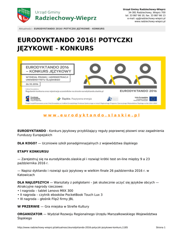 Urząd Gminy Radziechowy-Wieprz 34-381 Radziechowy, Wieprz 700 tel. 33 867 66 10, fax. 33 867 66 13 e-mail: [email protected] www.radziechowy-wieprz.pl Aktualności › EURODYKTANDO 2016! POTYCZKI JĘZYKOWE - KONKURS EURODYKTANDO 2016! POTYCZKI JĘZYKOWE - KONKURS www.eurodyktando.slaskie.pl EURODYKTANDO - Konkurs językowy przybliżający reguły poprawnej pisowni oraz zagadnienia Funduszy Europejskich DLA KOGO? — Uczniowie szkół ponadgimnazjalnych z województwa śląskiego ETAPY KONKURSU — Zarejestruj się na eurodyktando.slaskie.pl i rozwiąż krótki test on-line między 9 a 23 października 2016 r. — Napisz dyktando i rozwiąż quiz językowy w wielkim finale 26 października 2016 r. w Katowicach DLA NAJLEPSZYCH — Warsztaty z poliglotami – Jak skutecznie uczyć się języków obcych — Atrakcyjne nagrody rzeczowe: • I nagroda – tablet Lenovo MIIX 300 • II nagroda – czytnik ebooków PocketBook Touch Lux 3 • III nagroda – głośnik Flip2 firmy JBL W PRZERWIE — Gra miejska w Strefie Kultury ORGANIZATOR — Wydział Rozwoju Regionalnego Urzędu Marszałkowskiego Województwa Śląskiego http://www.radziechowy-wieprz.pl/aktualnosci/eurodyktando-2016-potyczki-jezykowe-konkurs,1185 Strona 1 Urząd Gminy Radziechowy-Wieprz 34-381 Radziechowy, Wieprz 700 tel. 33 867 66 10, fax. 33 867 66 13 e-mail: [email protected] www.radziechowy-wieprz.pl Aktualności › EURODYKTANDO 2016! POTYCZKI JĘZYKOWE - KONKURS PATRONAT GŁÓWNY — Instytut Języka Polskiego Uniwersytetu Śląskiego w Katowicach UDZIAŁ BEZPŁATNY! Regulamin konkursu oraz rejestracja uczestników na stronie eurodyktando.slaskie.pl Jednocześnie informujemy, że do Państwa placówki zostaną wysłane materiały promocyjny wraz z prośbą o ich dystrybucję na terenie Państwa placówki! Zachęcamy do umieszczania baneru i plakatu (w załącznikach) na swoich stronach internetowych i udostępniania wydarzenia stworzonego na portalu facebook na potrzeby Eurodyktanda! https://www.facebook.com/events/185720488535456/ Czekamy na zgłoszenia Państwa uczniów! Pozdrawiam, -Katarzyna Kupińska Dział organizacji SUN & MORE SP. Z O.O. ul. Rapackiego 8c 71-467 Szczecin, Poland tel. +48 91 488 01 70 mob. +48 666-899-764 www.sunmore.pl http://www.radziechowy-wieprz.pl/aktualnosci/eurodyktando-2016-potyczki-jezykowe-konkurs,1185 Strona 2