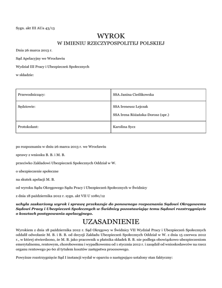 Sygn. akt III AUa 43/13 WYROK W IMIENIU RZECZYPOSPOLITEJ POLSKIEJ Dnia 26 marca 2013 r. Sąd Apelacyjny we Wrocławiu Wydział III Pracy i Ubezpieczeń Społecznych w składzie: Przewodniczący: SSA Janina Cieślikowska Sędziowie: SSA Ireneusz Lejczak SSA Irena Różańska-Dorosz (spr.) Protokolant: Karolina Sycz po rozpoznaniu w dniu 26 marca 2013 r. we Wrocławiu sprawy z wniosku B. B. i M. B. przeciwko Zakładowi Ubezpieczeń Społecznych Oddział w W. o ubezpieczenie społeczne na skutek apelacji M. B. od wyroku Sądu Okręgowego Sądu Pracy i Ubezpieczeń Społecznych w Świdnicy z dnia 18 października 2012 r. sygn. akt VII U 1080/12 uchyla zaskarżony wyrok i sprawę przekazuje do ponownego rozpoznania Sądowi Okręgowemu Sądowi Pracy i Ubezpieczeń Społecznych w Świdnicy pozostawiając temu Sądowi rozstrzygnięcie o kosztach postępowania apelacyjnego. UZASADNIENIE Wyrokiem z dnia 18 października 2012 r. Sąd Okręgowy w Świdnicy VII Wydział Pracy i Ubezpieczeń Społecznych oddalił odwołanie M. B. i B. B. od decyzji Zakładu Ubezpieczeń Społecznych Oddział w W. z dnia 15 czerwca 2012 r., w której stwierdzono, że M. B. jako pracownik u płatnika składek B. B. nie podlega obowiązkowo ubezpieczeniom emerytalnemu, rentowym, chorobowemu i wypadkowemu od 1 stycznia 2012 r. i zasądził od wnioskodawców na rzecz organu rentowego po 60 zł tytułem kosztów zastępstwa procesowego. Powyższe rozstrzygnięcie Sąd I instancji wydał w oparciu o następująco ustalony stan faktyczny: Wnioskodawca B. B. jest bratem wnioskodawczyni M. B.. Oboje mieszkają pod tym samym adresem, ale nie prowadzą wspólnego gospodarstwa domowego. B. B. od 9 października 2009 r. prowadzi działalność gospodarczą w zakresie handlu paliwami stałymi: węglem i pochodnymi, z zamiarem rozszerzenia prowadzonej działalności o międzynarodowy transport drogowy. Jednym z warunków rozszerzenia prowadzonej działalności gospodarczej było, aby zarządzaniem transportowym zajmowała się osoba posiadająca odpowiedni certyfikat. Do grudnia 2011 r. przepisy o transporcie drogowym nie wymagały zatrudniania osób posiadających certyfikat kompetencji zawodowych w międzynarodowym transporcie drogowym rzeczy. Wnioskodawca jako osoba karana nie mógł uzyskać takiego certyfikatu. Wnioskodawczyni M. B., w dniu 27 listopada 2010 r. zdała egzamin w zakresie wykonywania Międzynarodowego Transportu Drogowego uzyskując Certyfikat (...). Od stycznia 2005 r. do chwili obecnej wnioskodawczyni jest zatrudniona na podstawie umowy o pracę w pełnym wymiarze czasu pracy w Banku Spółdzielczym w K. jako członek zarządu. Ma nienormowany czas pracy. Jej wynagrodzenie wynosi 8.000,00 zł brutto plus dodatek funkcyjny, w zależności od decyzji rady. M. B. od początku prowadzenia działalności gospodarczej przez B. B. tj. od 2009 r. pomagała mu w jej prowadzeniu, w zakresie dotyczącym księgowości, bowiem posiada Certyfikat Księgowy Nr (...) r./ z dnia 20 października 2009 r. W dniu 1 stycznia 2012 r. B. B. zawarł z siostrą M. B. umowę o pracę na czas nieokreślony, na stanowisku księgowej - kierownika transportu, z wynagrodzeniem w wysokości 4.000,00 zł miesięcznie. Praca była wykonywana w ich miejscu zamieszkania. Wynagrodzenie wnioskodawczyni było ustalone wspólnie tzn. miedzy nią a B. B.. Kwota wynagrodzenia wiązała się z posiadaniem przez siostrę stosownego certyfikatu oraz prowadzeniem całej dokumentacji firmy. Do momentu nawiązania stosunku pracy z bratem, wnioskodawczyni pomagała mu. Przed podpisaniem umowy, jak i po jej podpisaniu wykonywała dokładnie te same czynności. Do umowy o pracę sporządzono pisemny zakres obowiązków, zgodnie z którym do obowiązków M. B. należało: prowadzenie księgowości firmy oraz zarządzanie transportem. M. B. przed zgłoszeniem do ubezpieczeń społecznych przez brata nie została poddana badaniu przez lekarza medycyny pracy i nie została przeszkolona w zakresie BHP. Posiadała aktualne zaświadczenie w tym zakresie z tytułu zatrudnienia w Banku Spółdzielczym w K.. M. B. posiada zaświadczenie o ukończeniu okresowego szkolenia w dziedzinie BHP pracodawców i innych osób kierujących pracownikami oraz zaświadczenie o uczestnictwie w seminarium w zakresie ochrony przeciwpożarowej. Wnioskodawczyni zajmowała się całą firmą (...) od strony finansowej, księgowej. Czynności tych dokonywała popołudniami, około 6 godzin dziennie. Pracę te musiała bowiem połączyć ze swoimi obowiązkami w Banku. Tak było do 6 lutego 2012 r. bowiem od dnia 7 lutego 2012 r. do dnia 1 czerwca 2012 r., czyli do dnia porodu, przebywała na zwolnieniu lekarskim. Od dnia 2 czerwca 2012 r. wnioskodawczyni jest na urlopie macierzyńskim. Z tytułu zatrudnienia M. B. płatnik składek złożył następujące dokumenty: zgłoszenie do ubezpieczeń społecznych: emerytalnego, rentowych, chorobowego i wypadkowego oraz ubezpieczenia zdrowotnego - ZUS ZDA z dnia 5 stycznia 2012 r. z datą powstania obowiązku ubezpieczeń od 1 stycznia 2012 r. - wpływ do organu rentowego 6 lutego 2012 r.; imienne raporty rozliczeniowe (ZUS RCA) za okres od stycznia 2012 r. do marca 2012 r. z wykazaną podstawą wymiaru składek na ubezpieczenia społeczne za miesiące: styczeń 2012 r. – 4.000 zł, luty 2012 r. - 800 zł, marzec 2012 r. - 0,00 zł; imienne raporty o wypłaconych świadczeniach i przerwach w opłacaniu składek (ZUS RSA) za miesiące: od lutego 2012 r. do maja 2012 r., w których wykazano okres: od 7 lutego 2012 r. do 10 marca 2012 r. z kodem świadczenia – przerwy – 331, oznaczającym wynagrodzenie za czas niezdolności do pracy, od 11 marca 2012 r. do 31 maja 2012 r. z kodem świadczenia 313, tj. zasiłek chorobowy z ubezpieczenia chorobowego. Od 7 lutego 2012 r. do 1 czerwca 2012 r., M. B. przebywała na zwolnieniu lekarskim, w związku z czym, na prowadzenie księgowości firmy, podpisana została przez B. B. umowa z Biurem (...). Wynagrodze