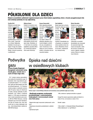 Widok ze Skarpy www.smnaskarpie.pl z osiedla 5 Półkolonie dla dzieci Małych uczestników półkolonii organizowanych przez Klub Zodiak zapytaliśmy, które z licznie przygotowanych dla nich atrakcji podobały im się najbardziej. Ewelina Król Półkolonie są bardzo fajne, podoba mi się ta forma spędzania wakacji, korzystam z niej już trzeci raz. Dzisiaj na przykład byliśmy w kinie na filmie „Auta2”. Super było też w Grakuli. Najbardziej podobała mi się tam gra w kręgle. W ciągu roku szkolnego chodzę na tańce do Klubu Zodiak, a zimą też uczestniczę w półkoloniach. Wiktoria Banel Podobał mi się bardzo marsz na orientację, dostaliśmy tam mapkę, na której zaznaczone były punkty z zadaniami. Najciekawsze było pytanie, o której godzinie zaczyna swój śpiew zięba. Wiedziałam, że o 4 nad ranem, bo wcześniej oglądaliśmy specjalną tabliczkę, na której były zapisane różne ważne informacje. Kacper Domeradzki Mnie najbardziej podobała się wizyta w Figlowisku, było tam dużo zabawek, najciekawsza była duża zjeżdżalnia i basen z piłkami. Na półkolonie zapisałem się ze swoimi kolegami, umówiliśmy się, że przyjdziemy tu razem. Uczestniczę w nich kolejny raz, jest tu mnóstwo atrakcji, w przyszłym roku też się pewnie zapiszę. Eryk Kudliński Bardzo fajnie było na Zamku Krzyżackim. Była tam studnia, w której leżał szkielet Krzyżaka oraz piwnica z mumiami i innymi potworkami. Dowiedziałem się o Krzyżakach, że mieszkali w wieży wysokiej na dwa wieżowce. Mieszkańcy Torunia ich nie lubili, zmobilizowali się i zniszczyli wieżę. Oliwia Sieradzka Podobał mi się wyjazd do stadniny koni „Młyńska Struga”. Pracownicy stadniny przedstawiali nam różne ciekawostki, na przykład dowiedziałam się, że przyrząd do czyszczenia kopyt koni nazywa się kopystka. Jeździłam na koniu, nie bałam się wcale, to łagodne i spokojne zwierzę. Polecam to miejsce innym dzieciom. Podwyżka Opieka nad dziećmi gazu w osiedlowych klubach Prezes Urzędu Regulacji Energetyki zatwierdził nową taryfę gazu, weszła ona w życie 15 lipca tego roku. Od 1 sierpnia zostaną wprowadzone nowe opłaty dla mieszkańców za gaz. W budynkach, które mają kotłownie gazowe podwyżka będzie o 7 %, a w budynkach, gdzie gaz doprowadzany jest tylko do kuchenek gazowych - 5 %. Kwotowo możemy przyjąć, że podwyżka wyniesie około 40 groszy więcej niż dotychczas od osoby, szacując podwyżkę na jedno mieszkanie, przy rodzinie 4-osobowej będzie to o 1,60 więcej niż dotychczas. Jest to taryfa zatwierdzona przez prezesa URE dla PGNiG Warszawa, stamtąd zakupujemy gaz, dla innych dystrybutorów gazu też wzrosły ceny, więc praktycznie jest to zmiana obejmująca cały kraj – mówi Andrzej Drożdż, dyrektor ds. GZM SM Na Skarpie. . Podczas zajęć w ramach Małego Zodiaczka mali mieszkańcy naszej spółdzielni nigdy się nie nudzą - Realizacja programu wychowania przedszkolnego z wykorzystaniem tradycyjnych i nowoczesnych metod oraz form pracy - Miła, serdeczna i spokojna atmosfera w grupach - Bogata oferta zajęć muzycznych, plastycznych, ruchowych - Organizacja uroczystości przedszkolnych z udziałem dzieci i zaproszonych gości Kontakt i zapisy: Uwaga! Do sierpnia zapewniamy opiekę nad dziećmi w wieku 3-5 lat, a od września w wieku 2-4 lat 1.Klub „Zodiak”, ul. Kardynała Stefana Wyszyńskiego 6 2.Klub „Vademecum”, ul. Ligi Polskiej 5
