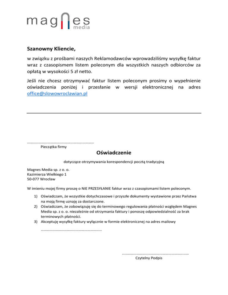 Szanowny Kliencie, w związku z prośbami naszych Reklamodawców wprowadziliśmy wysyłkę faktur wraz z czasopismem listem poleconym dla wszystkich naszych odbiorców za opłatą w wysokości 5 zł netto. Jeśli nie chcesz otrzymywać faktur listem poleconym prosimy o wypełnienie oświadczenia poniżej i przesłanie w wersji elektronicznej na adres [email protected] …………………………………………………………… Pieczątka firmy Oświadczenie dotyczące otrzymywania korespondencji pocztą tradycyjną Magnes Media sp. z o. o. Kazimierza Wielkiego 1 50-077 Wrocław W imieniu mojej firmy proszę o NIE PRZESYŁANIE faktur wraz z czasopismami listem poleconym. 1) Oświadczam, że wszystkie dotychczasowe i przyszłe dokumenty wystawione przez Państwa na moją firmę uznaję za dostarczone. 2) Oświadczam, że zobowiązuję się do terminowego regulowania płatności względem Magnes Media sp. z o. o. niezależnie od otrzymania faktury i ponoszę odpowiedzialność za brak terminowych płatności. 3) Akceptuję wysyłkę faktury wyłącznie w formie elektronicznej na adres mailowy ……………………………………………………… …………………………………………………………… Czytelny Podpis