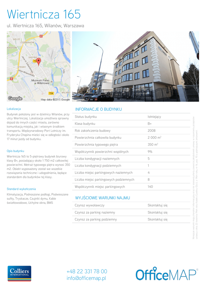 Wiertnicza 165 ul. Wiertnicza 165, Wilanów, Warszawa Lokalizacja Opis budynku Wiertnicza 165 to 5-piętrowy budynek biurowy klasy B+, posiadający około 1 750 m2 całkowitej powierzchni. Metraż typowego piętra wynosi 350 m2. Obiekt wyposażony został we wszelkie rozwiązania techniczne i udogodnienia, będące standardem dla budynków tej klasy. Standard wykończenia Klimatyzacja, Podnoszone podłogi, Podwieszane sufity, Tryskacze, Czujniki dymu, Kable światłowodowe, Uchylne okna, BMS Status budynku Istniejący Klasa budynku B+ Rok zakończenia budowy 2008 Powierzchnia całkowita budynku 2 000 m2 Powierzchnia typowego piętra 350 m2 Współczynnik powierzchni wspólnych 9% Liczba kondygnacji naziemnych 5 Liczba kondygnacji podziemnych 1 Liczba miejsc parkingowych naziemnych 4 Liczba miejsc parkingowych podziemnych 8 Współczynnik miejsc parkingowych 140 WYJŚCIOWE WARUNKI NAJMU Czynsz wywoławczy Skontaktuj się Czynsz za parking naziemny Skontaktuj się Czynsz za parking podziemny Skontaktuj się +48 22 331 78 00 [email protected] Niniejsze warunki mają charakter informacyjny oraz nie stanowią oferty zawarcia jakiejkolwiek umowy w rozumieniu przepisów ustawy z dnia 23 kwietnia 1964 roku Kodeks Cywilny (Dz.U. z 1964 roku, nr 16, poz. 93 z późniejszymi zmianami). INFORMACJE O BUDYNKU Budynek położony jest w dzielnicy Wilanów, przy ulicy Wiertniczej. Lokalizacja umożliwia sprawny dojazd do innych części miasta, zarówno komunikacją miejską, jak i własnym środkiem transportu. Międzynarodowy Port Lotniczy im. Fryderyka Chopina mieści się w odległości około 17 minut jazdy od budynku.