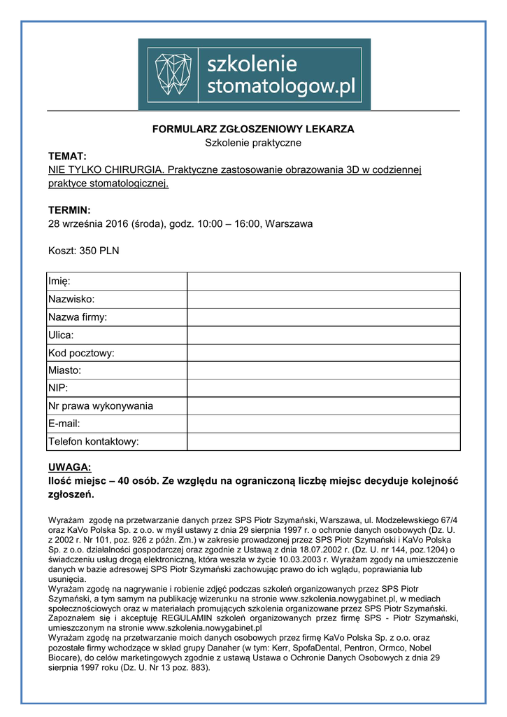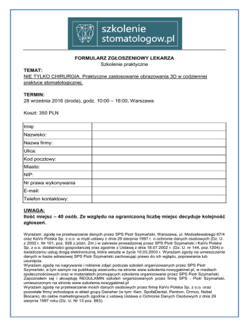 FORMULARZ ZGŁOSZENIOWY LEKARZA Szkolenie praktyczne TEMAT: NIE TYLKO CHIRURGIA. Praktyczne zastosowanie obrazowania 3D w codziennej praktyce stomatologicznej. TERMIN: 28 września 2016 (środa), godz. 10:00 – 16:00, Warszawa Koszt: 350 PLN Imię: Nazwisko: Nazwa firmy: Ulica: Kod pocztowy: Miasto: :NIP: Nr prawa wykonywania zawodu: E-mail: Telefon kontaktowy: UWAGA: Ilość miejsc – 40 osób. Ze względu na ograniczoną liczbę miejsc decyduje kolejność zgłoszeń. Wyrażam zgodę na przetwarzanie danych przez SPS Piotr Szymański, Warszawa, ul. Modzelewskiego 67/4 oraz KaVo Polska Sp. z o.o. w myśl ustawy z dnia 29 sierpnia 1997 r. o ochronie danych osobowych (Dz. U. z 2002 r. Nr 101, poz. 926 z późn. Zm.) w zakresie prowadzonej przez SPS Piotr Szymański i KaVo Polska Sp. z o.o. działalności gospodarczej oraz zgodnie z Ustawą z dnia 18.07.2002 r. (Dz. U. nr 144, poz.1204) o świadczeniu usług drogą elektroniczną, która weszła w życie 10.03.2003 r. Wyrażam zgody na umieszczenie danych w bazie adresowej SPS Piotr Szymański zachowując prawo do ich wglądu, poprawiania lub usunięcia. Wyrażam zgodę na nagrywanie i robienie zdjęć podczas szkoleń organizowanych przez SPS Piotr Szymański, a tym samym na publikację wizerunku na stronie www.szkolenia.nowygabinet.pl, w mediach społecznościowych oraz w materiałach promujących szkolenia organizowane przez SPS Piotr Szymański. Zapoznałem się i akceptuję REGULAMIN szkoleń organizowanych przez firmę SPS - Piotr Szymański, umieszczonym na stronie www.szkolenia.nowygabinet.pl Wyrażam zgodę na przetwarzanie moich danych osobowych przez firmę KaVo Polska Sp. z o.o. oraz pozostałe firmy wchodzące w skład grupy Danaher (w tym: Kerr, SpofaDental, Pentron, Ormco, Nobel Biocare), do celów marketingowych zgodnie z ustawą Ustawa o Ochronie Danych Osobowych z dnia 29 sierpnia 1997 roku (Dz. U. Nr 13 poz. 883). Wyrażam zgodę na przesyłanie informacji handlowych na wskazany adres poczty elektronicznej dotyczących produktów firmy KaVo Polska Sp. z o.o. oraz pozostałych firmy wchodzących w skład grupy Danaher (w tym: Kerr, SpofaDental, Pentron, Ormco, Nobel Biocare). REJESTRACJA UDZIAŁU W SZKOLENIACH - ZASADY: Zarejestruj się wypełniając poniższy FORMULARZ ZGŁOSZENIOWY LEKARZA. Po rejestracji otrzymasz mailem potwierdzenie zgłoszenia wraz z informacją o dalszych krokach. Wpłać pełną kwotę za szkolenie najpóźniej do 31 sierpnia 2016. Jeśli musisz zrezygnować z udziału po rejestracji, prześlij do organizatora pisemne oświadczenie, nie później niż 10 września 2016. W przeciwnym wypadku w razie rezygnacji zostanie pobrana opłata manipulacyjna w wysokości 100 zł. O rezerwacji miejsc decyduje kolejność wpłat. Jeśli masz pytania dotyczące szkoleń skontaktuj się z nami: Katarzyna Fernik-Jurek nr telefonu: +48 737 4444 73 Organizator zastrzegają sobie prawo do zmian w programie. Organizator zastrzegają sobie możliwość odwołania szkolenia z przyczyn niezależnych do dnia 18 września 2016 - wówczas wpłaty zostaną zwrócone, bez prawa żądania dodatkowego odszkodowania. …………………………………………………………………………………………………….. Data i podpis osoby zgłaszającej Kwotę opłaty za szkolenie prosimy wpłacić na konto organizatora: Numer konta: BZ WBK 37 oddział w Warszawie, 08 1500 1865 1218 6010 8933 0000 SPS, ul. Modzelewskiego 67 / 4 02-679 Warszawa z dopiskiem – imię i nazwisko osoby, której dotyczy opłata i termin szkolenia.