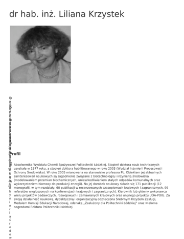 dr hab. inż. Liliana Krzystek N O a b u D sD k zz zi a tiIe rD e d n e żzcn d y a ih y zs n a u ciJina k n y ę cg n e o a p zira w ln iu e y :y e lk a i k u :sctn i Profil e h k k a ,ie c o n h m p Absolwentka Wydziału Chemii Spożywczej Politechniki Łódzkiej. Stopień doktora nauk technicznych w a in o :a u lci uzyskała w 1977 roku, a stopień doktora habilitowanego w roku 2003 (Wydział Inżynierii Procesowej i szck Ochrony Środowiska). W roku 2005 mianowana na stanowisko profesora PŁ. Obiektem jej aktualnych zo zainteresowań naukowych są zagadnienia związane z biotechnologią i inżynierią środowiska n k ,ia n w (modelowaniem przemian biochemicznych, unieszkodliwianiem stałych odpadów komunalnych oraz wykorzystaniem biomasy do produkcji energii). Na jej dorobek naukowy składa się 171 publikacji (12 :Iya c monografii, w tym rozdziały, 60 publikacji w recenzowanych czasopismach krajowych i zagranicznych, 99 n żh referatów wygłoszonych na konferencjach krajowych i zagranicznych). Kierownik lub główny wykonawca y wielu projektów badawczych, rozwojowych i zamawianych krajowych oraz unijnego projektu UDA-POIG. Za n swoją działalność naukową, dydaktyczną i organizacyjną odznaczona Srebrnym Krzyżem Zasługi, i Medalem Komisji Edukacji Narodowej, odznaką „Zasłużony dla Politechniki Łódzkiej” oraz wieloma e nagrodami Rektora Politechniki Łódzkiej. r i a ś r o d o w Ekspert w projektach Bioenergia dla Regionu Zintegrowan y Program Rozwoju Doktorantó w Strona CBI Pro-Akademia używa ciasteczek (cookies), dzięki którym nasz serwis może działać lepiej. Zobacz