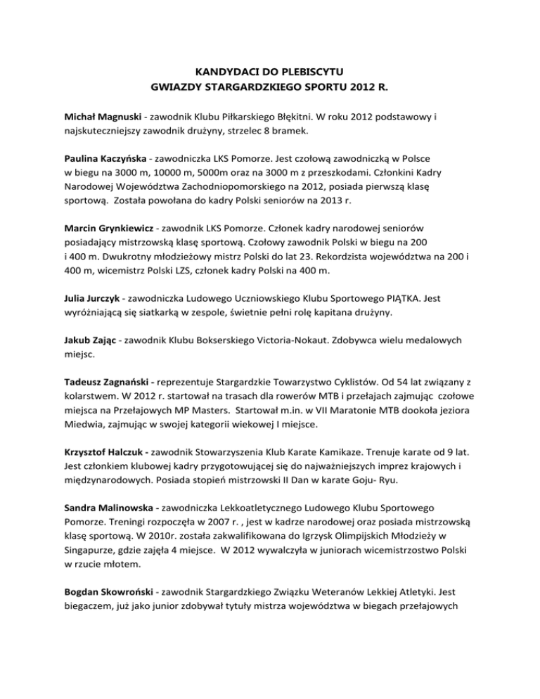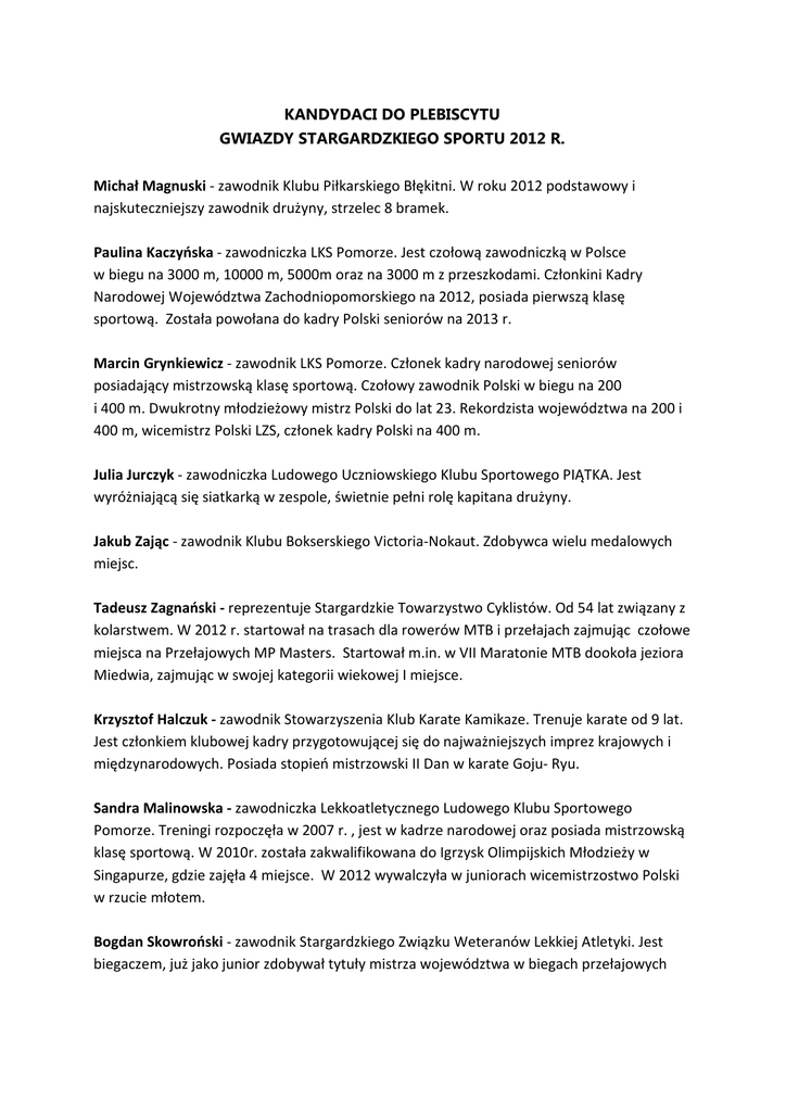 KANDYDACI DO PLEBISCYTU GWIAZDY STARGARDZKIEGO SPORTU 2012 R. Michał Magnuski - zawodnik Klubu Piłkarskiego Błękitni. W roku 2012 podstawowy i najskuteczniejszy zawodnik drużyny, strzelec 8 bramek. Paulina Kaczyńska - zawodniczka LKS Pomorze. Jest czołową zawodniczką w Polsce w biegu na 3000 m, 10000 m, 5000m oraz na 3000 m z przeszkodami. Członkini Kadry Narodowej Województwa Zachodniopomorskiego na 2012, posiada pierwszą klasę sportową. Została powołana do kadry Polski seniorów na 2013 r. Marcin Grynkiewicz - zawodnik LKS Pomorze. Członek kadry narodowej seniorów posiadający mistrzowską klasę sportową. Czołowy zawodnik Polski w biegu na 200 i 400 m. Dwukrotny młodzieżowy mistrz Polski do lat 23. Rekordzista województwa na 200 i 400 m, wicemistrz Polski LZS, członek kadry Polski na 400 m. Julia Jurczyk - zawodniczka Ludowego Uczniowskiego Klubu Sportowego PIĄTKA. Jest wyróżniającą się siatkarką w zespole, świetnie pełni rolę kapitana drużyny. Jakub Zając - zawodnik Klubu Bokserskiego Victoria-Nokaut. Zdobywca wielu medalowych miejsc. Tadeusz Zagnański - reprezentuje Stargardzkie Towarzystwo Cyklistów. Od 54 lat związany z kolarstwem. W 2012 r. startował na trasach dla rowerów MTB i przełajach zajmując czołowe miejsca na Przełajowych MP Masters. Startował m.in. w VII Maratonie MTB dookoła jeziora Miedwia, zajmując w swojej kategorii wiekowej I miejsce. Krzysztof Halczuk - zawodnik Stowarzyszenia Klub Karate Kamikaze. Trenuje karate od 9 lat. Jest członkiem klubowej kadry przygotowującej się do najważniejszych imprez krajowych i międzynarodowych. Posiada stopień mistrzowski II Dan w karate Goju- Ryu. Sandra Malinowska - zawodniczka Lekkoatletycznego Ludowego Klubu Sportowego Pomorze. Treningi rozpoczęła w 2007 r. , jest w kadrze narodowej oraz posiada mistrzowską klasę sportową. W 2010r. została zakwalifikowana do Igrzysk Olimpijskich Młodzieży w Singapurze, gdzie zajęła 4 miejsce. W 2012 wywalczyła w juniorach wicemistrzostwo Polski w rzucie młotem. Bogdan Skowroński - zawodnik Stargardzkiego Związku Weteranów Lekkiej Atletyki. Jest biegaczem, już jako junior zdobywał tytuły mistrza województwa w biegach przełajowych indywidualnie jak i drużynowo. W 1990 i 2000 r. zajmował w stargardzkich biegach ulicznych pierwsze miejsca. Obecnie uczestniczy w biegach, w których staje na podium w swojej kategorii wiekowej. Kacper Klupp - zawodnik Klubu Sportowego Unia. Jest podstawowym zawodnikiem drużyny, występuje na pozycji środkowego pomocnika i odpowiada za organizację gry zespołu. Berenika Emilia Prządka - zawodniczka Stargardzkiego Stowarzyszenia Karate Shobu- Kan. Karate jako dyscyplinę sportu uprawia od 9 lat, karierę sportowca rozpoczęła w wieku 14 lat. Była wielokrotną mistrzynią Polski, wicemistrzynią Europy i mistrzynią świata. Zawodniczka posiada klasę międzynarodową mistrzowską, jest aktualną reprezentantką kadry narodowej seniorów. Tomasz Stępień - jest podstawowym koszykarzem KS Spójnia od 2010 r. W 2012 r. był najlepszym zawodnikiem zdobywając średnio w meczu około 20 pkt. W kwietniu 2012 r. wraz z drużyną zajął w rozgrywkach I ligi koszykówki mężczyzn 6 miejsce. Jacek Łukaszewicz - zawodnik sekcji tenisa stołowego Amatorskiego Towarzystwa Sportowego. Jest najskuteczniejszym zawodnikiem pierwszego zespołu uczestniczącego w rozgrywkach III ligi tenisa stołowego. Grzegorz Magnuski - od najmłodszych lat reprezentuje barwy stargardzkiej Kluczevii. Wieloletni kapitan i główna postać zespołu. Swoimi 23 strzelonymi bramkami i postawą na boisku w sezonie 2009/2010 przyczynił się do awansu zespołu na czwartoligowe boiska, gdzie występuje do dziś. W marcu 2012 zwycięzca plebiscytu mediów na najlepszego piłkarza roku w czwartej lidze. Paulina Howis - zawodniczka Ludowego Klubu Sportowego Feniks. Trenuje zapasy od 8 lat. Jest członkiem kadry narodowej juniorek i posiada pierwszą klasę sportową. Jej największe osiągnięcie w 2012 r. to III miejsce w Międzynarodowych Mistrzostwach Polski Juniorek oraz V miejsce w Mistrzostwach Polski Juniorek.