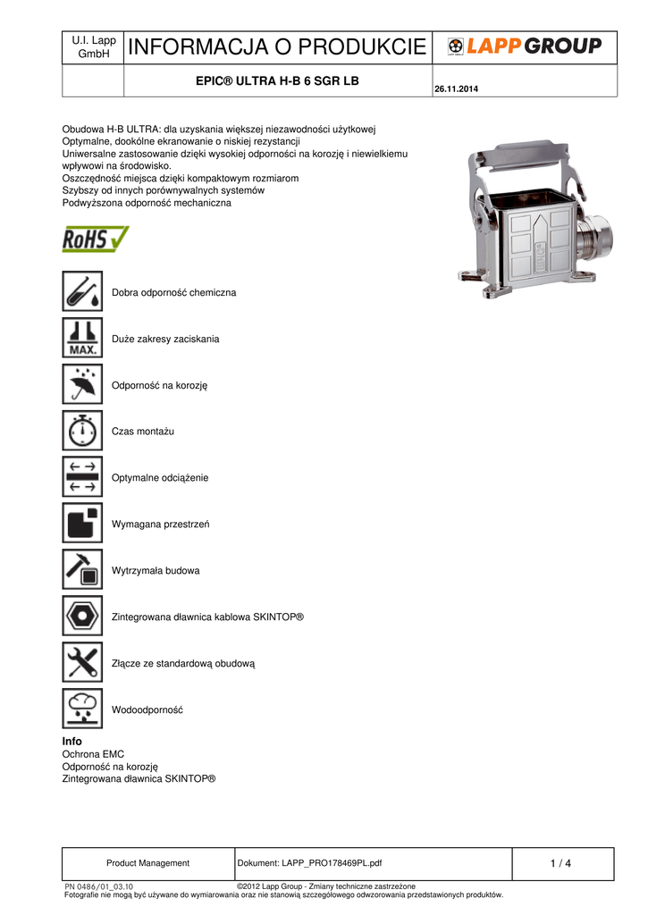 U.I. Lapp GmbH INFORMACJA O PRODUKCIE EPIC® ULTRA H-B 6 SGR LB 26.11.2014 Obudowa H-B ULTRA: dla uzyskania większej niezawodności użytkowej Optymalne, dookólne ekranowanie o niskiej rezystancji Uniwersalne zastosowanie dzięki wysokiej odporności na korozję i niewielkiemu wpływowi na środowisko. Oszczędność miejsca dzięki kompaktowym rozmiarom Szybszy od innych porównywalnych systemów Podwyższona odporność mechaniczna Dobra odporność chemiczna Duże zakresy zaciskania Odporność na korozję Czas montażu Optymalne odciążenie Wymagana przestrzeń Wytrzymała budowa Zintegrowana dławnica kablowa SKINTOP® Złącze ze standardową obudową Wodoodporność Info Ochrona EMC Odporność na korozję Zintegrowana dławnica SKINTOP® Product Management Dokument: LAPP_PRO178469PL.pdf ©2012 Lapp Group - Zmiany techniczne zastrzeżone PN 0486/01_03.10 Fotografie nie mogą być używane do wymiarowania oraz nie stanowią szczegółowego odwzorowania przedstawionych produktów. 1/4 U.I. Lapp GmbH INFORMACJA O PRODUKCIE EPIC® ULTRA H-B 6 SGR LB 26.11.2014 Zakres zastosowania W obszarach wrażliwych na zakłócenia elektromagnetyczne Do zastosowania w ruchomych i nieruchomych aplikacjach budowy maszyn oraz budowie elektrowni wiatrowych. Maszyny budowlane Napędy Cechy produktu Obudowy z oznaczeniem BRUSH wyposażone są w szczoteczkę do kontaktu z ekranem przewodu Kompatybilność ze standardowymi obudowami Odporność na korozję zgodnie z DIN EN 6988 Test w mgle solnej według IEC 68-2-52, stopień ostrości 2 Próba natryskiwania mgłą solną wg DIN EN ISO 9227, metoda NSS, czas trwania próby 480 godzin Wskazówka Fotografie nie mogą być używane do wymiarowania oraz nie stanowią szczegółowego odwzorowania przedstawionych produktów. Dane techniczne Materiał: Obudowa: ciśnieniowy odlew cynkowy, niklowany Klamra i bolce: stal szlachetna Uszczelnienie: NBR Dławnica kablowa Korpus: mosiądz niklowany Wkład: PA Pierścień uszczelniający: specjalny elastomer Stopień ochrony: IP 65 Zakres temperatury: Od -40°C do +100°C Product Management Dokument: LAPP_PRO178469PL.pdf ©2012 Lapp Group - Zmiany techniczne zastrzeżone PN 0486/01_03.10 Fotografie nie mogą być używane do wymiarowania oraz nie stanowią szczegółowego odwzorowania przedstawionych produktów. 2/4 Powered by TCPDF (www.tcpdf.org) 6 - 13 1 ULTRA H-B 6 SGR LB 9-17 9 - 17 1 70250209 ULTRA H-B 6 SGR LB 9-17 BRUSH 9 - 17 Product Management EPIC® ULTRA H-B 6 SGR LB Dokument: LAPP_PRO178469PL.pdf 26.11.2014 ©2012 Lapp Group - Zmiany techniczne zastrzeżone PN 0486/01_03.10 Fotografie nie mogą być używane do wymiarowania oraz nie stanowią szczegółowego odwzorowania przedstawionych produktów. Obudowa H-B: Obudowa gniazda cokołowa (1 wejście kablowe, klamra pojedyncza) INFORMACJA O PRODUKCIE ULTRA H-B 6 SGR LB 6-13 70250208 U.I. Lapp GmbH 1 70250207 6 Liczba sztuk w opakowaniu Zakres dławienia przewodów [mm] Minimalna średnica nad ekranem [mm] Oznaczenie produktu Numer artykułu 3/4 Powered by TCPDF (www.tcpdf.org) U.I. Lapp GmbH INFORMACJA O PRODUKCIE EPIC® ULTRA H-B 6 SGR LB Product Management 26.11.2014 Dokument: LAPP_PRO178469PL.pdf ©2012 Lapp Group - Zmiany techniczne zastrzeżone PN 0486/01_03.10 Fotografie nie mogą być używane do wymiarowania oraz nie stanowią szczegółowego odwzorowania przedstawionych produktów. 4/4