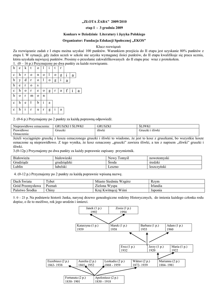 „ZŁOTA ŻABA” 2009/2010 etap I - 3 grudnia 2009 Konkurs w Dziedzinie Literatury i Języka Polskiego Organizator: Fundacja Edukacji Społecznej „EKOS” Klucz rozwiązań Za rozwiązanie zadań z I etapu można uzyskać 100 punktów. Warunkiem przejścia do II etapu jest uzyskanie 80% punktów z etapu I. W sytuacji, gdy żaden uczeń w szkole nie uzyska wymaganej ilości punktów, do II etapu kwalifikuje się praca ucznia, która uzyskała najwięcej punktów. Prosimy o przesłanie zakwalifikowanych do II etapu prac wraz z protokołem. 1. (0 – 16 p.) Przyznajemy po dwa punkty za każde rozwiązanie. h e k t o l i t r c h h c h h y e h o r d r o r o r o r m n o s e o o l l o o g g i i a a o n g r a f c h e ł b i a c h i r u r g i a i a 2. (0-6 p.) Przyznajemy po 2 punkty za każdą poprawną odpowiedź. Nieprawidłowe oznaczenia: Prawidłowe Oznaczenia: GRUSZKI I ŚLIWKI Gruszki ŚLIWKI Gruszki i śliwki GRUSZKI śliwki Jeżeli wyciągnięto gruszkę z kosza oznaczonego gruszki i śliwki to wiadomo, że jest to kosz z gruszkami, bo wszystkie kosze oznaczone są nieprawidłowo. Z tego wynika, że kosz oznaczony „gruszki” zawiera śliwki, a ten z napisem „śliwki” gruszki i śliwki. 3.(0-12p.) Przyznajemy po dwa punkty za każdy poprawnie zapisany przymiotnik. Białowieża Grudziądz Lublin białowieski grudziądzki lubelski Nowy Tomyśl Środa Leszno nowotomyski średzki leszczyński 4. (0-12 p.) Przyznajemy po 2 punkty za każdą poprawnie wpisaną nazwę. Dach Świata Gród Przemysława Państwo Środka Miasto Siedmiu Wzgórz Zielona Wyspa Kraj Kwitnącej Wiśni Tybet Poznań Chiny Rzym Irlandia Japonia 5. 0 – 23 p. Na podstawie historii Janka, narysuj drzewo genealogiczne rodziny Historycznych, do imienia każdego członka rodu dopisz, o ile to możliwe, rok jego urodzin i śmierci. Janek (1 p.) 1992 Katarzyna (1 p.) 1959 Zosia (1 p.) 1994 Marek (1 p.) 1958 Barbara (1 p.) 1955 Ewa (1 p.) 1932 Euzebiusz (2 p.) 1863- 1938 Aurelia (2 p.) 1865 - 1952 Fortunata (2 p.) 1830- 1901 Leokadia (2 p.) 1868 - 1959 Apoloniusz (2 p.) 1830 - 1918 Jerzy (1 p.) 1920 Wiktor (2 p.) 1872- 1939 Adam (1 p.) 1960 Maria (1 p.) 1922 Marianna (2 p.) 1884- 1981 Uwaga, punkty przyznajemy pod warunkiem podania kompletu informacji: imię, rok urodzin i śmierci (2 pkt.), imię, rok urodzenia (1 pkt.) – patrz rysunek. 6. (0-15 p.) Spiesz się powoli – za zapisane poprawnie zdanie przyznajemy 15 punktów, po 1 za każdą prawidłowo odgadniętą literę. 7. (0-16 p.) Za każde poprawnie przepisane zdanie przyznajemy 1 punkt. Nie przyznajemy punktów cząstkowych. 1. Dokonano ekranizacji powieści Carla Collodiego. 2. Przedstawiono go Terry’emu Pratchettowi. 3. Jechał samochodem Roalda Dahla. 4. Prowadził rozmowę z Agatą Christie. 5. Kilka lat po Pablu Picassie pojawił się nowy awangardowy artysta. 6. Napisał pracę o Caravaggiu. 7. Spotkał się z malarstwem Botticelliego. 8 . Wypłacono honorarium Leonardowi da Vinci. 9. Nakręcono dokument o Paulu Rubensie. 10. Była znajomą Umberta Eco. 11. Znalazł tam notatkę o Rembrandcie. 12. Posłużyli się pracami Marca Chagalla. 13. Arturowi Conan Doyle’owi nie spieszyło się na spotkanie. 14. Niestety, Edouarda Maneta nie było na wernisażu. 15. Był goszczony w domu Johna Ronalda Reuela Tolkiena. 16. O Vincencie van Goghu napisano już wiele.