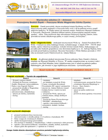ul. Limanowskiego 59/39 41-300 Dąbrowa Górnicza Tel. +48 502 248 250, Fax: +48 32 261 64 70 [email protected], www.utpstandard.com Wycieczka szkolna (3 – dniowa) Poznajemy Beskid Śląski – Pszczyna Wisła Węgierska Górka Żywiec Pszczyna – Zamek pszczyński, dawna rezydencja książąt Hochberg von Pless klasycystyczny pałac magnacki w Pszczynie który wraz z 48 ha parkiem tworzy zespół pałacowo-parkowy. W Zamku mieści się muzeum wnętrz: Państwowe Muzeum Zamkowe w Pszczynie, Zbrojownia. Zaledwie kilkaset metrów od pszczyńskiej starówki można spotkać... żubra. Taką możliwość daje odwiedzenie Pokazowej Zagrody Żubrów, która powstała na terenie zabytkowego parku, w części zwanej „Zwierzyniec”. Wisła – Węgierska Górka - atrakcjami turystycznymi Wisły są: Zamek Prezydenta RP w Wiśle - Czarnym na stoku Zadniego Gronia, wybudowanego w latach 1929 – 1931W skład Zamku, oprócz właściwej rezydencji, wchodzi również Zamek Dolny, funkcjonujący od początku jako budynek gospodarczy oraz drewniana kaplica p.w. św. Jadwigi Śląskiej, która powstała przed budową rezydencji. Skocznia Narciarska w Wiśle Malince powstała w 1933 roku na terenach Lasów Państwowych im. Adama Małysza Żywiec – do głównej atrakcji turystycznej Żywca zaliczmy Stary Zamek w którym znajduje się Muzeum Miejskie w Żywcu.. W zamku zorganizowane są wystawy stałe i czasowe, oraz Park Miniatur, który zlokalizowany jest w salach na parterze pałacu Habsburgów, jak również w jego najbliższym otoczeniu - żywieckim parku. Koszt wycieczki – 340,00 zł ( trzysta czterdzieści złotych ) Program wycieczki. – Termin do uzgodnienia Dzień I Dzień II - Wyjazd z miejsca zbiórki - śniadanie - Przyjazd do Pszczyny zwiedzanie - po śniadaniu wyjazd do WisłyZamku, Zbrojowni z przewodnikiem, Czarne, zwiedzanie Rezydencji Parku z oraz Zagrody Żubrów Prezydentów RP, zapory i przejazd do - przyjazd do ośrodka w Węgierskiej skoczni im. Adama Małysza wyjazd Górki O.W. „ŚWIERK”, kolejką linową i wejście na taras zakwaterowanie, obiadokolacja. widokowy - spacery po okolicy, dyskoteka - przyjazd do Wisły, spacery po - nocleg centrum miasta, zakupy drobnych pamiątek - Powrót do Domu Wycieczkowego ‘ŚWIERK”, obiadokolacja - ognisko z pieczeniem kiełbasek i ziemniaków, dodatki i herbata - nocleg Dzień III - śniadanie - wykwaterowanie, przejazd do Żywca - zwiedzanie Muzeum Miejskiego w Żywcu – Stary Zamek z przewodnikiem - spacer po parku zamkowym - obiad - powrót do domu (godziny wieczorne) Koszt wycieczki obejmuje: przejazd autokarem klasy turystycznej zakwaterowanie w ośrodku pokoje 2,3,4 osobowe z łazienkami, WC bilety wstępu do zwiedzanych obiektów opieka licencjonowanego przewodnika dwa noclegi (2 śniadania, 2 obiadokolacje, 1 obiad w restauracji w dniu powrotu) ognisko z pieczeniem kiełbasek i ziemniaków, dodatki, herbata, dyskoteka miejsce gratis dla opiekunów ( 1 opiekun na 15 dzieci) Uwaga: Każde dziecko obowiązkowo powinno posiadać legitymację szkolną.
