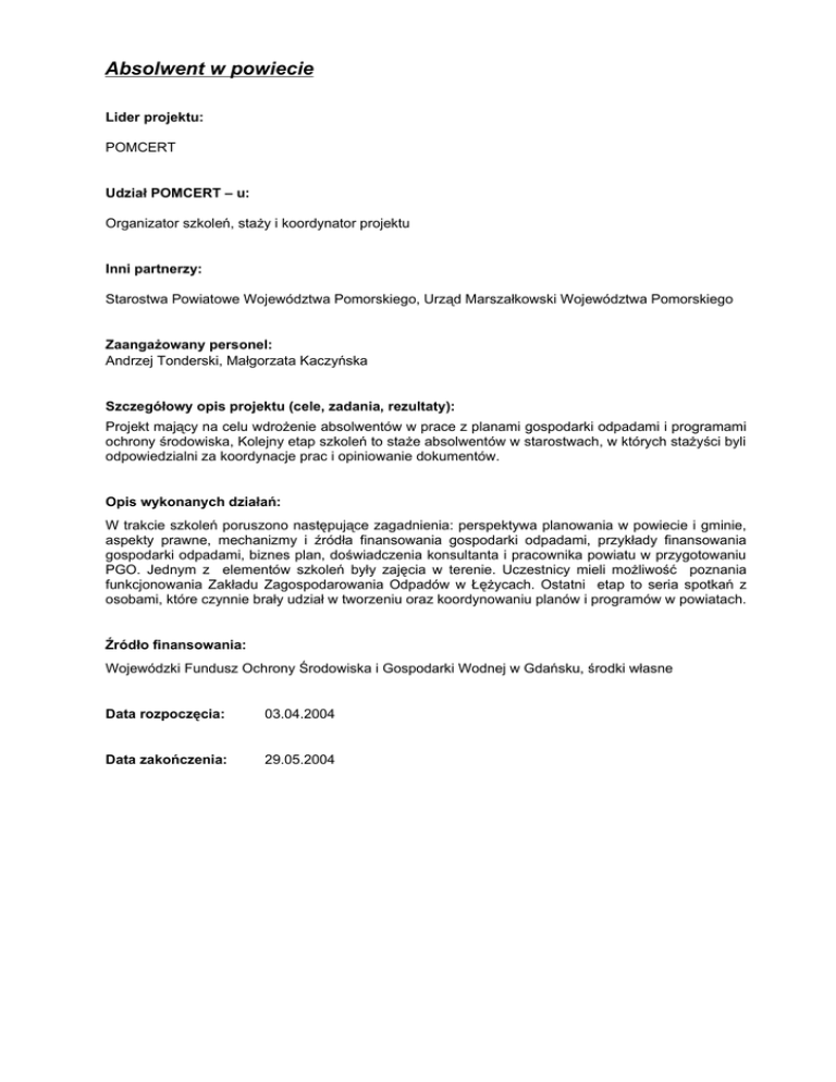 Absolwent w powiecie Lider projektu: POMCERT Udział POMCERT – u: Organizator szkoleń, staży i koordynator projektu Inni partnerzy: Starostwa Powiatowe Województwa Pomorskiego, Urząd Marszałkowski Województwa Pomorskiego Zaangażowany personel: Andrzej Tonderski, Małgorzata Kaczyńska Szczegółowy opis projektu (cele, zadania, rezultaty): Projekt mający na celu wdrożenie absolwentów w prace z planami gospodarki odpadami i programami ochrony środowiska, Kolejny etap szkoleń to staże absolwentów w starostwach, w których stażyści byli odpowiedzialni za koordynacje prac i opiniowanie dokumentów. Opis wykonanych działań: W trakcie szkoleń poruszono następujące zagadnienia: perspektywa planowania w powiecie i gminie, aspekty prawne, mechanizmy i źródła finansowania gospodarki odpadami, przykłady finansowania gospodarki odpadami, biznes plan, doświadczenia konsultanta i pracownika powiatu w przygotowaniu PGO. Jednym z elementów szkoleń były zajęcia w terenie. Uczestnicy mieli możliwość poznania funkcjonowania Zakładu Zagospodarowania Odpadów w Łężycach. Ostatni etap to seria spotkań z osobami, które czynnie brały udział w tworzeniu oraz koordynowaniu planów i programów w powiatach. Źródło finansowania: Wojewódzki Fundusz Ochrony Środowiska i Gospodarki Wodnej w Gdańsku, środki własne Data rozpoczęcia: 03.04.2004 Data zakończenia: 29.05.2004