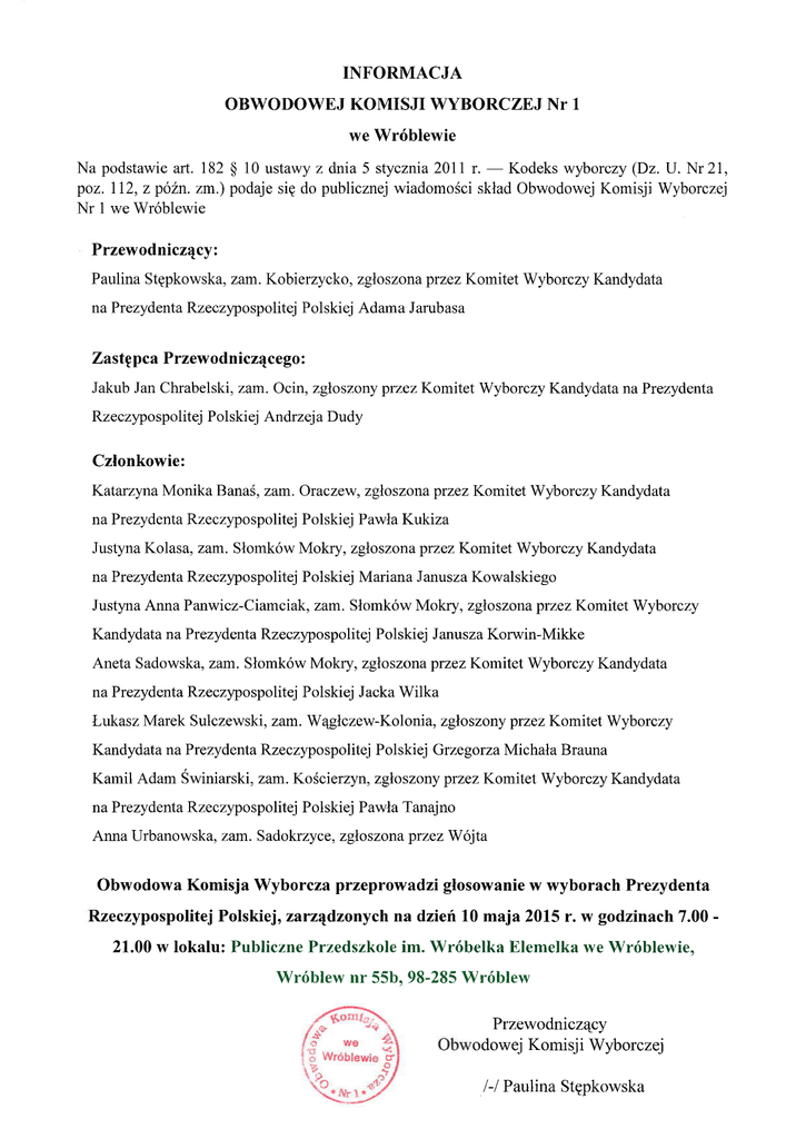 INFORMACJA OBWODOWEJ KOMISJI WYBORCZEJ Nr 1 we Wr6blewie Na podstawie art. 182 $ 10 ustawy z dnia 5 stycznia 20ll r. Kodeks wyborczy (Dz. U. Nr21, - Obwodowej Komisji Wyborczej poz. 7I2, z po2n. zm.) podaje siq do publicznej wiadomoSci sklad Nr 1 we Wroblewie Przewodnicz4cy: Paulina Stqpkowska,zam. Kobierzycko,zgLoszonaprzez Komitet Wyborczy Kandydata na Prezyde nta Rzeczypo spo Zastgpca P litej rzewodnicz4cego P ol ski ej Adam a J arub as a : Jakub Jan Chrabelski, zam. Ocin, zgloszony przez Komitet Wyborczy Kandydata naPrezydenta Rzeczypospolitej Polskiej Andrzeja Dudy Czlonkowie: Katarzyna Monika BanaS, zam. Oraczew, zgloszonaprzez Komitet Wyborczy Kandydata na Prezyde nta Rzeczy po spo litej P o I skiej P awla Kukiza Justyna Kolasa, zam. Slomk6w Mokry, zgLoszonaprzez Komitet Wyborczy Kandydata na Prezyde nta Rzeczypo spolitej P ol ski ej M ari ana J anusz a Kowal ski ego Justyna Anna Panwicz-Ciamciak, zam. Slomk6w Mokry, zgloszona przez Komitet Wyborczy Kandydata na Prezyden ta Rzeczypo spolitej Polskiej J anusz a Korwin-Mikke Aneta Sadowska, zam. Slomk6w Mokry,zgloszonaprzez Komitet Wyborczy Kandydata na Prezydenta Rzeczypospolitej Polskiej Jacka tr ukasz Wilka Marek Sulczewski, zam. W4glczew-Kolonia, zgloszony przez Komitet Wyborczy Kandydata na Prezyde nta Rzeczy po spolitej P o I skiej Grue gorza Michala Brauna Kamil Adam Swiniarski, zam. KoSci erzyn, zgloszony przez Komitet Wyborczy Kandydata na P rezyde rrta Rzeczy po spo litej P o I skiej Pawla Tanaj no Anna Urbanowska, zam. Sadokrzyce, zgloszonaprzez W6jta Obwodowa Komisja Wyborcza przeprowadzi glosowanie w wyborach Prezydenta Rzeczypospolitej Polskiej, zarz1dzonych na dzieft 10 maja 2015 r. w godzinach 7.00 21.00 w lokalu: Publiczne Przedszkole im. Wr6belka Elemelka we Wr6blewie. Wr6blew nr 55b,98-285 Wr6blew Przewodniczqcy odowej Komisj i Wyborczej l-lPaulina Stgpkowska INFORMACJA OBWODOWEJ KOMISJI WYBORCZEJ Nr 2 w Slomkowie Mokrym Na podstawie art. 182 $ 10 ustawy z dnia 5 stycznia 20ll r. Kodeks wyborczy (Dz. U. Nr 21, poz. ll2, z poln. zm.) podaje sip do publicznej wiadomoSci sklad Obwodowej Komisji Wyborczej Nr2wSlomkowieMokrvm Przewodnicz1cy: Maria Barbara Glinkowska, zam. Pr6chna, zgloszonaprzez Komitet Wyborczy Kandydata na Prezydenta Rzeczypospolitej Polskiej Bronislawa Komorowskiego Zastgpca Przewodnicz4cego : Emilia Maria Pietrzak, zam. Wr6blew, zgLoszonaprzez Komitet Wyborczy Kandydata na Pr ezy denta Rz e czypo sp o I i tej P o I ski ej Andr z ej a D udy Czlonkowie: Pawel Bartczak, zam. Tub4dzin, zgloszony pruez Komitet Wyborczy Kandydata naPrezydenta Rzeczypospolitej Polskiej Adama Jarubasa Pawel Piotr Dobruchowski, zam.Blilniew, zgloszony przez Komitet Wyborczy Kandydata na P rc zy denta Fize czy po sp o litej P o Isk i ej Gr ze gor za Mi c hal a B rauna Magdalena Kr6likowska, zam. Sadokrzyce , zgloszonaprzez Komitet Wyborczy Kandydata na Prezyde nta Rze czypo spolitej P ol skiej P awla Kukiza Kazimierz Stanislaw Mielczarek, zam. Ocin, zgloszony przez Komitet Wyborczy Kandydata na Prezyden ta Rzeczypo spo litej P ol skiej Magdaleny O g6rek Agni eszka Mielcz arek-Ko I asa, zam. S lomk6w Mokry, zgLo szona przez W6j ta Kamila Mikolajczyk, zam. Sgdzice, zgloszona przez Komitet Wyborczy Kandydata na Pr ezy denta Rz eczypo spo litej P olskiej Mari ana J anusza Kowal skiego Nina Joanna Resterniak, zam. Slomk6w Mokry, zgloszonaprzez Komitet Wyborczy Kandydata na Prezyde nta Rzeczypo spolitej P o I ski ej Jacka Wilka Obwodowa Komisja Wyborcza przeprowadzi glosowanie w wyborach Prezydenta Rzeczypospolitej Polskiej, zarzqdzonych na dzieri 10 maja 2015 r. w godzinach 7.00 21.00 w lokalu: Szkola Podstawowa w Slomkowie Mokrvm. Slomk6w Mokry nr 23,98-285 Wr6blew Przewodniczqcy Obwodowej Komisj i Wyborczej l-lMaria Glinkowska INFORMACJA OBWODOWEJ KOMISJI WYBORCZEJ Nr 3 w Charlupi Wielkiej Na podstawie art. 182 $ 10 ustawy z dnia 5 stycznia 20ll r. Kodeks wyborczy (Dz. U. Nr21, poz. II2, z p62n. zm.) podaje siE do publicznej wiadomo6ci sklad Obwodowej Komisji Wyborczej Nr3wCharlupiWielkiej Przewodnicz4cy: Katarzyna Marlyna Kuhn, zam. Slomk6w Suchy, zgNoszonaptzez Komitet Wyborczy Kandydata na Prezyde nta Rzeczypo spolitej P o I ski Zastgpca Przewodnicz4cego : ej Adam a J arub asa Kataruy na A gnie s zka Struzik, zam. W ryLczew-Kolo nia, zglo szona przez Komitet Wyborczy Kandydata na P r ezy denta Rzeczypo spolitej P ol skiej Gr ze gorza Michala B rauna Czlonkowie: Katar zy na Kar czmar ek, zam. S m ardz ew, zglo szona pr zez W 6j ta Karolina Dominika Katarzyniak, zam. Tworkowizna, zgloszonaprzez Komitet Wyborczy Kandydata na PrezydentaRzeczypospolitej Polskiej Bronislawa Komorowskiego Tomasz Jan Kr6l, zam.Dqbrowka, zgloszony przez Komitet Wyborczy Kandydata na Prezydenta Rzeczypospolitej Polskiej Andrzeja Dudy Marcin Kr6likowski, zam. Sadokrzyce, zgloszony przez Komitet Wyborczy Kandydata na Prezyde nta Fize czypo spolitej P ol skiej Pawtra Kuki za Patrycja Mikolajczyk, zam. Sgdzice, zgloszonaprzez Komitet Wyborczy Kandydata na Prezydenta Rzeczypospolitej Polskiej Mariana Janusza Kowalskiego Anna KaIarz5ma Socha, zam. Gqs6wka,zgloszonaprzez Komitet Wyborczy Kandydata na P rezydenta Rzeczypospolitej Polskiej Janusza Korwin-Mikke Magdalena Zaton, zam. Oraczew, zgloszonaprzez Komitet Wyborczy Kandydata na Prezydenta Rzeczypospolitej Polskiej Pawla Tanajno Obwodowa Komisja Wyborcza przeprowadzi glosowanie w wyborach Prezydenta Rzeczypospolitej Polskiej, zarz1dzonych na dzieri 10 maja 2015 r. w godzinach 7.00 21.00 w lokalu: Szkola Podstawowa w Charlupi Wielkiej, Charlupia Wielka nr 116,98-285 Wr6blew € *iv\ wa charlupi ,Q,_ wiett<ie; Q. ? f, "'"'4 Przewodniczqcy Obwodowej Komisj i Wyborczej l-lKatarzyna Kuhn INFORMACJA OBWODOWEJ KOMISJI WYBORCZEJ Nr 4 w W4glczewie Kodeks wyborczy (Dz. U. Nr21, Na podstawie art. 182 $ 10 ustawy z dnia 5 stycznia 20II r. poz. 172, z p62n. zm.) podaje sig do publicznej wiadomo$ci sklad Obwodowej Komisji Wyborczej Nr 4 w W4glczewie Przewodniczqcy: Henryk Jan Kobyle cki, zam. W4glczew-Kolonia, zgloszo
