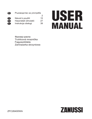BG Ръководство за употреба CS Návod k použití Használati útmutató Instrukcja obsługi HU PL Фризер-ракла Truhlicová mraznička Fagyasztóláda Zamrażarka skrzyniowa ZFC26400WA 2 15 27 39 Съдържание Информация за сигурност Инструкции за сигурност Действие Преди първата употреба Всекидневна употреба Препоръки и съвети 2 3 5 6 6 7 Грижи и почистване Отстраняване на неизправности Инсталиране Шумове Техническа информация 8 9 11 12 13 Запазваме си правото на изменения. Информация за сигурност Внимателно прочетете предоставените инструкции преди инсталиране и употреба на уреда. Производителят не носи отговорност за неправилно инсталиране и употреба, предизвикани от неправилно използване. Винаги запазвайте инструкциите с уреда за бъдещи справки. Безопасност за децата и хората с ограничени способности • • • • Този уред може да бъде използван от деца над 8 годишна възраст, както и лица с намалени физически, сетивни и умствени възможности или лица без опит и познания, само ако те са под наблюдение или бъдат инструктирани относно безопасната употреба на уреда и възможните рискове. Не позволявайте на децата да си играят с уреда. Почистването и поддръжката не трябва да се извършват от деца, ако не са под наблюдение. Съхранявайте всички опаковъчни материали далеч от деца. Общи мерки за безопасност • 2 Този уред е предназначен за употреба в домашни условия и подобни приложения като: – Селскостопански къщи; кухненски зони за персонал в магазини, офиси и други работни места – От клиенти в хотели, мотели, места за отдих и други места за живеене www.zanussi.com • • • • • • • • Не запушвайте вентилационните отвори от външната или вътрешната част на уреда. Не използвайте механични приспособления или други средства за ускоряване на процеса на размразяване, освен препоръчаните от производителя. Не повреждайте хладилната верига. Не използвайте електрически уреди, различни от типовете, препоръчани от производителя, вътре в отделенията за съхранение на хранителни продукти. Не почиствайте уреда чрез водна струя или пара. Почиствайте уреда с навлажнена мека кърпа. Използвайте само неутрални препарати. Не използвайте абразивни продукти, абразивни стъргалки, разтворители или метални предмети. Не съхранявайте в този уред експлозивни вещества като аерозолни флакони със запалимо гориво. Ако захранващият кабел е повреден, той трябва да се смени от производителя, неговият сервизен агент или лица със сходна квалификация, за да се избегне опасност. Инструкции за сигурност Монтаж ПРЕДУПРЕЖДЕНИЕ! Уредът трябва да се инсталира само от квалифицирани лица. • • • • • • Отстранете всички опаковки Не инсталирайте и не използвайте повреден уред. Спазвайте иструкциите за инсталиране, приложени към уреда. Винаги внимавайте, когато местите уреда, тъй като е тежък. Винаги носете предпазни ръкавици. Уверете се, че въздухът може да циркулира около уреда. Изчакайте поне 4 часа преди за свържете уреда към електрозахранването. Това ще позволи на смазката да потече обратно в компресора. www.zanussi.com • • • • • Не инсталирайте уреда близо до радиатори или печки, фурни или котлони. Задната част на уреда трябва да е до стената. Не инсталирайте уреда на места с пряка директна светлина. Не монтирайте този уред в зони, които са прекалено влажни или студени като строителни халета, гаражи или винарски изби. Когато местите корпуса, наклонете го на пред