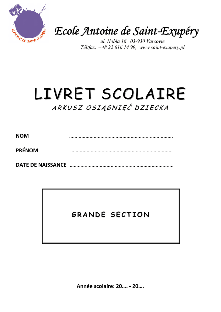 Ecole Antoine de Saint-Exupéry ul. Nobla 16 03-930 Varsovie Tél/fax: +48 22 616 14 99, www.saint-exupery.pl LIVRET SCOLAIRE ARKUSZ OSIĄGNIĘĆ DZIECKA NOM …………………………………………………………………. PRÉNOM ………………………………………………………………… DATE DE NAISSANCE …………………………………………………………………. GRANDE SECTION Année scolaire: 20…. - 20…. Comment lire ce livret ? Vous venez de recevoir le livret d’évaluation de votre enfant. Ce livret est rempli par les enseignants au cours de l’année et permet de suivre l’évolution de votre enfant tout le long de sa scolarité. A chaque fois qu’il est remis, il doit être impérativement rapporté signé à l’école. Merci de votre compréhension. Codes des appréciations Compétences au-delà du programme Compétences acquises Compétences à renforcer Compétences en cours d’acquisition Compétences non acquises A+ L’élève maîtrise ces compétences en dépassant les exigences du programme et s’en sert aisément. A L’élève maîtrise ces compétences dans différentes situations et les réinvestit. AR L’élève maîtrise ces compétences dans des situations privilégiées en cours d’apprentissage. CA L’élève a progressé mais les acquis restent partiels et fragiles. NA L’élève ne maîtrise pas ou que très rarement ces compétences. (*) Certaines cases peuvent être vides car elles correspondent à des notions qui n’ont pas été abordées en classe et le seront plus tard dans l’année ou dans la scolarité. Jak rozumieć ten arkusz ? Otrzymaliście Państwo Arkusz Ocen swojego dziecka. Arkusz Ocen jest wypełniany przez nauczyciela w trakcie roku szkolnego, co pozwala śledzić postępy w nauce. Po otrzymaniu, prosimy o podpis i zwrot do szkoły. Sposób kodowania obserwacji Znakomicie Bardzo dobrze Zadawalająco Wymaga poprawy Niezadawalająco A+ Uczeń wykonuje zadania wykraczające poza założenia programowe i biegle posługuje się zdobytymi wiadomościami. A Uczeń nabywa niezbędną wiedzę i umiejętności w zakresie założeń programowych i potrafi je w pełni stosować w różnych sytuacjach. AR Uczeń popełnia nieliczne błędy, wymaga czasami pomocy nauczyciela, posiada wiedzę w zakresie założeń programowych. CA Uczeń ma problemy z opanowaniem podstaw programowych, nie zawsze potrafi zastosować poznane wiadomosci i umiejętności w praktyce, wymaga pomocy nauczyciela. NA Uczeń nie opanował umiejętności wynikających z podstawy programowej. (*) Niektóre rubryki mogą być puste, ponieważ tematy zawarte w nich nie były oceniane.