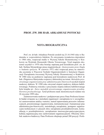 PROF. ZW. DR HAB. ARKADIUSZ POTOCKI NOTA BIOGRAFICZNA Prof. zw. dr hab. Arkadiusz Potocki urodził się 23.10.1945 roku w Radomsku w województwie łódzkim. Po otrzymaniu świadectwa dojrzałości w 1966 roku, rozpoczął studia w Wyższej Szkole Ekonomicznej w Krakowie na Wydziale Ekonomiki Obrotu Towarowego. Tytuł magistra ekonomii uzyskał w 1970 roku broniąc napisaną pod kierunkiem prof. zw. dr hab. Stefana Mynarskiego pracę magisterską pt.: Zastosowanie praw Engla w badaniu spożycia. W czerwcu 1972 roku rozpoczął pracę na stanowisku asystenta w Pracowni Technik Organizatorskich w Instytucie Organizacji Zarządzania ówczesnej Wyższej Szkoły Ekonomicznej w Krakowie. W 1980 roku na podstawie napisanej pod kierunkiem naukowym Prof. dr hab. Zbigniewa Martyniaka rozprawy doktorskiej na temat: Metodyka przestrzennego organizowania prac administracyjno-biurowych uzyskał stopień naukowy doktora. W 1990 roku otrzymał stopień naukowy doktora habilitowanego. Podstawą wniosku o przyznanie stopnia doktora habilitowanego była książka pt.: Zarys metodyki przestrzennego organizowania przedsiębiorstwa przemysłowego. Tytuł profesora nauk ekonomicznych nadano mu 26 stycznia 1999 roku. Zainteresowania naukowe i podejmowane przez Pana Profesora kierunki badań związane są z metodami organizacji i zarządzania (a w szczególności zastosowaniem analizy wartości, metod usprawniania procesów informacyjnych, przestrzennego organizowania, instrumentyzacji i humanizacji prac administracyjno-biurowych), metodologią zarządzania, postępem organizacyjno-technicznym w pracach sfery zarządzania przedsiębiorstwami, komunikacją w przedsiębiorstwie, zarządzaniem innowacyjno-partycypacyjnym, kulturą organizacyjną oraz zachowaniami organizacyjnymi. Obszerny dorobek naukowo-badawczy Pana Profesora obejmuje ponad 200 pozycji. Profe- 180 Nota biograficzna sor jest autorem i współautorem 180 prac naukowych – w tym 15 książek, 95 artykułów, 71 rozdziałów w monografiach i opracowaniach zwartych. W Uniwersytecie Ekonomicznym w Krakowie Profesor pełnił lub nadal pełni szereg funkcji. Ponadto w latach 1998-2003 piastował funkcję Prorektora w Wyższej Szkole Przedsiębiorczości i Marketingu w Chrzanowie. Oprócz aktywności związanej stricte z pracą na Uniwersytecie Profesor Potocki udzielał się – i nadal to czyni – w Radach Programowych i Kolegiach Redakcyjnych kilku ogólnopolskich periodyków naukowych, jak również w pracach Towarzystwa Naukowego Organizacji i Kierownictwa (TNOiK) oraz Komisji Nauk Organizacji i Zarządzania PAN. Od ponad dziesięciu lat nieprzerwanie pełni też funkcję eksperta w Państwowej Komisji Akredytacyjnej. Profesor był opiekunem ponad 400 prac licencjackich i magisterskich. Jest promotorem 6 zakończonych przewodów doktorskich. Opiniował 5 wniosków o nadanie tytułu naukowego profesora. Recenzował 4 rozprawy habilitacyjne i 17 prac doktorskich. Profesor Arkadiusz Potocki kilkunastokrotnie wyróżniony został nagrodami Rektora Uniwersytetu Ekonomicznego w Krakowie. Profesor odznaczony też został: – Medalem im. Karola Adamieckiego (1985). – Srebrnym Krzyżem Zasługi (1994). – Medalem Komisji Edukacji Narodowej (1996). – Złotym Krzyżem Zasługi (2000). Ze względu na przypadający w bieżącym roku jubileusz czterdziestolecia pracy zawodowej profesora Arkadiusza Potockiego pragniemy przedstawić jego dorobek naukowo-badawczy. Współpracownicy
