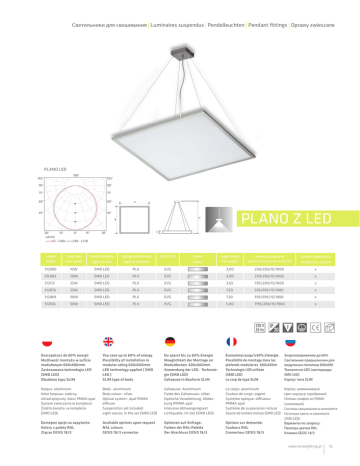 Светильники для свешивания Luminaires suspendus Pendelleuchten Pendant fittings Oprawy zwieszane PLANO LED 180° 105° 105° 90° 90° 75° 75° 60° 60° 45° 45° 30° 15° cd/km CO - C180 0° 15° PLANO Z LED 30° C9O - C270 index index max moc max power źródło światła light source rodzaj odbłyśnika type of reflector EVG/VVG 312090 10W SMD LED PLX 312083 20W SMD LED PLX 312113 25W SMD LED 312076 25W 312069 50W 312106 50W kolor colour waga netto net weight wymiary produktu product dimensions A/B/C/D system zwieszania suspension system EVG 3,00 250/250/15/1000 x EVG 3,00 250/250/15/1000 x PLX EVG 3,65 595/200/15/1000 x SMD LED PLX EVG 7,20 595/595/15/1000 x SMD LED PLX EVG 7,20 595/595/15/1000 x SMD LED PLX EVG 5,80 1195/200/15/1000 x 1 Oszczędzasz do 60% energii Możliwość montażu w suficie modułowym 600x600mm Zastosowana technologia LED (SMD LED) Obudowa typu SLIM You save up to 60% of energy Possibility of installation in modular celing 600x600mm LED technology applied ( SMD LED ) SLIM type of body Du sparst bis zu 60% Energie Moeglichkeit der Montage an Moduldecken 600x600mm Anwendung der LED - Technologie (SMD LED) Gehaeuse in Bauform SLIM Économisez jusqu’à 60% d’énergie Possibilité de montage dans les plafonds modulaires 600x600m Technologie LED utilisée (SMD LED) Le corp de type SLIM Энергосвережение до 60% Светильник предназначен для модульных потолков 600х600 Технология LED (светодиоды SMD LED) Корпус типа SLIM Korpus: aluminium Kolor korpusu: srebrny, Układ optyczny: klosz PMMA opal System zwieszania w komplecie Źródło światła: w komplecie (SMD LED) Body : aluminium Body colour : silver Optical system : opal PMMA diffuser Suspenstion set included Light source: in the set (SMD LED) Gehaeuse: Aluminium Farbe des Gehaeuses: silber Optische Verarbeitung: Abdeckung PMMA opal Inklusive Abhaengungsset Lichtquelle: im Set (SMD LED) Le corps: aluminium Couleur de corps: argent Systéme optique: diffuseur PMMA opal Système de suspension incluse Source de lumiére incluse (SMD LED) Dostepne opcje na zapytanie: Kolory z palety RAL Złącze GESIS 18/3 Available options upon request RAL colours GESIS 18/3 connector Optionen auf Anfrage: Farben der RAL-Palette Der Abschluss GESIS 18/3 Options sur demande: Couleurs RAL Connecteur GESIS 18/3 Корпус: алюминиевый Цвет корпуса: серебряный Оптика: плафон из PMMA (опаловый) Система свешивания в комплекте Источник света: в комплекте (SMD LED) Варианты по запросу: Палитра цветов RAL Клемма GESIS 18/3 www.lenalighting.pl 13
