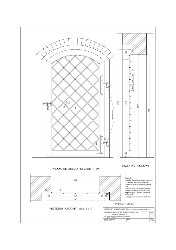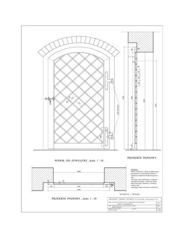 120 40 14 haki istniejące 1 1915 2100 1940 2180 1 15 10 15 10 120 120 120 26 88 30 120 50 400 50 PRZEKRÓJ PIONOWY WIDOK OD ZEWNĄTRZ , skala 1 : 10 UWAGI : -dzrwi wykonać z drewna dębowego i pozostawić w naturalnym kolorze -malować lakierem bezbarwnym na mat -zawiasy oraz zamknięcie wykonać metodą kowalską , malować farbą antykorozyjną i ftalową w kolorze czarny mat -istniejące haki zawiasów zachować 120 26 14 40 1000 965 120 53 1205 WYKONAĆ 1 SZTUKĘ PRZEKRÓJ POZIOMY , skala 1 : 10 ARCHITEKT TOMASZ CELEWICZ , 80-410 GDAŃSK , ul.Baczyńskiego 7A/10 Adres inwestycji: Kościół Św. Jana , Nadbałtyckie Centrum Kultury Gdańsk , ul. Świętojańska 50 rys. nr 3/14 Treść : Projekt wykonawczy drzwi od strony zaułka Widok i przekroje skala 1:10 Projektant : mgr inż. arch. Tomasz Celewicz Kreślił: data 11.2006. 120 120 120 147 10 147 10 1536 1830 7 haki istniejące 14 50 14 26 400 40 30 147 50 83 PRZEKRÓJ PIONOWY WIDOK OD ZEWNĄTRZ , skala 1 : 10 UWAGI : -dzrwi wykonać z drewna dębowego i pozostawić w naturalnym kolorze -malować lakierem bezbarwnym na mat -zawiasy oraz zamknięcie wykonać metodą kowalską , malować farbą antykorozyjną i ftalową w kolorze czarny mat -istniejące haki zawiasów zachować 48 120 14 26 40 1000 945 120 1185 WYKONAĆ 1 SZTUKĘ PRZEKRÓJ POZIOMY , skala 1 : 10 ARCHITEKT TOMASZ CELEWICZ , 80-410 GDAŃSK , ul.Baczyńskiego 7A/10 Adres inwestycji: Kościół Św. Jana , Nadbałtyckie Centrum Kultury Gdańsk , ul. Świętojańska 50 rys. nr 4/14 Treść : Projekt wykonawczy drzwi od strony zaułka Widok i przekroje skala 1:10 Projektant : mgr inż. arch. Tomasz Celewicz Kreślił: data 11.2006.