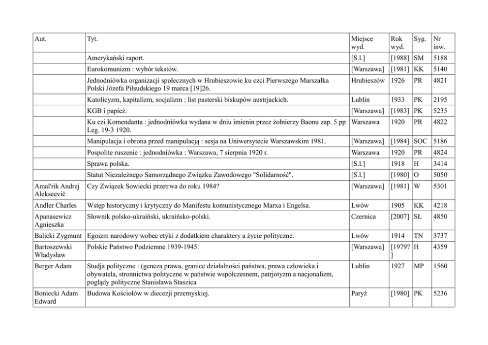 Aut. Tyt. Miejsce wyd. Rok wyd. Amerykański raport. [S.l.] [1988] SM 5188 Eurokomunizm : wybór tekstów. [Warszawa] [1981] KK 5140 Jednodniówka organizacji społecznych w Hrubieszowie ku czci Pierwszego Marszałka Polski Józefa Piłsudskiego 19 marca [19]26. Hrubieszów 1926 PR 4821 Katolicyzm, kapitalizm, socjalizm : list pasterski biskupów austrjackich. Lublin PK 2195 KGB i papież. [Warszawa] [1983] PK 5235 Ku czi Komendanta : jednodniówka wydana w dniu imienin przez żołnierzy Baonu zap. 5 pp Warszawa Leg. 19-3 1920. 1933 1920 Syg. PR Nr inw. 4822 Manipulacja i obrona przed manipulacją : sesja na Uniwersytecie Warszawskim 1981. [Warszawa] [1984] SOC 5186 Pospolite ruszenie : jednodniówka : Warszawa, 7 sierpnia 1920 r. Warszawa 1920 PR 4824 Sprawa polska. [S.l.] 1918 H 3414 Statut Niezależnego Samorządnego Związku Zawodowego "Solidarność". [S.l.] [1980] O 5050 Amal'rik Andrej Alekseevič Czy Związek Sowiecki przetrwa do roku 1984? [Warszawa] [1981] W 5301 Andler Charles Wstęp historyczny i krytyczny do Manifestu komunistycznego Marxa i Engelsa. Lwów 1905 KK 4218 Apanasewicz Agnieszka Słownik polsko-ukraiński, ukraińsko-polski. Czernica [2007] SŁ 4850 Balicki Zygmunt Egoizm narodowy wobec etyki z dodatkiem charaktery a życie polityczne. Lwów 1914 3737 Bartoszewski Władysław Polskie Państwo Podziemne 1939-1945. [Warszawa] [1979? H ] 4359 Berger Adam Studja polityczne : (geneza prawa, granice działalności państwa, prawa człowieka i obywatela, stronnictwa polityczne w państwie współczesnem, patrjotyzm a nacjonalizm, poglądy polityczne Stanisława Staszica Lublin 1927 MP 1560 Boniecki Adam Edward Budowa Kościołów w diecezji przemyskiej. Paryż [1980] PK 5236 TN Bronowicz Monika Komunikacja wizerunkowa : public relations, reklama, branding. Wrocław [2015] PRE 5517 Bronowicz Monika Komunikacja wizualna : public relations, reklama, branding. Wrocław [2013] PRE 4989 Brzeziński Zbigniew Polityka radziecka : od przyszłości do przeszłości? [Warszawa] [1984] MP 5220 Carnegie Andrew Państwo interesu. Warszawa ; Kraków PG 4384 Ciołkosz Adam Kartki z przeszłości. [Warszawa] [1981] MP 5221 Czernicki Kazimierz Moje myśli : jednodniówka : Chełm 30 maja 1937. Chełm 1937 PR 4568 Czernicki Kazimierz Myśl : jednodniówka : Chełm, dnia 26 kwietnia 1937 r. Chełm 1937 PR 4571 Czernicki Kazimierz Właściwe Zwierciadło : niezależne pismo demokratyczne : jednodniówka : Chełm, dn. 14 lipca 1929 r. Chełm 1929 PR 4580 Davies Norman Biały orzeł - czerwona gwiazda : wojna polsko-sowiecka 1919-1920. [Warszawa] [1988] H 5350 Dąbrowski Lucjan Ochotnik : jednodniówka : Łódź, dn. 25 lipca 1920 r. Łódź 1920 PR 4566 Dąbrowski Wincenty Kurjer Białostocki : jednodniówka : 27 lutego 1924 r. środa. Białystok 1924 PR 4610 Decking Joseph Akcja Katolicka czem jest i czego żąda. Radom 1931 O 4089 Delacroix J. Panjudaizm. Warszawa 1923 MP 3389 Dembiński Henryk Machiavelli a czasy dzisiejsze. Warszawa 1938 P 68 Deschamps Gaston Niedomagania demokracji. Kraków 1908 MP 3411 Dmowski Roman Anglja powojenna i jej polityka : uwagi ogólne. Warszawa 1926 SM 3396 Dmowski Roman Dziesięć lat walki : (zbiór prac i artykułów, publikowanych do 1905 r.). Częstochow 1938 MP 3408 1904 a Dmowski Roman Upadek myśli konserwatywnej w Polsce. Warszawa 1914 MP 3720 Drzewiecki Piotr Ustrój administracji państwowej i samorządowej w świetle naukowej organizacji pracy. Warszawa 1924 ST 4476 Engels Friedrich Rozwój socjalizmu od utopji do nauki. Warszawa 1905 KK 4223 Foerster Friedrich Wilhelm Etyka a polityka. Lwów 1926 P 4180 Forster Karol Studya polityczne i filozoficzne z przedmową Karola Forstera Cz. 2. Berlin 1866 MP 3733 Głowiński Michał Opis papieskiej podróży : [z problemów manipulacji językowej]. [Warszawa] [1983] SOC 5185 Gombrowicz Witold Przeciw poetom ; Sienkiewicz. [Warszawa] [1980] LI 5290 Gomułka Władysław Moje 14 lat : zwierzenia Władysława Gomułki. [S.l.] [1983] B 5037 Górski Ludwik Kazimierz Antoni W sprawie reformy rolnej w Polsce. Warszawa 1919 PG 4477 Grabski Stanisław Rewolucja : studium społeczno - psychologiczne. Warszawa 1921 MP 1926 Grabski Stanisław Uwagi o bieżącej historycznej chwili Polski. Warszawa 1922 MP 1927 Grabski Władysław Komasacya i praca kulturalna u nas. Warszawa 1912 MP 4090 Gross Jan Tomasz W zaborze sowieckim. [Warszawa] [1983] H 5338 Herbert Zbigniew Król mrówek : prywatna mitologia. Kraków [2014] LI 4907 Herling- Pietà dell'Isola. [Warszawa] [1981] LI 5260 Grudziński Gustaw HerlingGrudziński Gustaw Wieża [Warszawa] [1981] LI 5259 Hłasko Marek Piękni dwudziestoletni. [Warszawa] [1988] LI 5253 Hłasko Marek W dzień śmierci Jego ; Opowiem wam o Esther. [Warszawa] [1981] LI 5281 Hoene-Wroński Józef Maria Metapolityka. Warszawa 3413 Huntington Samuel P. Przyszłość demokracji. [Warszawa] [1985] MP 5224 Iranek-Osmecki Kazimierz Józef Piłsudski. [Warszawa] [1981] B 5225 Jankowski Leon Paweł Świt : jednodniówka polityczna, społeczna i literacka : Lublin, Niedziela dnia 13 lipca 1913 r. Lublin 1913 PR 4825 Jara Eugeniusz Idea państwa u Platona i jej dzieje. Warszawa ; Kraków 1918 P 3402 Jarkowski Stanisław, Zyglarski Władysław Naród sobie : jednodniówka zbiorowa Towarzystwa Literatów i Dziennikarzy Polskich : Warszawa, grudzień 1922 r. Warszawa 1922 PR 4703 Jaworski Władysław Leopold Ankieta o konstytucji z 17 marca 1921. Kraków 1924 PRA 98 Jędral Maria Głos pracownika umysłowego : jednodniówka : Warszawa wrzesień 1935. Warszawa 1935 PS Kania Dorota, Targalski Jerzy, Marosz Maciej Resortowe dzieci. Media. Warszawa [2013] KM 4789 Karczewska- Jednodniówka Młodej Polki. Poznań 1934 4570 1923 P PR 4464 Markiewicz Zofia, Niesiołowska Maria Kirkpatrick Jeane Fenomen polityki Ronalda Reagana. Jordan [Warszawa] [1989] B 5244 Kisielewski Stefan Bezsilność publicystyki ; O nadwiślańskim poplątaniu : (felietony zdjęte przez cenzurę). [Warszawa] [1983] FE 5193 Kisielewski 