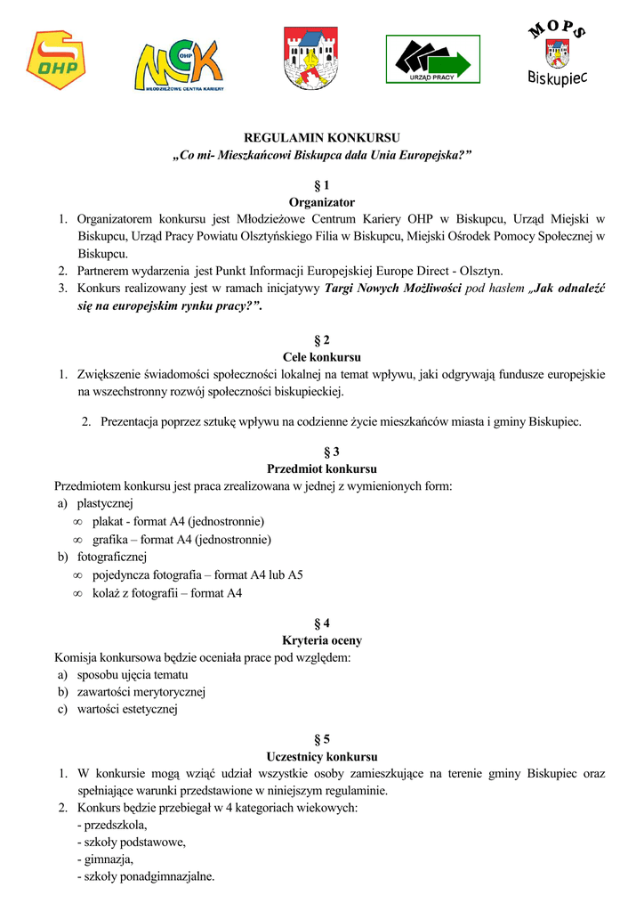 REGULAMIN KONKURSU „Co mi- Mieszkańcowi Biskupca dała Unia Europejska?” §1 Organizator 1. Organizatorem konkursu jest Młodzieżowe Centrum Kariery OHP w Biskupcu, Urząd Miejski w Biskupcu, Urząd Pracy Powiatu Olsztyńskiego Filia w Biskupcu, Miejski Ośrodek Pomocy Społecznej w Biskupcu. 2. Partnerem wydarzenia jest Punkt Informacji Europejskiej Europe Direct - Olsztyn. 3. Konkurs realizowany jest w ramach inicjatywy Targi Nowych Możliwości pod hasłem „Jak odnaleźć się na europejskim rynku pracy?”. §2 Cele konkursu 1. Zwiększenie świadomości społeczności lokalnej na temat wpływu, jaki odgrywają fundusze europejskie na wszechstronny rozwój społeczności biskupieckiej. 2. Prezentacja poprzez sztukę wpływu na codzienne życie mieszkańców miasta i gminy Biskupiec. §3 Przedmiot konkursu Przedmiotem konkursu jest praca zrealizowana w jednej z wymienionych form: a) plastycznej • plakat - format A4 (jednostronnie) • grafika – format A4 (jednostronnie) b) fotograficznej • pojedyncza fotografia – format A4 lub A5 • kolaż z fotografii – format A4 §4 Kryteria oceny Komisja konkursowa będzie oceniała prace pod względem: a) sposobu ujęcia tematu b) zawartości merytorycznej c) wartości estetycznej §5 Uczestnicy konkursu 1. W konkursie mogą wziąć udział wszystkie osoby zamieszkujące na terenie gminy Biskupiec oraz spełniające warunki przedstawione w niniejszym regulaminie. 2. Konkurs będzie przebiegał w 4 kategoriach wiekowych: - przedszkola, - szkoły podstawowe, - gimnazja, - szkoły ponadgimnazjalne. 1. 2. 3. 4. 1. 2. 3. 4. 5. §6 Etapy konkursu 01 marca - 18 kwietnia 2016r. - rozpowszechnienie informacji o konkursie 01 marca - 18 kwietnia 2016r. - przygotowanie i dostarczenie przez uczestników prac do siedziby Młodzieżowego Centrum Kariery OHP ul. Pionierów 6 w Biskupcu 19-20 kwietnia 2016r. - ocena prac konkursowych 22 kwietnia - wystawa prac połączona z oficjalnym wręczeniem nagród dla zwycięzców podczas Targów Nowych Możliwości pod hasłem „Jak odnaleźć się na europejskim rynku pracy?. §7 Nagrody Komisja konkursowa wyłoni: 3 laureatów zajmujących I, II i III miejsce w każdej z kategorii. Komisja konkursowa zastrzega sobie prawo do nie wręczenia nagród w poszczególnych kategoriach. Dla zdobywców trzech pierwszych miejsc organizatorzy przewidują nagrody rzeczowe . Wszyscy uczestnicy konkursu otrzymają dyplomy. Wyniki konkursu zostaną opublikowane na stronach internetowych Urzędu Miejskiego w Biskupcu, Warmińsko-Mazurskiej Wojewódzkiej Komendy Ochotniczych Hufców Pracy oraz Punktu Informacji Europejskiej Europe Direct - Olsztyn. §8 Postanowienia końcowe 1. Biorąc udział w konkursie, uczestnicy akceptują zasady zawarte w niniejszym regulaminie. 2. Udział w konkursie jest bezpłatny i dobrowolny. 3. Każdy uczestnik może zgłosić tylko jedną pracę konkursową. 4. Praca konkursowa musi na odwrocie zawierać metryczkę z imieniem, nazwiskiem, numerem telefonu autora oraz jeżeli uczestnik uczy się w systemie dziennym, również klasę i nazwę szkoły do której uczęszcza. 5. Praca nie będzie oceniana w przypadku, gdy dotrze do organizatora po terminie, będzie uszkodzona lub nie będzie zawierała metryczki o której mowa w § 8 pkt 4. 6. Do konkursu mogą być zgłaszane tylko prace wykonane indywidualnie i osobiście przez Uczestnika. 7. Uczestnik konkursu wyraża zgodę na wykorzystywanie swojego wizerunku i danych osobowych w środkach masowego przekazu i publikacjach wraz z informacją o konkursie. 8. Prace nie odebrane do końca czerwca 2016 r. ulegną zniszczeniu. 9. Organizator zastrzega sobie prawo do bezpłatnej prezentacji i publikacji prac. 10. Organizator nie ponosi odpowiedzialności za uszkodzenie prac podczas wystawy oraz po jej zakończeniu do momentu odbioru przez uczestnika. 11. Rozstrzygnięcie konkursu wraz z wręczeniem nagród laureatom nastąpi 22 kwietnia 2016r. o godz. 11.00 podczas Targów Nowych Możliwości pod hasłem „Jak odnaleźć się na europejskim rynku pracy?, które odbędą się na Hali Widowiskowo-Sportowej, ul. Aleja Broni 10 w Biskupcu. 12. Laureaci 3 pierwszych miejsc w każdej kategorii wiekowej zostaną powiadomieni telefonicznie o wygranej. 13. Osoby nieobecne podczas wręczania nagród będą miały możliwość ich odbioru Młodzieżowym Centrum Kariery OHP ul. Pionierów 6 w Biskupcu.