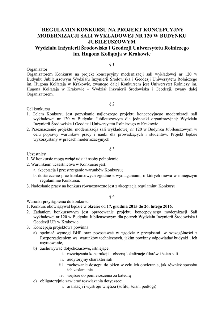 `REGULAMIN KONKURSU NA PROJEKT KONCEPCYJNY MODERNIZACJI SALI WYKŁADOWEJ NR 120 W BUDYNKU JUBILEUSZOWYM Wydziału Inżynierii Środowiska i Geodezji Uniwersytetu Rolniczego im. Hugona Kołłątaja w Krakowie §1 Organizator Organizatorem Konkursu na projekt koncepcyjny modernizacji sali wykładowej nr 120 w Budynku Jubileuszowym Wydziału Inżynierii Środowiska i Geodezji Uniwersytetu Rolniczego im. Hugona Kołłątaja w Krakowie, zwanego dalej Konkursem jest Uniwersytet Rolniczy im. Hugona Kołłątaja w Krakowie – Wydział Inżynierii Środowiska i Geodezji, zwany dalej Organizatorem. §2 Cel konkursu 1. Celem Konkursu jest pozyskanie najlepszego projektu koncepcyjnego modernizacji sali wykładowej nr 120 w Budynku Jubileuszowym dla jednostki organizacyjnej: Wydziału Inżynierii Środowiska i Geodezji Uniwersytetu Rolniczego w Krakowie. 2. Przeznaczenie projektu: modernizacja sali wykładowej nr 120 w Budynku Jubileuszowym w celu poprawy warunków pracy i nauki dla prowadzących i studentów. Projekt będzie wykorzystany w pracach modernizacyjnych. §3 Uczestnicy 1. W konkursie mogą wziąć udział osoby pełnoletnie. 2. Warunkiem uczestnictwa w Konkursie jest: a. akceptacja i przestrzeganie warunków Konkursu; b. dostarczenie prac konkursowych zgodnie z wymaganiami, o których mowa w niniejszym regulaminie Konkursu. 3. Nadesłanie pracy na konkurs równoznaczne jest z akceptacją regulaminu Konkursu. §4 Warunki przystąpienia do konkursu 1. Konkurs obowiązywał będzie w okresie od 17. grudnia 2015 do 26. lutego 2016. 2. Zadaniem konkursowym jest opracowanie projektu koncepcyjnego modernizacji Sali wykładowej nr 120 w Budynku Jubileuszowym dla potrzeb Wydziału Inżynierii Środowiska i Geodezji UR w Krakowie. 3. Koncepcja projektowa powinna: a) spełniać wymogi BHP oraz pozostawać w zgodzie z przepisami, w szczególności z Rozporządzeniem ws. warunków technicznych, jakim powinny odpowiadać budynki i ich usytuowanie, b) zachowywać dotychczasowe, istniejące: i. rozwiązania konstrukcji – obecną lokalizację filarów i ścian sali ii. audytoryjny charakter sali iii. zachowanie dostępu do okien w celu ich otwierania, jak również sposobu ich zasłaniania iv. wejście do pomieszczenia za katedrą c) obligatoryjnie zawierać rozwiązania dotyczące: i. aranżacji i wystroju wnętrza (sufitu, ścian, podłogi) ii. materiałów zgodnych z przepisami (m. in. przeciwpożarowymi) iii. wejść do sali (uwzględniających wymogi ewakuacji) iv. katedry ze stanowiskiem komputerowym oraz multimedialnym v. siedzeń i dojść do nich vi. balustrad vii. kącika z umywalką 4. Na konkurs każdy uczestnik może nadesłać maksymalnie 2 projekty modernizacji. Każdy projekt modernizacji musi spełniać następujące warunki: a) projekt powinien być oryginalny, b) projekty mogą być wykonane w dowolnej technice projektowej. Każdy projekt należy dostarczyć w wersji elektronicznej (na płycie CD, DVD jako pliki: CAD lub inne) oraz w postaci wydruków komputerowych. c) Projekt modernizacji powinien składać się co najmniej z: rzutu w skali 1:20 z naniesionymi podstawowymi wymiarami oraz wizualizacji 3D. 5. Projekt powinien być przedstawiony w wersji kolorowej. 6. Prace konkursowe powinny być wykonane samodzielnie przez uczestników Konkursu i powinny być wolne od wad prawnych oraz wcześniej nienagradzane w innych konkursach. Prace konkursowe mogą być pracą zbiorową. Prace konkursowe powinny być podpisane na odwrocie imieniem i nazwiskiem lub imionami i nazwiskami twórcy/twórców. 7. Prace konkursowe w zaklejonej kopercie należy złożyć osobiście w dziekanacie lub przesłać za pośrednictwem poczty polskiej na adres: Wydział Inżynierii Środowiska i Geodezji Uniwersytetu Rolniczego w Krakowie al. Adama Mickiewicza 24/28, 30 – 059 Kraków. Termin składania prac konkursowych upływa 26. lutego 2016 r. Na kopercie musi znaleźć się napis: „Konkurs na projekt koncepcyjny modernizacji sali wykładowej nr 120 w Budynku Jubileuszowym WIŚiG UR w Krakowie”. W kopercie należy umieścić także wypełnioną kartę zgłoszeniową. 8. Organizator nie zwraca nadesłanych prac konkursowych. 9. Niespełnienie przez uczestnika warunków formalnych lub technicznych określonych w tym paragrafie może spowodować odrzucenie pracy konkursowej przez Organizatora. §5 Rozstrzygnięcie konkursu 1. Nad prawidłowym przebiegiem Konkursu będzie czuwać Komisja Konkursowa, w której skład wchodzi 10 osób. 2. Organizator powołuje Komisję Konkursową, która dokonuje oceny prac oraz przyznaje nagrody i wyróżnienia. 3. Z każdego posiedzenia Komisji Konkursowej zostaje spisany protokół, który jest podpisywany przez wszystkich obecnych na posiedzeniu członków Komisji Konkursowej. Dokumentacja z posiedzenia Komisji Konkursowej przechowywana jest w siedzibie Organizatora. 4. Komisja Konkursowa podejmuje decyzje większością głosów. W przypadku równej liczby głosów decyduje głos Przewodniczącego. 5. Decyzje Komisji Konkursowej są ostateczne. §6 Nagrody 1. Laureaci otrzymają dyplomy a także podarunki pamiątkowe. 2. Przyznana zostanie 1 nagroda główna (oraz 2 wyróżnienia). Jeden uczestnik może otrzymać tylko nagrodę lub tylko wyróżnienie, niezależnie od ilości zgłoszonych projektów. 3. Laureat oraz osoby wyróżnione w konkursie otrzymają nagrody rzeczowe. §7 Ogłoszenie wyników i promocja laureatów 1. Ogłoszenie wyników Konkursu nastąpi w dniu 2. marca 2016r. a zwycięzca Konkursu zostanie powiadomiony drogą mailową i telefoniczną o rozstrzygnięciu Konkursu. 2. Organizatorzy Konkursu zastrzegają sobie możliwość podawania do publicznej wiadomości informacji o laureacie Konkursu. 3. Wyniki Konkursu a także wyróżnione prace zostaną zaprezentowane na stronie internetowej Wydziału Inżynierii Środowiska i Geodezji Uniwersytetu Rolniczego. §8 Prawa autorskie Każdy uczestnik konkursu zobowiązany jest do podpisania oświadczenia o pr