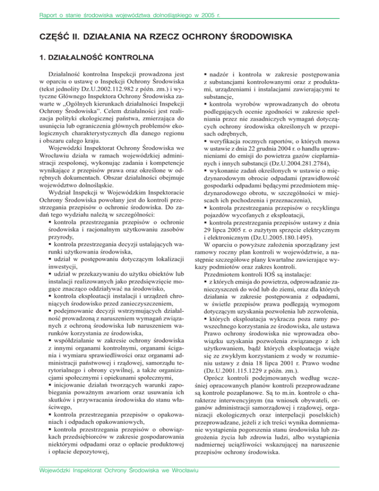 Raport o stanie rodowiska województwa dolnol¹skiego w 2005 r. CZÊÆ II. DZIA£ANIA NA RZECZ OCHRONY RODOWISKA 1. DZIA£ALNOÆ KONTROLNA Dzia³alnoæ kontrolna Inspekcji prowadzona jest w oparciu o ustawê o Inspekcji Ochrony rodowiska (tekst jednolity Dz.U.2002.112.982 z pón. zm.) i wytyczne G³ównego Inspektora Ochrony rodowiska zawarte w Ogólnych kierunkach dzia³alnoci Inspekcji Ochrony rodowiska. Celem dzia³alnoci jest realizacja polityki ekologicznej pañstwa, zmierzaj¹ca do usuniêcia lub ograniczenia g³ównych problemów ekologicznych charakterystycznych dla danego regionu i obszaru ca³ego kraju. Wojewódzki Inspektorat Ochrony rodowiska we Wroc³awiu dzia³a w ramach wojewódzkiej administracji zespolonej, wykonuj¹c zadania i kompetencje wynikaj¹ce z przepisów prawa oraz okrelone w odrêbnych dokumentach. Obszar dzia³alnoci obejmuje województwo dolnol¹skie. Wydzia³ Inspekcji w Wojewódzkim Inspektoracie Ochrony rodowiska powo³any jest do kontroli przestrzegania przepisów o ochronie rodowiska. Do zadañ tego wydzia³u nale¿¹ w szczególnoci: § kontrola przestrzegania przepisów o ochronie rodowiska i racjonalnym u¿ytkowaniu zasobów przyrody, § kontrola przestrzegania decyzji ustalaj¹cych warunki u¿ytkowania rodowiska, § udzia³ w postêpowaniu dotycz¹cym lokalizacji inwestycji, § udzia³ w przekazywaniu do u¿ytku obiektów lub instalacji realizowanych jako przedsiêwziêcie mog¹ce znacz¹co oddzia³ywaæ na rodowisko, § kontrola eksploatacji instalacji i urz¹dzeñ chroni¹cych rodowisko przed zanieczyszczeniem, § podejmowanie decyzji wstrzymuj¹cych dzia³alnoæ prowadzon¹ z naruszeniem wymagañ zwi¹zanych z ochron¹ rodowiska lub naruszeniem warunków korzystania ze rodowiska, § wspó³dzia³anie w zakresie ochrony rodowiska z innymi organami kontrolnymi, organami cigania i wymiaru sprawiedliwoci oraz organami administracji pañstwowej i rz¹dowej, samorz¹du terytorialnego i obrony cywilnej, a tak¿e organizacjami spo³ecznymi i opiekunami spo³ecznymi, § inicjowanie dzia³añ tworz¹cych warunki zapobiegania powa¿nym awariom oraz usuwania ich skutków i przywracania rodowiska do stanu w³aciwego, § kontrola przestrzegania przepisów o opakowaniach i odpadach opakowaniowych, § kontrola przestrzegania przepisów o obowi¹zkach przedsiêbiorców w zakresie gospodarowania niektórymi odpadami oraz o op³acie produktowej i op³acie depozytowej, § nadzór i kontrola w zakresie postêpowania z substancjami kontrolowanymi oraz z produktami, urz¹dzeniami i instalacjami zawieraj¹cymi te substancje, § kontrola wyrobów wprowadzanych do obrotu podlegaj¹cych ocenie zgodnoci w zakresie spe³niania przez nie zasadniczych wymagañ dotycz¹cych ochrony rodowiska okrelonych w przepisach odrêbnych, § weryfikacja rocznych raportów, o których mowa w ustawie z dnia 22 grudnia 2004 r. o handlu uprawnieniami do emisji do powietrza gazów cieplarnianych i innych substancji (Dz.U.2004.281.2784), § wykonanie zadañ okrelonych w ustawie o miêdzynarodowym obrocie odpadami (prawid³owoæ gospodarki odpadami bêd¹cymi przedmiotem miêdzynarodowego obrotu, w szczególnoci w miejscach ich pochodzenia i przeznaczenia), § kontrola przestrzegania przepisów o recyklingu pojazdów wycofanych z eksploatacji, § kontrola przestrzegania przepisów ustawy z dnia 29 lipca 2005 r. o zu¿ytym sprzêcie elektrycznym i elektronicznym (Dz.U.2005.180.1495). W oparciu o powy¿sze za³o¿enia sporz¹dzany jest ramowy roczny plan kontroli w województwie, a nastêpnie szczegó³owe plany kwartalne zawieraj¹ce wykazy podmiotów oraz zakres kontroli. Przedmiotem kontroli IO s¹ instalacje: § z których emisja do powietrza, odprowadzanie zanieczyszczeñ do wód lub do ziemi, oraz dla których dzia³ania w zakresie postêpowania z odpadami, w wietle przepisów prawa podlegaj¹ wymogom dotycz¹cym uzyskania pozwolenia lub zezwolenia, § których eksploatacja wykracza poza ramy powszechnego korzystania ze rodowiska, ale ustawa Prawo ochrony rodowiska nie wprowadza obowi¹zku uzyskania pozwolenia zwi¹zanego z ich u¿ytkowaniem, b¹d których eksploatacja wi¹¿e siê ze zwyk³ym korzystaniem z wody w rozumieniu ustawy z dnia 18 lipca 2001 r. Prawo wodne (Dz.U.2001.115.1229 z pón. zm.). Oprócz kontroli podejmowanych wed³ug wczeniej opracowanych planów kontroli przeprowadzane s¹ kontrole pozaplanowe. S¹ to m.in. kontrole o charakterze interwencyjnym (na wniosek obywateli, organów administracji samorz¹dowej i rz¹dowej, organizacji ekologicznych oraz interpelacji poselskich) przeprowadzane, je¿eli z ich treci wynika domniemanie wyst¹pienia pogorszenia stanu rodowiska lub zagro¿enia ¿ycia lub zdrowia ludzi, albo wyst¹pienia nadmiernej uci¹¿liwoci wskazuj¹cej na naruszenie przepisów ochrony rodowiska. Wojewódzki Inspektorat Ochrony rodowiska we Wroc³awiu Raport o stanie rodowiska województwa dolnol¹skiego w 2005 r. Przeprowadzane s¹ równie¿ pozaplanowe kontrole zwi¹zane z oddaniem do u¿ytku nowo zbudowanego lub zmodernizowanego obiektu budowlanego, zespo³u obiektów lub instalacji realizowanych jako przedsiêwziêcie mog¹ce znacz¹co oddzia³ywaæ na rodowisko, o których mowa w art. 51 ust. 1 ustawy Prawo ochrony rodowiska (Dz.U.2001.62.627 z pón. zm.). Kontrole pozaplanowe sprawdzaj¹ce podejmowane s¹ w przypadkach powiadomienia o ustaniu naruszenia, które uprzednio skutkowa³o wydaniem decyzji administracyjnej lub w przypadku wniosku o wyra¿enie zgody na oddanie do eksploatacji obiektu budowlanego, którego oddanie do u¿ytku zosta³o wstrzymane, lub o wyra¿enie zgody na podjêcie wstrzymanej dzia³alnoci albo podjêcie wstrzymanego u¿ytkowania instalacji. Kontrole pozaplanowe przeprowadzane s¹ równie¿ w razie koniecznoci wydania zawiadczeñ niezbêdnych do uzyskania zezwoleñ m.in. w zakresie: § przetwarzania surowca tytoniowego, § wytwarzania wyrobów tytoniowych, § wyrobu, oczyszczania, ska¿enia lub odwadniania spirytusu, § wyrobu lub 