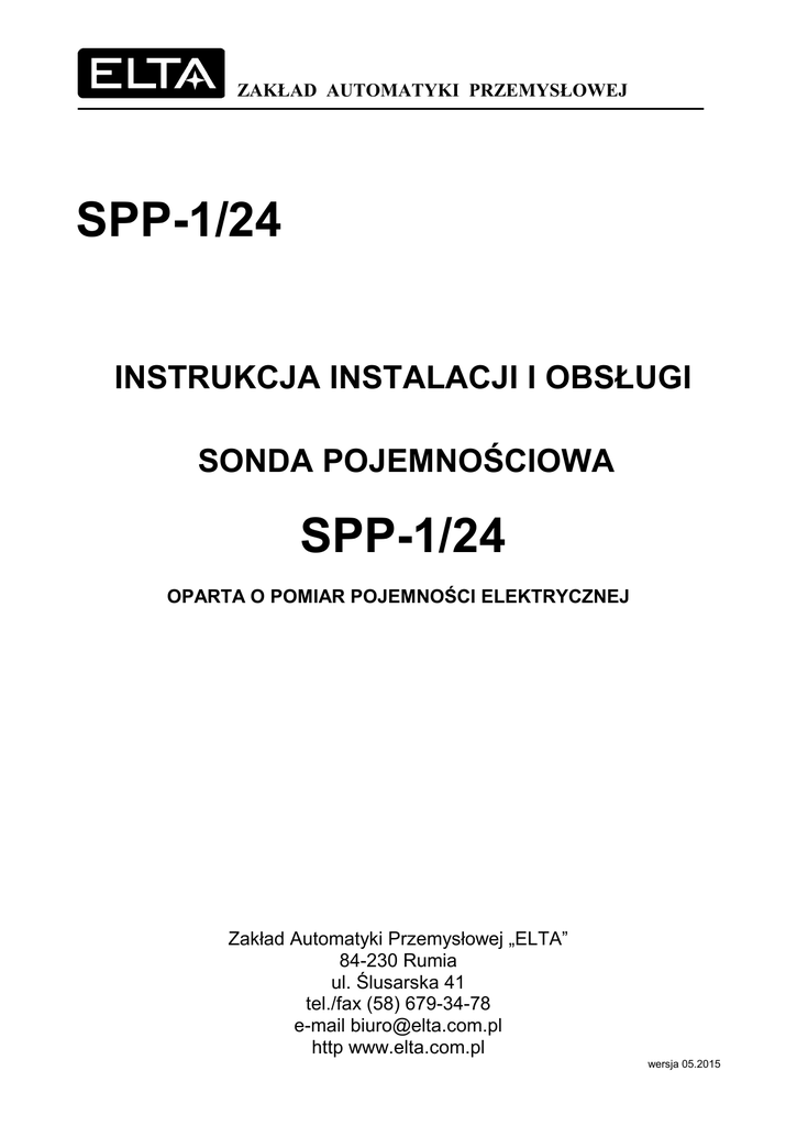 ZAKŁAD AUTOMATYKI PRZEMYSŁOWEJ SPP-1/24 INSTRUKCJA INSTALACJI I OBSŁUGI SONDA POJEMNOŚCIOWA SPP-1/24 OPARTA O POMIAR POJEMNOŚCI ELEKTRYCZNEJ Zakład Automatyki Przemysłowej „ELTA” 84-230 Rumia ul. Ślusarska 41 tel./fax (58) 679-34-78 e-mail [email protected] http www.elta.com.pl wersja 05.2015 ver. 05.2015 SPP-1/24 – INSTRUKCJA INSTALACJI I OBSŁUGI 2 OPIS Sonda pojemnościowa SPP-1/24 słuŜy do pomiaru poziomu w niskoparametrowych kotłach parowych, zbiornikach wody zasilającej, układach kondensatu. Najczęściej jest stosowana, jako element sterujący procesem ciągłej regulacji poziomu, moŜliwe jest równieŜ zastosowanie jej w układach regulacji dwustanowej. WYMIARY UKŁAD POMIAROWY Układ pomiarowy składa się z sondy SPP-1/24, oraz z zewnętrznego regulatora z wejściem prądowym (4-20mA). DANE TECHNICZNE 1. 2. 3. 4. 5. 6. 7. 8. 9. NajwyŜsze dopuszczalne ciśnienie (PS) – 0,05 MPa NajwyŜsza dopuszczalna temperatura (TS) – 110˚C Ciśnienie próbne (PT) – 1 MPa Temperatura próbna – 150˚C Połączenie gwintowe – G1” Stopień ochrony połączenia elektrycznego – IP 54 Kategoria instalacji elektrycznej – 2 kat.(1kV) Napięcie zasilania sondy pomiarowej – 15…30V DC Wyjście – sygnał prądowy separowany 4…20mA przy obciąŜeniu ≤500Ω 10. Czynnik roboczy – woda Zakres sterowania L Długość całkowita L1 200 300 400 500 600 700 800 900 1000 1100 1200 1300 1400 1500 1600 1700 1800 1900 250 350 450 550 650 750 850 950 1050 1150 1250 1350 1450 1550 1650 1750 1850 1950 BUDOWA Sonda składa się z następujących elementów: - korpusu wykonanego ze stali nierdzewnej - osłony elektrody wykonanej ze stali nierdzewnej - elektrody pomiarowej o długości maksymalnej 1900mm (wykonanej ze stali nierdzewnej, umieszczonej w szczelnej rurce z PTFE) - obudowy z zamontowanym przetwornikiem sygnału poziomu na sygnał elektryczny (prądowy) ZAKŁAD AUTOMATYKI PRZEMYSŁOWEJ ”ELTA” 84-230 RUMIA UL.ŚLUSARSKA 41 TEL: (58) 679-34-78 MAIL: [email protected] HTTP: WWW.ELTA.COM.PL ver. 05.2015 SPP-1/24 – INSTRUKCJA INSTALACJI I OBSŁUGI 3 MONTAś SONDY SPP-1/24 Sondę SPP-1/24 wkręca się w gwintowane gniazdo G1”. OstrzeŜenie: elektroda sondy przewodnościowej SPP-1/24 nie moŜe stykać się z Ŝadną częścią kotła lub zbiornika, ani teŜ z rurą ochronną. INSTALACJA Sprawdzić stan i wymiary gwintu (G 1”) gniazda w którym sonda ma być zamontowana (12). Na powierzchnię uszczelniającą sondy połoŜyć uszczelkę miedzianą (3). WłoŜyć i wkręcić elektrodę sondy wraz z osłoną (1) w otwór gwintowany króćca lub pokrywie kołnierza zbiornika / kotła – minimalna grubość kołnierza w którym montujemy sondę SPP-1/24 wynosi 18mm. Wstępnie ustawić korpus sondy (6) w połoŜeniu ułatwiającym późniejsze połączenie elektryczne. Klucz płaski 46mm załoŜyć na uchwyt (4) i mocno dokręcić elektrodę sondy wraz z osłoną (1). Poprawić ustawienie korpusu sondy (6) poprzez jego ręczne obrócenie – moŜliwy zakres obrotu to 340˚. Mocno dokręcić nakrętkę (5) korpusu sondy (6) kluczem płaskim 40mm. 1. 2. 3. 4. 5. 6. 7. POŁĄCZENIA ELEKTRYCZNE 1. 2. 3. • • • • Lp 1 2 3 4 5 6 7 8 9 10 11 12 Do wykonania połączenia sondy SPP-1/24 z zewnętrznym regulatorem naleŜy stosować trzyŜyłowy ekranowany przewód miedziany o przekroju nie mniejszym niŜ 0,75mm², np. LIYCY3x0,75. Długość przewodu nie powinna przekraczać 50m. Aby uzyskać dostęp do kostki zacisków przetwornika wewnątrz obudowy (8) naleŜy odkręcić nakrętkę (9) pokrywy obudowy (10) Podłączenia przewodów dokonujemy w następujący sposób: Wykręcamy dławicę kablową (11) Przekładamy przewód przez dławicę kablową i wtyk i podłączamy go do kostki zgodnie z DTR Wkręcamy dławicę kablową (11) Zakładamy pokrywę obudowy przetwornika (10) wraz z uszczelką i dokręcamy nakrętkę (9). Opis Osłona elektrody Gwint elektrody – G1” Uszczelka miedziana Uchwyt pod klucz 46mm Nakrętka korpusu sondy pod klucz 40mm Korpus sondy Izolator teflonowy Obudowa przetwornika Nakrętka Pokrywa obudowy przetwornika Dławica kablowa M16 Kołnierz sondy NIGDY NIE NALEśY WKRĘCAĆ SONDY SPP-1/24 TRZYMAJĄC JĄ ZA OBUDOWĘ PRZETWORNIKA. ZAKŁAD AUTOMATYKI PRZEMYSŁOWEJ ”ELTA” 84-230 RUMIA UL.ŚLUSARSKA 41 TEL: (58) 679-34-78 MAIL: [email protected] HTTP: WWW.ELTA.COM.PL ver. 05.2015 SPP-1/24 – INSTRUKCJA INSTALACJI I OBSŁUGI 4 SPOSÓB PROGRAMOWANIA SONDY SPP1/24 Programowanie sondy polega na wprowadzeniu ustawień dolnego zakresu pomiarowego sondy dla prądu 4mA (płynącego w pętli prądowej sondy) i górnego zakresu pomiarowego sondy dla prądu 20mA. Poziomy moŜna programować w dowolnej kolejności, moŜna takŜe przeprogramowywać tylko jeden z nich. Uwaga: Fabrycznie sonda zaprogramowana jest na pomiar w obszarze całej czynnej długości elektrody. Lp 1 2 3 4 5 6 7 8 9 10 11 12 13 Opis Wyświetlacz Przycisk „Strzałka w górę” Przycisk „PRG” Przycisk „Strzałka w dół” Przycisk „ESC” Kostka zaciskowa – zasilanie przetwornika Zwora – załoŜona – wspólne zasilanie przetwornika i obwodu wyjścia prądowego – zdjęta – zasilanie przetwornika, konieczność zasilenia obwodu pętli prądowej z oddzielnego zasilacza Kostka zaciskowa – obwód pętli prądowej 4-20mA Dioda +24V – obecność napięcia zasilającego przetwornik +24V DC Dioda PRG – praca sondy w trybie programowania Dioda 4-20 – pod pętlę 4-20mA podłączone jest obciąŜenie (np. regulator lub sterownik) i w pętli prądowej płynie prąd Przełącznik ustawiania zakresu pomiarowego przetwornika. Nie naleŜy go przestawiać (nastawa fabryczna) – błędne ustawienie powoduje migotanie wyświetlacza i nieprawidłową pracę przetwornika Dławica kablowa M16 ZAKŁAD AUTOMATYKI PRZEMYSŁOWEJ ”ELTA” 84-230 RUMIA UL.ŚLUSARSKA 41 TEL: (58) 679-34-78 MAIL: [email protected] HTTP: WWW.ELTA.COM.PL ver. 05.2015 SPP-1/24 – INSTRUKCJA INSTAL
