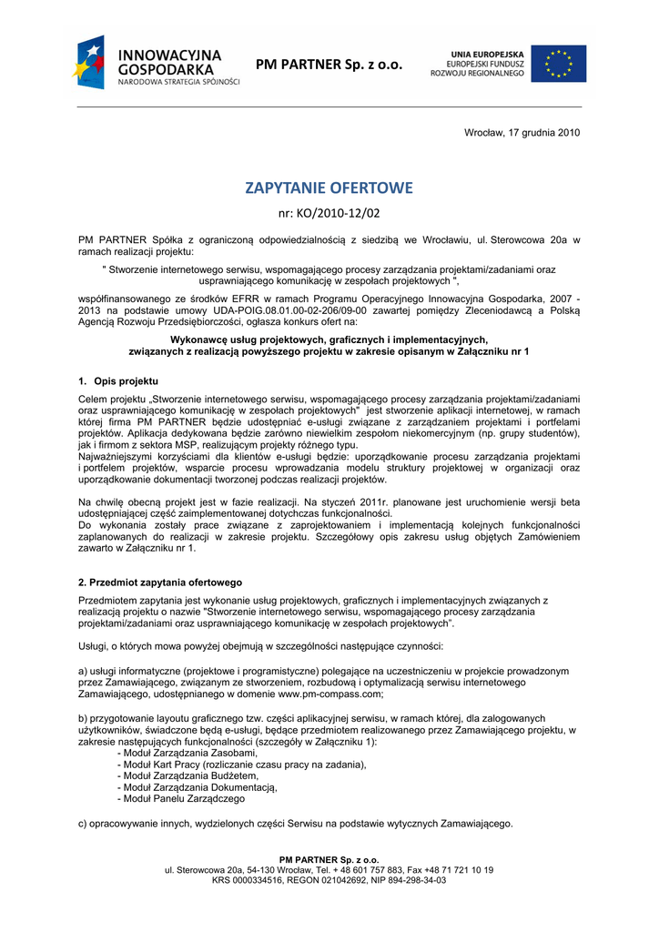 PM PARTNER Sp. z o.o. Wrocław, 17 grudnia 2010 ZAPYTANIE OFERTOWE nr: KO/2010‐12/02 PM PARTNER Spółka z ograniczoną odpowiedzialnością z siedzibą we Wrocławiu, ul. Sterowcowa 20a w ramach realizacji projektu: " Stworzenie internetowego serwisu, wspomagającego procesy zarządzania projektami/zadaniami oraz usprawniającego komunikację w zespołach projektowych ", współfinansowanego ze środków EFRR w ramach Programu Operacyjnego Innowacyjna Gospodarka, 2007 2013 na podstawie umowy UDA-POIG.08.01.00-02-206/09-00 zawartej pomiędzy Zleceniodawcą a Polską Agencją Rozwoju Przedsiębiorczości, ogłasza konkurs ofert na: Wykonawcę usług projektowych, graficznych i implementacyjnych, związanych z realizacją powyższego projektu w zakresie opisanym w Załączniku nr 1 1. Opis projektu Celem projektu „Stworzenie internetowego serwisu, wspomagającego procesy zarządzania projektami/zadaniami oraz usprawniającego komunikację w zespołach projektowych" jest stworzenie aplikacji internetowej, w ramach której firma PM PARTNER będzie udostępniać e-usługi związane z zarządzaniem projektami i portfelami projektów. Aplikacja dedykowana będzie zarówno niewielkim zespołom niekomercyjnym (np. grupy studentów), jak i firmom z sektora MSP, realizującym projekty różnego typu. Najważniejszymi korzyściami dla klientów e-usługi będzie: uporządkowanie procesu zarządzania projektami i portfelem projektów, wsparcie procesu wprowadzania modelu struktury projektowej w organizacji oraz uporządkowanie dokumentacji tworzonej podczas realizacji projektów. Na chwilę obecną projekt jest w fazie realizacji. Na styczeń 2011r. planowane jest uruchomienie wersji beta udostępniającej część zaimplementowanej dotychczas funkcjonalności. Do wykonania zostały prace związane z zaprojektowaniem i implementacją kolejnych funkcjonalności zaplanowanych do realizacji w zakresie projektu. Szczegółowy opis zakresu usług objętych Zamówieniem zawarto w Załączniku nr 1. 2. Przedmiot zapytania ofertowego Przedmiotem zapytania jest wykonanie usług projektowych, graficznych i implementacyjnych związanych z realizacją projektu o nazwie "Stworzenie internetowego serwisu, wspomagającego procesy zarządzania projektami/zadaniami oraz usprawniającego komunikację w zespołach projektowych”. Usługi, o których mowa powyżej obejmują w szczególności następujące czynności: a) usługi informatyczne (projektowe i programistyczne) polegające na uczestniczeniu w projekcie prowadzonym przez Zamawiającego, związanym ze stworzeniem, rozbudową i optymalizacją serwisu internetowego Zamawiającego, udostępnianego w domenie www.pm-compass.com; b) przygotowanie layoutu graficznego tzw. części aplikacyjnej serwisu, w ramach której, dla zalogowanych użytkowników, świadczone będą e-usługi, będące przedmiotem realizowanego przez Zamawiającego projektu, w zakresie następujących funkcjonalności (szczegóły w Załączniku 1): - Moduł Zarządzania Zasobami, - Moduł Kart Pracy (rozliczanie czasu pracy na zadania), - Moduł Zarządzania Budżetem, - Moduł Zarządzania Dokumentacją, - Moduł Panelu Zarządczego c) opracowywanie innych, wydzielonych części Serwisu na podstawie wytycznych Zamawiającego. PM PARTNER Sp. z o.o. ul. Sterowcowa 20a, 54-130 Wrocław, Tel. + 48 601 757 883, Fax +48 71 721 10 19 KRS 0000334516, REGON 021042692, NIP 894-298-34-03 PM PARTNER Sp. z o.o. 3. Termin wykonania przedmiotu zapytania ofertowego Rozpoczęcie: z dniem podpisania umowy. Zakończenie: 31 października 2011r. 4. Warunki udziału w postępowaniu O udzielenie zamówienia mogą się ubiegać Wykonawcy, którzy spełniają następujące warunki: - posiadają wiedzę i doświadczenie umożliwiające wykonanie usług będących przedmiotem zamówienia (wykształcenie informatyczne lub grafika/multimedia), - zobowiążą się do stałego świadczenia usług na ustalonym poziomie dostępności - około 50%, liczonym w stosunku do liczby dni roboczych (za dni robocze uważa się wszystkie dni powszednie od poniedziałku do piątku z wyłączeniem dni ustawowo wolnych od pracy oraz dni wolnych od pracy wyznaczonych przez Zamawiającego), - przedłożą uzupełniony i podpisany Formularz Oferty stanowiący Załącznik nr 2., zawierający m.in. wynagrodzenie miesięczne (netto w zł) z tytułu wykonywania usług wchodzących w zakres zamówienia oraz przekazania praw autorskich do powstałych utworów. 5. Opis sposobu przygotowania i złożenia Oferty Oferta powinna: - zostać przygotowana w języku polskim w formie pisemnej na wzorze stanowiącym Załącznik nr 2 do niniejszego Zapytania, - zostać przesłana na adres: [email protected] lub na adres siedziby spółki: ul. Sterowcowa 20a, 54-130 Wrocław w terminie do 29 grudnia 2010r. do godz. 10:00. Osoba upoważniona do kontaktów z oferentami: Klara Dyczkowska, tel. 601 757 883. 6. Opis kryteriów, którymi będzie się kierował Zamawiający przy wyborze oferty Kryteria wyboru najkorzystniejszej oferty: 100% cena Sposób oceny ofert: liczba punktów oferty badanej = 100 pkt x (cena min / cena badana) 7. Formalności po wyborze oferty w celu zawarcia umowy Zamawiający niezwłocznie po wyborze oferty drogą mailową powiadomi o wybranym wykonawcy oferentów, którzy złożyli oferty. Zamawiający wskaże termin i miejsce podpisania umowy Wykonawcy, którego oferta została wybrana. Wzór umowy stanowi Załącznik nr 3 do niniejszego Zapytania. Klara Dyczkowska Prezes Zarządu Załączniki: Załącznik nr 1. Szczegółowy opis zakresu usług objętych Zamówieniem Załącznik nr 2. Formularz Oferty Załącznik nr 3. Wzór Umowy PM PARTNER Sp. z o.o. ul. Sterowcowa 20a, 54-130 Wrocław, Tel. + 48 601 757 883, Fax +48 71 721 10 19 KRS 0000334516, REGON 021042692, NIP 894-298-34-03 PM PARTNER Sp. z o.o. ZAŁĄCZNIK NR 1 Szczegółowy opis zakresu usług objętych Zamówieniem Oczekiwany Zakres usług termin wykonania Styczeń 2011r. 