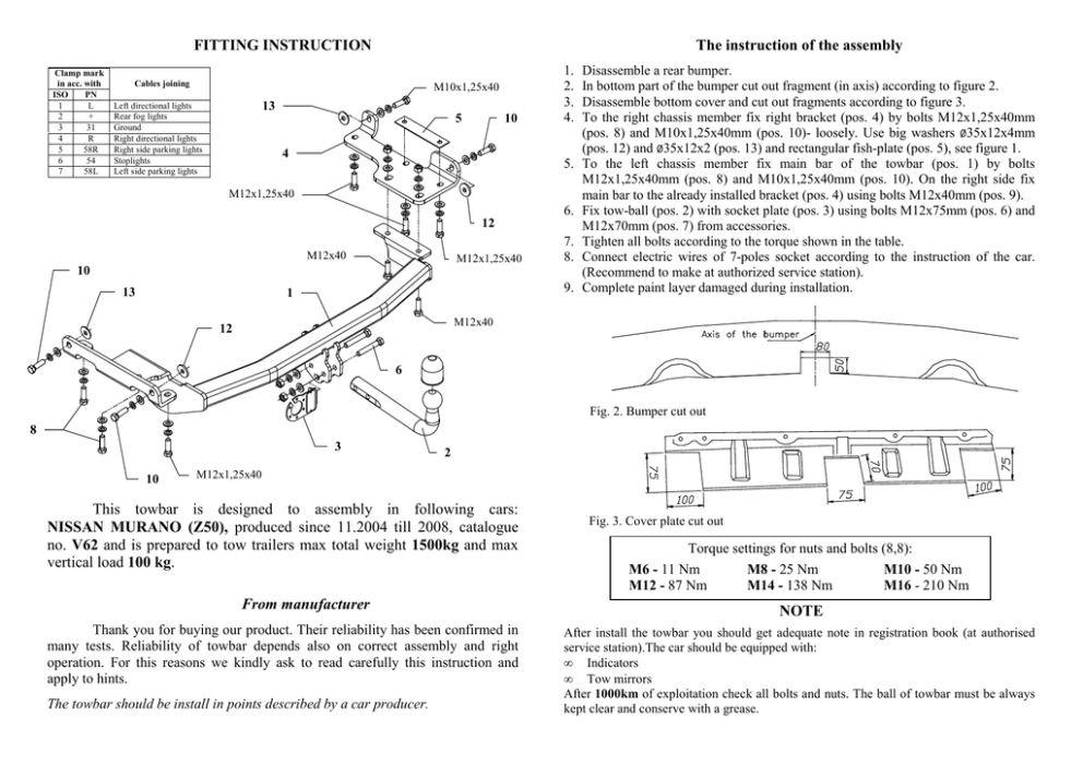 FITTING INSTRUCTION Clamp mark in acc. with ISO PN 1 L 2 + 3 31 4 R 5 58R 6 54 7 58L The instruction of the assembly Cables joining M10x1,25x40 13 Left directional lights Rear fog lights Ground Right directional lights Right side parking lights Stoplights Left side parking lights 5 10 4 1. 2. 3. 4. 5. M12x1,25x40 6. 12 M12x40 M12x1,25x40 7. 8. 10 13 9. 1 Disassemble a rear bumper. In bottom part of the bumper cut out fragment (in axis) according to figure 2. Disassemble bottom cover and cut out fragments according to figure 3. To the right chassis member fix right bracket (pos. 4) by bolts M12x1,25x40mm (pos. 8) and M10x1,25x40mm (pos. 10)- loosely. Use big washers ø35x12x4mm (pos. 12) and ø35x12x2 (pos. 13) and rectangular fish-plate (pos. 5), see figure 1. To the left chassis member fix main bar of the towbar (pos. 1) by bolts M12x1,25x40mm (pos. 8) and M10x1,25x40mm (pos. 10). On the right side fix main bar to the already installed bracket (pos. 4) using bolts M12x40mm (pos. 9). Fix tow-ball (pos. 2) with socket plate (pos. 3) using bolts M12x75mm (pos. 6) and M12x70mm (pos. 7) from accessories. Tighten all bolts according to the torque shown in the table. Connect electric wires of 7-poles socket according to the instruction of the car. (Recommend to make at authorized service station). Complete paint layer damaged during installation. M12x40 12 6 Fig. 2. Bumper cut out 8 3 10 2 M12x1,25x40 This towbar is designed to assembly in following cars: NISSAN MURANO (Z50), produced since 11.2004 till 2008, catalogue no. V62 and is prepared to tow trailers max total weight 1500kg and max vertical load 100 kg. From manufacturer Thank you for buying our product. Their reliability has been confirmed in many tests. Reliability of towbar depends also on correct assembly and right operation. For this reasons we kindly ask to read carefully this instruction and apply to hints. The towbar should be install in points described by a car producer. Fig. 3. Cover plate cut out Torque settings for nuts and bolts (8,8): M6 - 11 Nm M8 - 25 Nm M10 - 50 Nm M12 - 87 Nm M14 - 138 Nm M16 - 210 Nm NOTE After install the towbar you should get adequate note in registration book (at authorised service station).The car should be equipped with: • Indicators • Tow mirrors After 1000km of exploitation check all bolts and nuts. The ball of towbar must be always kept clear and conserve with a grease. PPUH AUTO-HAK S.J. Towbar accessories: Produkcja Zaczepów Kulowych Henryk & Zbigniew Nejman 76-200 SŁUPSK ul. Słoneczna 16K tel/fax (059) 8-414-414; 8-414-413 E-mail: [email protected] www. autohak.com.pl Towing hitch (without electrical set) Class: A50-X Cat. no. V62 Technical data: D-value: 9,1 kN maximum trailer weight: 1500 kg maximum vertical cup load: 100 kg Designed for: Manufacturer: NISSAN Model: MURANO (Z50) produced since 11.2004 till 2008 Approval number according to Directive 94/20/EC: e20*94/20*0093*00 Foreword This towbar is designed according to rules of safety traffic regulations. The towing hitch is a safety component and can be install only by qualified personnel. Any alteration or conversion of the towing hitch is prohibited and would lead to cancellation of design certification. Remove insulating compound and underseal from vehicle (if present) in the area of the matting surfaces of the towing hitch. The vehicle manufacturer’s specifications regarding trailer load and max. vertical cup load are decisive for driving whereat values for the towing hitch cannot be exceeded. D-value formula: Max trailer weight [kg] x Max vehicle weight [kg] Max trailer weight [kg] + Max vehicle weight [kg] X 9,81 = 1000 D [kN] INSTRUCTION De montage et d’exploitation du dispositif d'attelage à boule Instructions de montage 1. 2. M10x1,25x40 Désignation de borne selon la norme ISO PN 1 L 2 3 + 31 4 R 5 6 7 58R 54 58L 13 Connexion des câbles 5 Pour indicateurs de direction gauche Feux de brouillard arrière Au poids du véhicule Pour indicateurs de direction droite Feux de circulation droites Pour feux de freinage Feux de circulation gauches 10 3. 4. 4 M12x1,25x40 5. 12 M12x40 M12x1,25x40 7. 8. 1 10 6. 13 M12x40 12 9. Démonter le pare-chocs. Découper un fragment du pare-chocs dans sa partie basse, dans son axe comme indiqué sur le dessin 2. Desserrer le cache inférieur. Faire les découpes dans le cache conformément au dessin 3. Serrer l’appui droit (pos.4) au longeron droit à l’aide des vis M12x1,25x40mm (pos. 8) et M10x1,25x40mm (pos. 10) – de manière lâche. Utiliser les rondelles35x12x4mm (pos. 12), 35x12x2mm (pos. 13) et l’éclisse recatngulaire (pos.5). Voir le dessin 1. Serrer la poutre principale de l’attelage (pos.1) au longeron gauche à l’aide des vis M12x1,25x40mm (pos. 8) et M10x1,25x40mm (pos. 10). A droite, serrer la poutre principale à l’appui droit déjà monté (pos.4) à l’aide des vis M12x40mm (pos. 9). Serrer la boule d’attelage (pos.2) avec la tôle sous la prise (pos.3) à l’aide de vis M12x75mm (pos. 6) et M12x70mm (pos. 7). Serrer toutes les vis aux couples de serrage, comme indiqué dans le tableau. Connecter les câbles de la prise 7 – à l'installation électrique en conformité avec les instructions d'une usine automobile (recommandé la mise en œuvre d’une stationservice autorisée). Remplir des pertes de peinture causées durant l'installation. 6 axe de symétrie 8 3 10 2 Dessin 2. découpe du pare-chocs M12x1,25x40 Le dispositif d'attelage à boule est conçu pour être monté dans la voiture: NISSAN MURANO, (Z50), produit à partir de 11.2004 au 2008, numéro de catalogue V62 et est utilisé pour tirer des remorques du poids total 1500 kg et de la pression totale sur la boule max 100 kg. Couples de serrage recommandé pour les vis et les écrous 8,8: M6 - 11 Nm M 8 - 25 Nm M 10 - 50 Nm M 12 - 87 Nm M 14 - 138 Nm M16 - 210 Nm DE LA PART DU FABRICANT Merci d'avoir choisi le dispositif d'attelage à boule produit par notre société. Son fiabilité a é