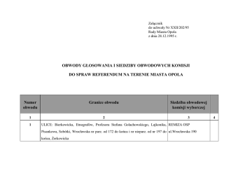 Załącznik do uchwały Nr XXII/202/95 Rady Miasta Opola z dnia 28.12.1995 r. OBWODY GŁOSOWANIA I SIEDZIBY OBWODOWYCH KOMISJI DO SPRAW REFERENDUM NA TERENIE MIASTA OPOLA Numer obwodu Granice obwodu Siedziba obwodowej komisji wyborczej 1 2 3 1 ULICE: Bierkowicka, Etnografów, Profesora Stefana Golachowskiego, Lajkonika, REMIZA OSP Pisankowa, Sobótki, Wrocławska nr parz. od 172 do końca i nr nieparz. od nr 197 do ul.Wrocławska 190 końca, Żerkowicka 4 2 1 2 2 3 ULICE: Profesora Stefana Banacha, Ceglana, Cicha, Cmentarna, Daleka, Dobra, Szkoła Podstawowa Nr 9 Księdza Bolesława Domańskiego nr parz. od 2 do 80 i nr nieparz. od 1 do 77, Jasna, ul.Cmentarna 7 Profesora Józefa Kokota, Profesora Stanisława Kolbuszewskiego, Profesora Tadeusza Kotarbińskiego, Profesora Stanisława Kulczyńskiego, Franciszka Kurpierza, Kurpiowska, Ludowa, Marzanny, Miła, Nizinna, Pancerna, Partyzancka, Profesora Kazimierza Piwarskiego, Północna, Profesora Eugeniusza Romera, Słowiańska, Spokojna, Profesora Witolda Taszyckiego, Profesora Władysława Tatarkiewicza, Wrocławska nr nieparz. od nr 95 do nr 195 i nr parz. od nr 64 do nr 170, Wspólna, Jana Wyglendy, Zamiejska, Zbożowa 3 ULICA: Szymona Koszyka Szkoła Podstawowa Nr 14 ul.Szymona Koszyka 21 4 ULICE: Jana Chełmońskiego, Daniela Chodowieckiego, Fryderyka Chopina, Artura Zespół Szkół Budowlanych Grottgera, Józefa Hallera, numery parzyste Kanałowa, Juliusza Kossaka, Krapkowicka ul.Niemodlińska 50 nr parz. od nr 2 do nr 10, Stanisława Moniuszki, Niemodlińska nr parz. od nr 8 do nr 60 i nr nieparz. od nr 9 do nr 57, Feliksa Nowowiejskiego, Grzegorza Piramowicza, Plac Ludomira Różyckiego, Stefana Stoińskiego, Jana Styki, Karola Szymanowskiego, Leona Wyczółkowskiego 4 3 1 2 3 5 ULICE: Księdza Norberta Bończyka, Nysy Łużyckiej nr parz. od nr 8 do nr 10, Szkoła Podstawowa Nr 8 Księdza Piotra Ściegiennego, Wrocławska nr parz. od nr 2 do nr 62 i nr nieparz. od nr ul.Księdza Norberta 1 do nr 93, Zamknięta 6 Bończyka 13 ULICE: Plac Jana Kazimierza, Licealna, Piotra Niedurnego, Niemodlińska nr parz. od I Liceum Ogólnokształcące nr 2 do nr 6 i nr nieparz. od nr 1 do nr 7, Stefana Okrzei, Stanisława Spychalskiego nr ul.Licealna 3 parz. od nr 2 do końca i nr nieparz. od nr 15 do końca, Wandy 7 ULICE: Łąkowa, Plac Józefa Piłsudskiego, Stanisława Spychalskiego nr nieparz. od nr Miejska Biblioteka 1 do nr 13 i 15A Publiczna Pl.Józefa Piłsudskiego 5-6 8 ULICE: Kardynała Bolesława Kominka, Katedralna nr parzyste, Plac Katedralny, Szkoła Podstawowa Kolegiacka, Marii Konopnickiej, Plac Konstytucji 3 Maja, Książąt Opolskich nr parz. Specjalna ul.Książąt od nr 32 do końca i nr nieparz. do nr 19 do końca, Jana Łangowskiego nr nieparz., Opolskich 21 Nadbrzeżna, Nysy Łużyckiej nr parz. od nr 12 do nr 30 i nr nieparz. od nr 1 do nr 7, Haliny Poświatowskiej, Rybacka, Sądowa 9 ULICE: Czarnowąska, Domowa, Gawędy, Gminna, Gościnna, Grodzka, Kaletnicza, Szkoła Podstawowa Nr 4 Krzanowicka, Mikołaja, Osadnicza, Rymarska, Jana Sobieskiego, Sołtysów, Stolarska, ul.Gminna 5 Śluza - Wróblin, Wiankowa, Wróblińska 4 4 1 10 2 3 ULICE: Świętej Anny, Bałtycka, Budowlanych, Bytomska, Chorzowska, Józefa Szkoła Podstawowa Nr 7 Cygana, Działkowa, Teodora Glenska, Gliwicka, Bartosza Głowackiego, Harcerska, ul.Budowlanych 40 Kępska, Księdza Czesława Klimasa, Kluczborska, Kozielska, Księdza Karola Koziołka, Leśnicka, Alojzego Ligudy, Magazynowa, Andrzeja Mielęckiego, Adama Napieralskiego, Portowa, Prudnicka, Prasia, Raciborska, Rodła, Rolna, Składowa, Plac Księdza Józefa Szafranka, Tarnogórska, Wiśniowa, Zabrzańska, Zakładowa 11 ULICA: Chabrów nr parz. od nr 10 do nr 50 (deskowce) Pawilon OSM „Przyszłość” KLUB CHABRY ul.Chabrów 54 12 ULICA: Chabrów (z wyłączeniem deskowców) Szkoła Podstawowa Nr 11 ul.Chabrów 65 13 ULICE: Astrów, Bzów, Irysów, Jana Stanisława Jankowskiego, Jaśminów Konwalii, Szkoła Podstawowa Nr 17 Janusza Kusocińskiego, Maków, Narcyzów, Niezapominajek, Leopolda Okulickiego, ul.Oleska 68 Plac Oleandrów, Oleska nr parz. od nr 64 do nr 118 i nr nieparz. od nr 51 do nr 127, Plac Róż, Stokrotek, Tulipanów 4 5 1 14 2 3 ULICE: Beskidzka, Huculska, Karpacka, Luboszycka nr parz. od nr 10 do końca, Przedsiębiorstwo Podhalańska, Tatrzańska, Zakopiańska Usługowo - Produkcyjne „INWEST - DIM” ul.Luboszycka 11 15 ULICE: Brzozowa, Grobla, Jęczmienna, Lipowa, Nowa, Oleska nr parz. od nr 120 do REMIZA OSP ul.Wiejska końca i nr nieparz. od nr 129 do końca, Opolska, Osiedle, Pszeniczna, Kazimierza 58a Pużaka nr parz. od nr 2 do nr 6 i nr nieparzyste, Rzepakowa, Sadowa, Siewna 16 ULICE: Krótka, Ozimska nr nieparz. od nr 171 do końca, Piotrkowska, Sieradzka, Budynek Elektrowni Toruńska, Wiejska nr nieparz. od nr 141 do końca 17 ULICE: Bielska, Chełmska, Cieszyńska, Częstochowska nr nieparz. od nr 1 do nr 3, Przedszkole Nr 4 ul.Bielska Kaliska, Kielecka, Lwowska, Stanisławowska, Stryjska, Tarnopolska, Wileńska 18 ul.Piotrkowska 1 23 ULICE: Aleja Wincentego Witosa, Boczna, Arki Bożka, Bukowa, Częstochowska nr Przdszkole Nr 174 nieparz. od nr 5 do końca, Dębowa, Drobiarska, Górna, Jesionowa, Jodłowa, Klonowa, ul.Jodłowa 81 Kolonijna, Lawendowa, Olchowa, Rumiankowa, Skośna Skowronka, Sosnowa, Świerkowa, Szałwiowa, Tymiankowa, Zagrodowa, Ziołowa 4 6 1 19 2 3 ULICE: Agrestowa, Akacjowa, Amarantowa, Beżowa, Biała, Bieszczadzka, Błękitna, Szkoła Podstawowa Nr 20 Borówkowa, Władysława Broniewskiego, Czeremchowa, Czereśniowa, ul.Grudzicka 48c Częstochowska nr parzyste, Dzikiej Róży, Józefa Elsnera, Fiołkowa, Gajowa, Gosławicka, Granatowa, Grudzicka, Grzybowa, Jagodowa, Jałowcowa, Jaskółcza, Jastrzębia, Jarzębinowa, Jaworowa, Jesienna, Jeżynowa, Kalinowa, Karminowa, Kasztanowa, Janusza Korczaka, Kręta, Krokusów, Eugeniusza Kwiatkowskiego, Leszczynowa, Leśna, Limby Malinowa, Modrzewiowa, Morelowa, Myśliwska, Nowowiejska, Obrońców 