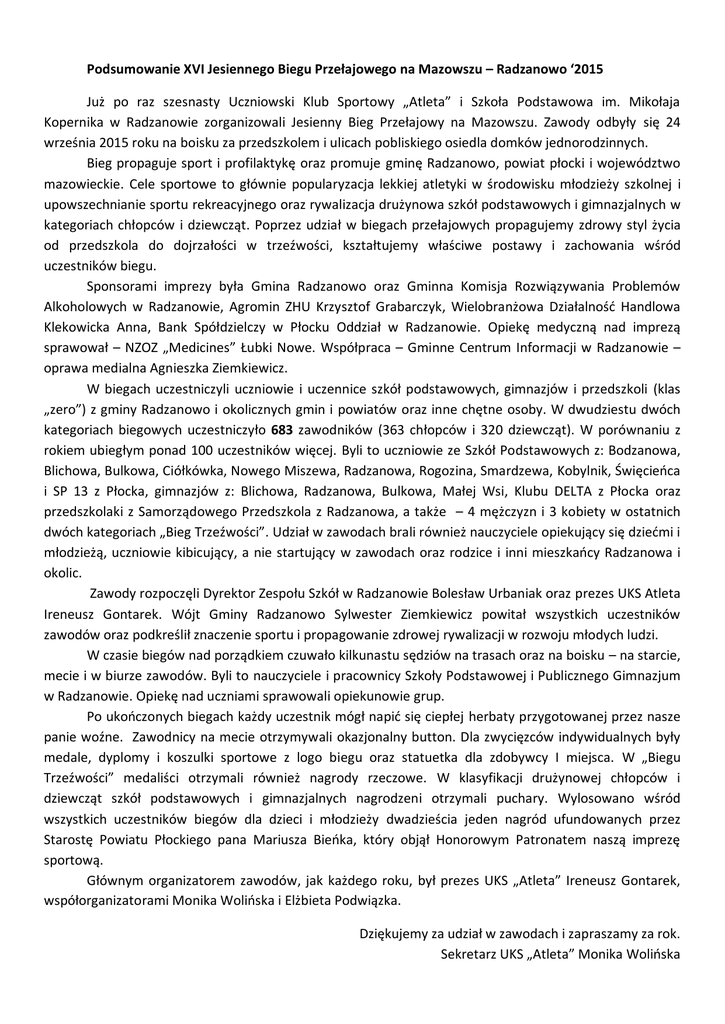 Podsumowanie XVI Jesiennego Biegu Przełajowego na Mazowszu – Radzanowo ‘2015 Już po raz szesnasty Uczniowski Klub Sportowy „Atleta” i Szkoła Podstawowa im. Mikołaja Kopernika w Radzanowie zorganizowali Jesienny Bieg Przełajowy na Mazowszu. Zawody odbyły się 24 września 2015 roku na boisku za przedszkolem i ulicach pobliskiego osiedla domków jednorodzinnych. Bieg propaguje sport i profilaktykę oraz promuje gminę Radzanowo, powiat płocki i województwo mazowieckie. Cele sportowe to głównie popularyzacja lekkiej atletyki w środowisku młodzieży szkolnej i upowszechnianie sportu rekreacyjnego oraz rywalizacja drużynowa szkół podstawowych i gimnazjalnych w kategoriach chłopców i dziewcząt. Poprzez udział w biegach przełajowych propagujemy zdrowy styl życia od przedszkola do dojrzałości w trzeźwości, kształtujemy właściwe postawy i zachowania wśród uczestników biegu. Sponsorami imprezy była Gmina Radzanowo oraz Gminna Komisja Rozwiązywania Problemów Alkoholowych w Radzanowie, Agromin ZHU Krzysztof Grabarczyk, Wielobranżowa Działalność Handlowa Klekowicka Anna, Bank Spółdzielczy w Płocku Oddział w Radzanowie. Opiekę medyczną nad imprezą sprawował – NZOZ „Medicines” Łubki Nowe. Współpraca – Gminne Centrum Informacji w Radzanowie – oprawa medialna Agnieszka Ziemkiewicz. W biegach uczestniczyli uczniowie i uczennice szkół podstawowych, gimnazjów i przedszkoli (klas „zero”) z gminy Radzanowo i okolicznych gmin i powiatów oraz inne chętne osoby. W dwudziestu dwóch kategoriach biegowych uczestniczyło 683 zawodników (363 chłopców i 320 dziewcząt). W porównaniu z rokiem ubiegłym ponad 100 uczestników więcej. Byli to uczniowie ze Szkół Podstawowych z: Bodzanowa, Blichowa, Bulkowa, Ciółkówka, Nowego Miszewa, Radzanowa, Rogozina, Smardzewa, Kobylnik, Święcieńca i SP 13 z Płocka, gimnazjów z: Blichowa, Radzanowa, Bulkowa, Małej Wsi, Klubu DELTA z Płocka oraz przedszkolaki z Samorządowego Przedszkola z Radzanowa, a także – 4 mężczyzn i 3 kobiety w ostatnich dwóch kategoriach „Bieg Trzeźwości”. Udział w zawodach brali również nauczyciele opiekujący się dziećmi i młodzieżą, uczniowie kibicujący, a nie startujący w zawodach oraz rodzice i inni mieszkańcy Radzanowa i okolic. Zawody rozpoczęli Dyrektor Zespołu Szkół w Radzanowie Bolesław Urbaniak oraz prezes UKS Atleta Ireneusz Gontarek. Wójt Gminy Radzanowo Sylwester Ziemkiewicz powitał wszystkich uczestników zawodów oraz podkreślił znaczenie sportu i propagowanie zdrowej rywalizacji w rozwoju młodych ludzi. W czasie biegów nad porządkiem czuwało kilkunastu sędziów na trasach oraz na boisku – na starcie, mecie i w biurze zawodów. Byli to nauczyciele i pracownicy Szkoły Podstawowej i Publicznego Gimnazjum w Radzanowie. Opiekę nad uczniami sprawowali opiekunowie grup. Po ukończonych biegach każdy uczestnik mógł napić się ciepłej herbaty przygotowanej przez nasze panie woźne. Zawodnicy na mecie otrzymywali okazjonalny button. Dla zwycięzców indywidualnych były medale, dyplomy i koszulki sportowe z logo biegu oraz statuetka dla zdobywcy I miejsca. W „Biegu Trzeźwości” medaliści otrzymali również nagrody rzeczowe. W klasyfikacji drużynowej chłopców i dziewcząt szkół podstawowych i gimnazjalnych nagrodzeni otrzymali puchary. Wylosowano wśród wszystkich uczestników biegów dla dzieci i młodzieży dwadzieścia jeden nagród ufundowanych przez Starostę Powiatu Płockiego pana Mariusza Bieńka, który objął Honorowym Patronatem naszą imprezę sportową. Głównym organizatorem zawodów, jak każdego roku, był prezes UKS „Atleta” Ireneusz Gontarek, współorganizatorami Monika Wolińska i Elżbieta Podwiązka. Dziękujemy za udział w zawodach i zapraszamy za rok. Sekretarz UKS „Atleta” Monika Wolińska Podsumowanie XVI Jesiennego Biegu Przełajowego na Mazowszu –Radzanowo 24.09.2015r. Wyniki w kategoriach zespołowych : W kategorii dziewcząt szkół podstawowych: I – SP Radzanowo II – SP Bodzanów III – SP Nowe Miszewo IV – SP Święcieniec V – SP Kobylniki VI – SP Ciółkówko W kategorii chłopców szkół podstawowych: I – SP Radzanowo II – SP Rogozino III – SP Bodzanów IV – SP Nowe Miszewo V – SP 13 Płock VI – SP Święcieniec W kategorii dziewcząt szkół gimnazjalnych I – Gimnazjum Radzanowo II – Gimnazjum Mała Wieś III – Gimnazjum Bulkowo IV – Gimnazjum Blichowo V – DELTA KLUB Płock W kategorii chłopców szkół gimnazjalnych I – Gimnazjum Radzanowo II – Gimnazjum Mała Wiś III – Gimnazjum Blichowo IV – DELTA KLUB Płock i Gimnazjum Bulkowo Tabele przedstawiające zdobyte miejsca w kategoriach indywidualnych. Rocznik: chłopcy 2008 Lp. Imię i nazwisko 1. Marceli Gontarek 2. Dawid Kiełpiński 3. Adrian Serwiński 4. Konrad Bakalarz 5. Eryk Sosnowski 6. Wiktor Zwierzchowski (28os.) Szkoła Radzanowo Radzanowo Bodzanów Bodzanów Radzanowo Kobylniki Rocznik: dziewczęta 2008 Lp. Imię i nazwisko 1. Natalia Szypszak 2. Alicja Przybysz 3. Klaudia Lewandowska 4. Alicja Krzemińska 5. Nikola Woroniecka 6. Gabriela Dziewulska (32os.) Szkoła Nowe Miszewo Radzanowo Radzanowo Radzanowo Radzanowo Kobylniki Rocznik: chłopcy 2007 Lp. Imię i nazwisko 1. Bartek Borowski 2. Filip Szymański 3. Artur Woroniecki 4. Jakub Raciński 5. Piotr Kruk 6. Bartek Żabolicki (39os.) Szkoła Rogozino Radzanowo Radzanowo Nowe Miszewo Radzanowo Rogozino Rocznik: dziewczęta 2007 Lp. Imię i nazwisko 1. Iga Botuszańska 2. Andżelika Misialik 3. Wiktoria Szajewska 4. Justyna Borucka 5. Wiktoria Wolińska 6. Natalia Ławicka (29os.) Szkoła Ciółkówko Ciółkówko Radzanowo Radzanowo Święcieniec Radzanowo Rocznik: chłopcy 2006 Lp. Imię i nazwisko 1. Błażej Sztuczka 2. Łukasz Mikołajczyk 3. Tomasz Kijek 4. Kamil Grudziński 5. Julian Kaźmirski 6. Julian Pakulski (29os.) Szkoła SP 13 Plock Radzanowo Rogozino SP 13 Płock Smardzewo Bodzanów R