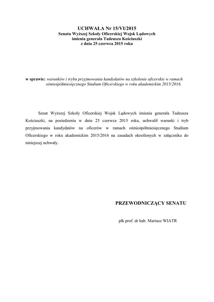 UCHWAŁA Nr 15/VI/2015 Senatu Wyższej Szkoły Oficerskiej Wojsk Lądowych imienia generała Tadeusza Kościuszki z dnia 25 czerwca 2015 roku w sprawie: warunków i trybu przyjmowania kandydatów na szkolenie oficerskie w ramach ośmioipółmiesięcznego Studium Oficerskiego w roku akademickim 2015/2016. Senat Wyższej Szkoły Oficerskiej Wojsk Lądowych imienia generała Tadeusza Kościuszki, na posiedzeniu w dniu 25 czerwca 2015 roku, uchwalił warunki i tryb przyjmowania kandydatów na oficerów w ramach ośmioipółmiesięcznego Studium Oficerskiego w roku akademickim 2015/2016 na zasadach określonych w załączniku do niniejszej uchwały. PRZEWODNICZĄCY SENATU płk prof. dr hab. Mariusz WIATR Załącznik do Uchwały Senatu Nr 15/VI/2015 z dnia 25 czerwca 2015r. Warunki i tryb przyjmowania na szkolenie wojskowe kandydatów na oficerów w ramach ośmioipółmiesięcznego Studium Oficerskiego w Wyższej Szkole Oficerskiej Wojsk Lądowych w roku akademickim 2015/2016 I. WARUNKI FORMALNE Opracowane na podstawie art. 124 ust. 2 i 3; art. 126 ust. 1 i 4 ustawy z dnia 11 września 2003 roku o służbie wojskowej żołnierzy zawodowych (Dz. U. 2010 Nr 90, poz. 593 z późn. zm.1) oraz § 3 pkt 1, § 4 ust. 1,2 i 4 rozporządzenia Ministra Obrony Narodowej z dnia 17 listopada 2014 r. w sprawie służby wojskowej kandydatów na żołnierzy zawodowych (Dz. U. 2014, poz. 1627.) 1. O przyjęcie na szkolenie oficerskie w ramach ośmioipółmiesięcznego Studium Oficerskiego może ubiegać się osoba: 1) niekarana sądownie; 2) posiadająca obywatelstwo polskie; 3) posiadająca zdolność fizyczną i psychiczną do zawodowej służby wojskowej (w celu określenia zdolności fizycznej i psychicznej, którą orzekają Wojskowe Komisje Lekarskie i Wojskowe Pracownie Psychologiczne, Komendant Wojskowej Komendy Uzupełnień, po dokonaniu rejestracji elektronicznej na stronie uczelni i złożeniu dokumentów do WKU, o których mowa w pkt. 2 - kieruje kandydata na badania); 4) posiadająca dyplom ukończenia studiów drugiego stopnia lub jednolitych studiów magisterskich; 5) mająca co najmniej osiemnaście lat; a także, która: 6) zda pozytywnie sprawdzian sprawności fizycznej i test znajomości języka angielskiego; 7) odbędzie pozytywnie rozmowę kwalifikacyjną. 2. Kandydaci ubiegający się o przyjęcie na szkolenie wojskowe kandydatów na oficerów w ramach ośmioipółmiesięcznego Studium Oficerskiego mają obowiązek zarejestrować się na stronie internetowej Uczelni oraz złożyć w terminie do dnia 30 września 2015 r. (liczy się data złożenia dokumentów do WKU) do Dyrektora Departamentu Kadr za pośrednictwem Komendanta Wojskowej Komendy Uzupełnień właściwego ze względu na miejsce stałego zameldowania, następujące dokumenty: 1) wniosek wraz z kwestionariuszem osobowym po zatwierdzeniu kwestionariusza w rejestracji elektronicznej; 1 Zmiany tekstu jednolitego wymienionej ustawy zostały ogłoszone w Dz.U. z 2012r. Nr 107, poz. 679, Nr 113, poz. 745, Nr 127, poz. 857, Nr 182, poz. 1228 i Nr 238, poz. 1578 z 2011r. Nr 22, poz. 114, Nr 112, poz. 654, Nr 122, poz. 696, Nr 171, poz. 1016 i Nr 236, poz. 1396 oraz z 2013r. poz. 675, 829 i 852. 2) dyplom (odpis dyplomu) ukończenia studiów drugiego stopnia (w przypadku braku dyplomu honoruje się zaświadczenie wydane przez uczelnię o ukończonych studiach drugiego stopnia – zawierające ocenę z egzaminu końcowego oraz uzyskany tytuł) – najpóźniej w dniu stawiennictwa na postępowanie rekrutacyjne w WSOWL; 3) życiorys; 4) odpis skrócony aktu urodzenia (oryginał); 5) potwierdzenie dokonania opłaty rekrutacyjnej w wysokości 100 zł (wpłaty należy dokonać na indywidualny numer konta przydzielony podczas rejestracji internetowej (wysokość opłaty rekrutacyjnej ustalona z uwzględnieniem zapisu rozporządzenia MNiSW z dnia 12 maja 2015 r. w sprawie maksymalnej wysokości opłat za postępowanie związane z przyjęciem na studia na rok akademicki 2015/2016)). Opłata rekrutacyjna nie podlega zwrotowi; 6) kserokopia dowodu osobistego; 7) zdjęcie legitymacyjne (podpisane); 8) informacja o osobie z Krajowego Rejestru Karnego (KRK) wystawiona nie wcześniej niż 30 dni przed dniem rozpoczęcia postępowania rekrutacyjnego (stawiennictwo na egzamin). Dokument można dostarczyć w dniu stawiennictwa na postępowanie rekrutacyjne (egzamin wstępny) w WSOWL. Ponadto w dniu postępowania rekrutacyjnego – stawiennictwa na egzamin wstępny w WSOWL należy przedstawić - inne dokumenty potwierdzające posiadane kwalifikacje lub umiejętności rozpatrywane w trakcie rozmowy kwalifikacyjnej na przykład świadectwa znajomości języków obcych, potwierdzenia dodatkowych kwalifikacji, kursy, certyfikaty…. 3. Kandydat (obywatel Polski) legitymujący się dyplomem ukończenia studiów uzyskanym poza granicami Polski ma obowiązek do dokumentów dołączyć oryginalny dyplom ukończenia studiów wyższych, uzyskany w kraju, z którym Rzeczpospolita Polska podpisała umowę o uznawalności wykształcenia wraz z tłumaczeniem przez tłumacza przysięgłego; w przypadku uzyskania dyplomu w kraju, z którym RP nie podpisała umowy o uznawalności wykształcenia, kandydat zobowiązany jest do nostryfikacji dyplomu. 4. Do przeprowadzenia postępowania rekrutacyjnego Rektor - Komendant powołuje Komisję Rekrutacyjną (KR) oraz Uczelnianą Komisję Rekrutacyjną (UKR). 5. Korpusy osobowe i grupy osobowe, do których prowadzony jest nabór oraz limity miejsc ustala Minister Obrony Narodowej w Decyzji w sprawie naboru na szkolenie wojskowe kandydatów na oficerów w 2016 roku. 6. W procesie rekrutacyjnym jest wymagana zgodność ukończonego kierunku studiów z wybranym przez kandydata korpusem osobowym (grupą osobową). Wymagany kierunek ukończonych studiów oraz dodatkowe kwalifikacje określają osoby posiadające właściwe kwalifikacje dla danego korpusu osobowego i grupy osobowej. II. POSTĘPOWANIE REKRUTACYJNE 1. O terminie przeprow