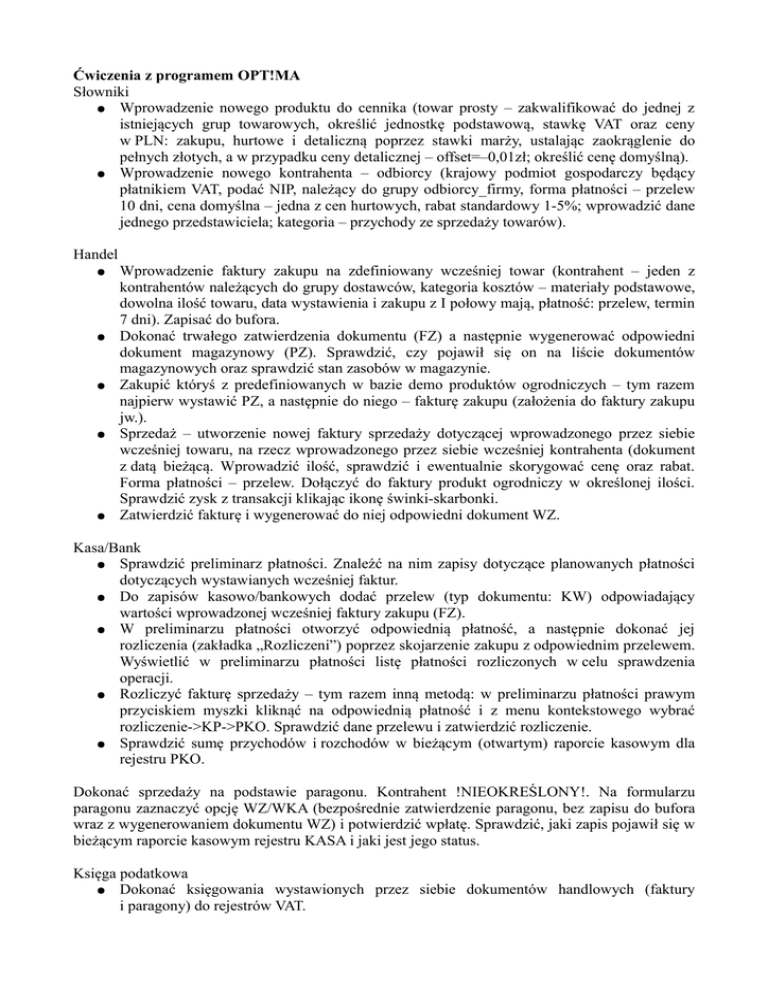 Ćwiczenia z programem OPT!MA Słowniki ● Wprowadzenie nowego produktu do cennika (towar prosty – zakwalifikować do jednej z istniejących grup towarowych, określić jednostkę podstawową, stawkę VAT oraz ceny w PLN: zakupu, hurtowe i detaliczną poprzez stawki marży, ustalając zaokrąglenie do pełnych złotych, a w przypadku ceny detalicznej – offset=–0,01zł; określić cenę domyślną). ● Wprowadzenie nowego kontrahenta – odbiorcy (krajowy podmiot gospodarczy będący płatnikiem VAT, podać NIP, należący do grupy odbiorcy_firmy, forma płatności – przelew 10 dni, cena domyślna – jedna z cen hurtowych, rabat standardowy 1-5%; wprowadzić dane jednego przedstawiciela; kategoria – przychody ze sprzedaży towarów). Handel ● ● ● ● ● Wprowadzenie faktury zakupu na zdefiniowany wcześniej towar (kontrahent – jeden z kontrahentów należących do grupy dostawców, kategoria kosztów – materiały podstawowe, dowolna ilość towaru, data wystawienia i zakupu z I połowy mają, płatność: przelew, termin 7 dni). Zapisać do bufora. Dokonać trwałego zatwierdzenia dokumentu (FZ) a następnie wygenerować odpowiedni dokument magazynowy (PZ). Sprawdzić, czy pojawił się on na liście dokumentów magazynowych oraz sprawdzić stan zasobów w magazynie. Zakupić któryś z predefiniowanych w bazie demo produktów ogrodniczych – tym razem najpierw wystawić PZ, a następnie do niego – fakturę zakupu (założenia do faktury zakupu jw.). Sprzedaż – utworzenie nowej faktury sprzedaży dotyczącej wprowadzonego przez siebie wcześniej towaru, na rzecz wprowadzonego przez siebie wcześniej kontrahenta (dokument z datą bieżącą. Wprowadzić ilość, sprawdzić i ewentualnie skorygować cenę oraz rabat. Forma płatności – przelew. Dołączyć do faktury produkt ogrodniczy w określonej ilości. Sprawdzić zysk z transakcji klikając ikonę świnki-skarbonki. Zatwierdzić fakturę i wygenerować do niej odpowiedni dokument WZ. Kasa/Bank ● Sprawdzić preliminarz płatności. Znaleźć na nim zapisy dotyczące planowanych płatności dotyczących wystawianych wcześniej faktur. ● Do zapisów kasowo/bankowych dodać przelew (typ dokumentu: KW) odpowiadający wartości wprowadzonej wcześniej faktury zakupu (FZ). ● W preliminarzu płatności otworzyć odpowiednią płatność, a następnie dokonać jej rozliczenia (zakładka „Rozliczeni”) poprzez skojarzenie zakupu z odpowiednim przelewem. Wyświetlić w preliminarzu płatności listę płatności rozliczonych w celu sprawdzenia operacji. ● Rozliczyć fakturę sprzedaży – tym razem inną metodą: w preliminarzu płatności prawym przyciskiem myszki kliknąć na odpowiednią płatność i z menu kontekstowego wybrać rozliczenie->KP->PKO. Sprawdzić dane przelewu i zatwierdzić rozliczenie. ● Sprawdzić sumę przychodów i rozchodów w bieżącym (otwartym) raporcie kasowym dla rejestru PKO. Dokonać sprzedaży na podstawie paragonu. Kontrahent !NIEOKREŚLONY!. Na formularzu paragonu zaznaczyć opcję WZ/WKA (bezpośrednie zatwierdzenie paragonu, bez zapisu do bufora wraz z wygenerowaniem dokumentu WZ) i potwierdzić wpłatę. Sprawdzić, jaki zapis pojawił się w bieżącym raporcie kasowym rejestru KASA i jaki jest jego status. Księga podatkowa ● Dokonać księgowania wystawionych przez siebie dokumentów handlowych (faktury i paragony) do rejestrów VAT. ● ● Zaksięgować zapisy z rejestrów VAT do Księgi Przychodów i Rozchodów. Poprzez Księgowość/Księga Podatkowa/Zapisy KPiR dokonać bezpośredniego wpisu do KPiR – spłata odsetek (dowolna kwota) na rzecz banku (bank wybrać z listy banków) – zakwalifokować jako koszty pozostałe. Analizy ● Sprawdzić aktualny bilans firmy. ● Utworzyć wykresy sprzedaży według kontrahentów. Sprawdzić sumy marż dla poszczególnych kontrahentów. ● Utworzyć wykres sprzedaży według grup towarowych. Dokonać eksportu wyników sprzedaży do arkusza MS Excel. ● Sprawdzić stan środków pieniężnych na poszczególnych rejestrach kasowo/bankowych. Uwzględnić niezamknięte raporty kasowe.